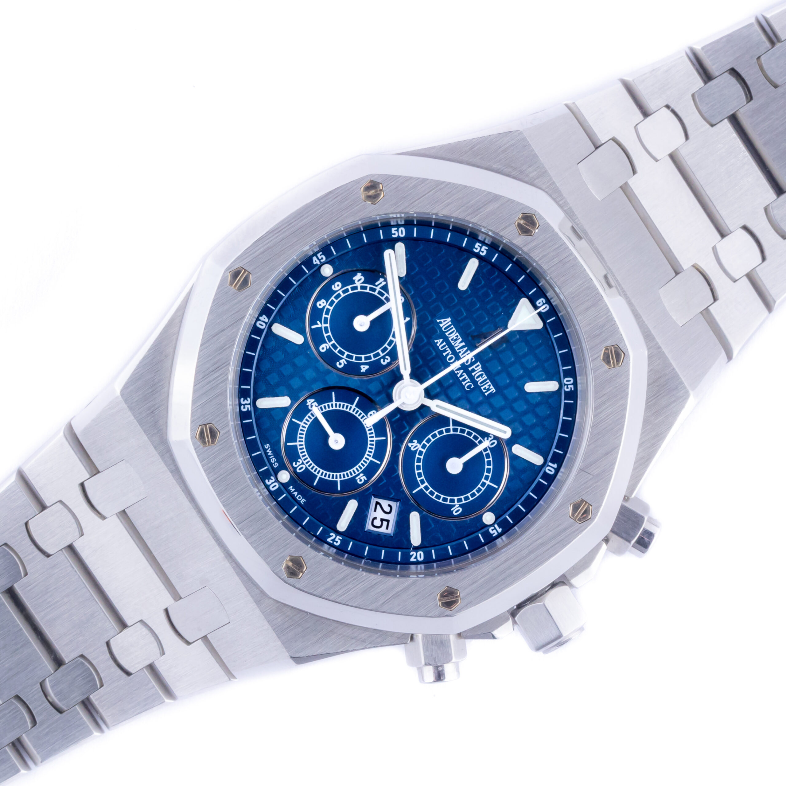 Die Audemars Piguet Reference 25860ST kombiniert nahtlos das ikonische Royal Oak Design mit präziser Chronographenfunktionalität. Mit einem 39-mm-Edelstahlgehäuse und einem entspiegelten Saphirglas bietet dieser Zeitmesser sowohl Stil als auch Haltbarkeit. Das schöne blaue Zifferblatt zeigt ein Grande-Tapisserie-Muster mit drei Hilfszifferblättern, einem Datumsfenster und weißgoldenen Leuchtindexen und -zeigern.