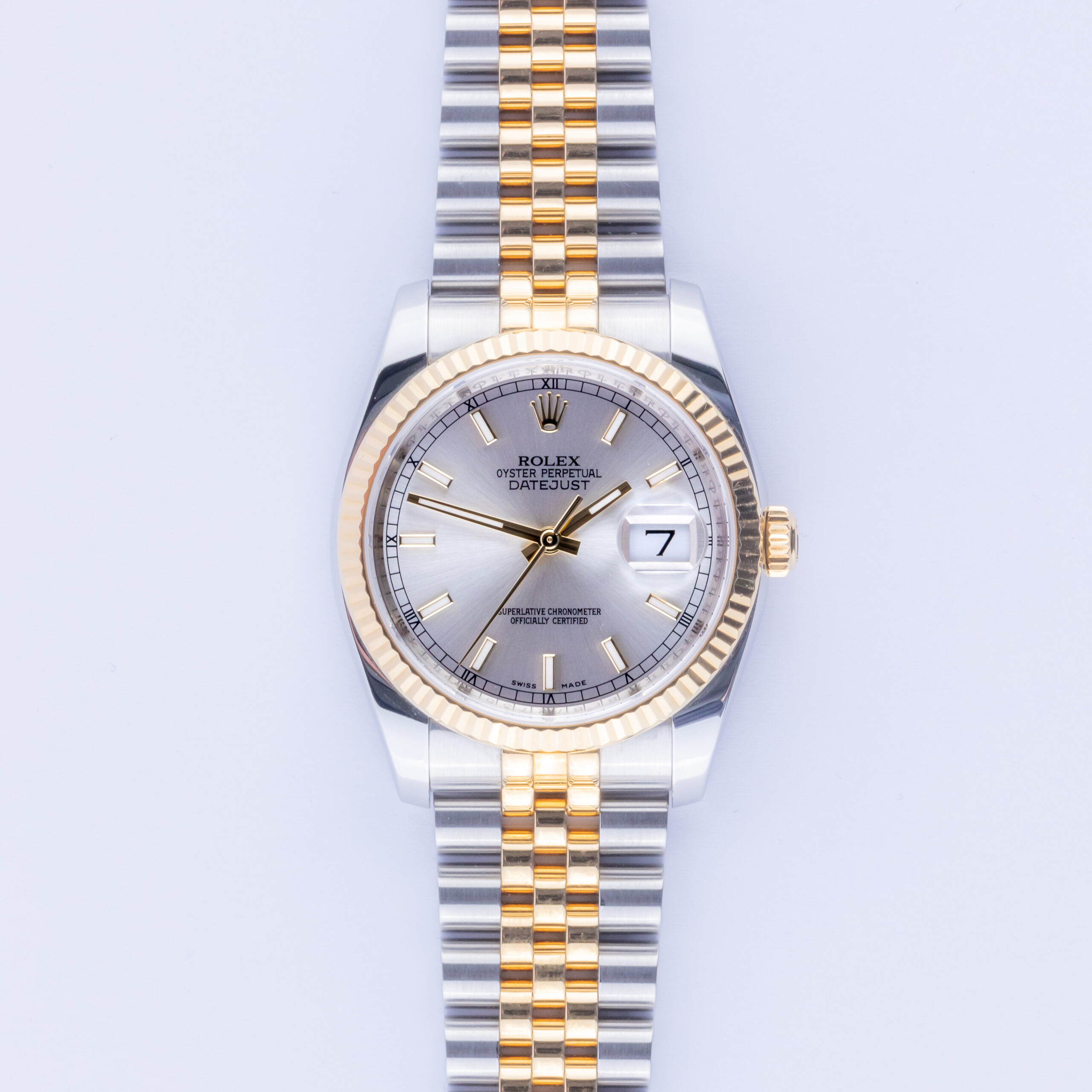 Rolex Oyster Perpetual Datejust Referenz 116233 aus dem Jahr 2015 einschließlich voller Satz. Die Datejust 116233 misst eine 36mm Gold und Edelstahl Gehäuse, eine zweifarbige Jubilee Armband mit Kronenverschluss und kannelierte 18k Gold Lünette. Diese Datejust 116233 verfügt über ein Automatikwerk Kaliber 3135 mit Quickset-Datum-Funktion, ein kratzfestes Saphirglas und ein silberfarbenes Stick-Zifferblatt mit Chromalight-Anzeige.