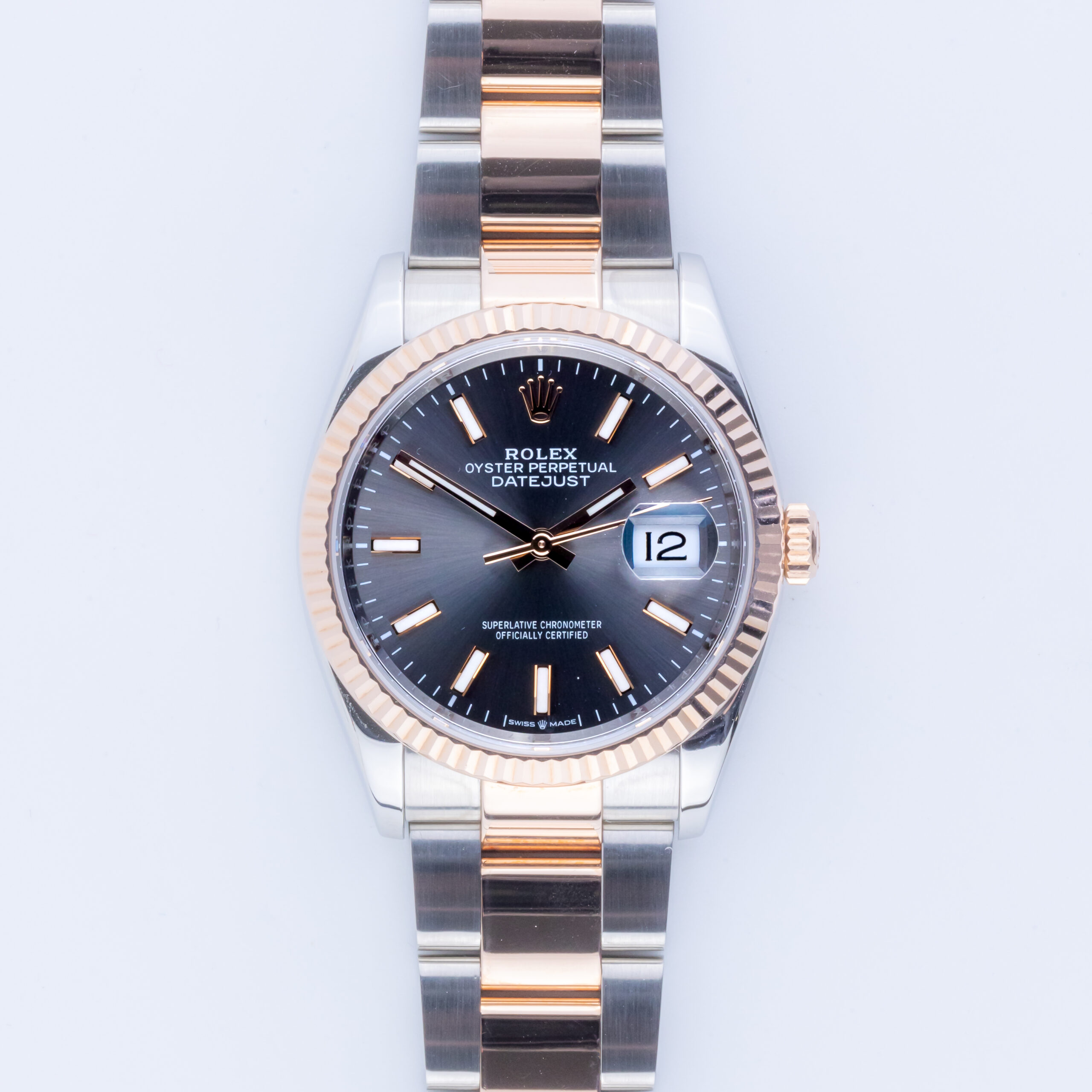 Rolex Oyster Perpetual Datejust Referenz 126231 aus dem Jahr 2021 mit komplettem Set. Die Datejust 126231 misst ein 36-mm-Edelstahlgehäuse, ein Roségold/Edelstahl-Jubilee-Armband mit Oysterclasp und eine Roségold geriffelte Lünette. Diese Datejust 126231 verfügt über ein Automatikwerk Kaliber 3235 mit Quickset-Datum-Funktion, kratzfestes Saphirglas und ein Schiefer-Zifferblatt mit Chromalight-Index. Auf jede gebrauchte Uhr, die wir verkaufen, gewähren wir 12 Monate Garantie ab Kaufdatum. Jede von Langedyk Vintage Watches verkaufte Uhr wird mit einer LVW-Uhrenbox, einem Echtheitsbericht und einem kostenlosen weltweiten (versicherten) Versand geliefert.