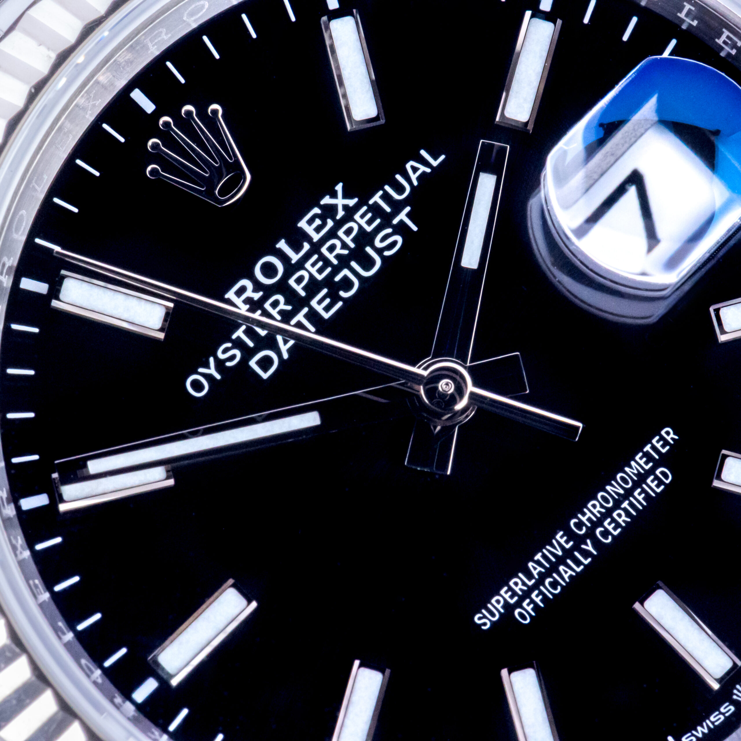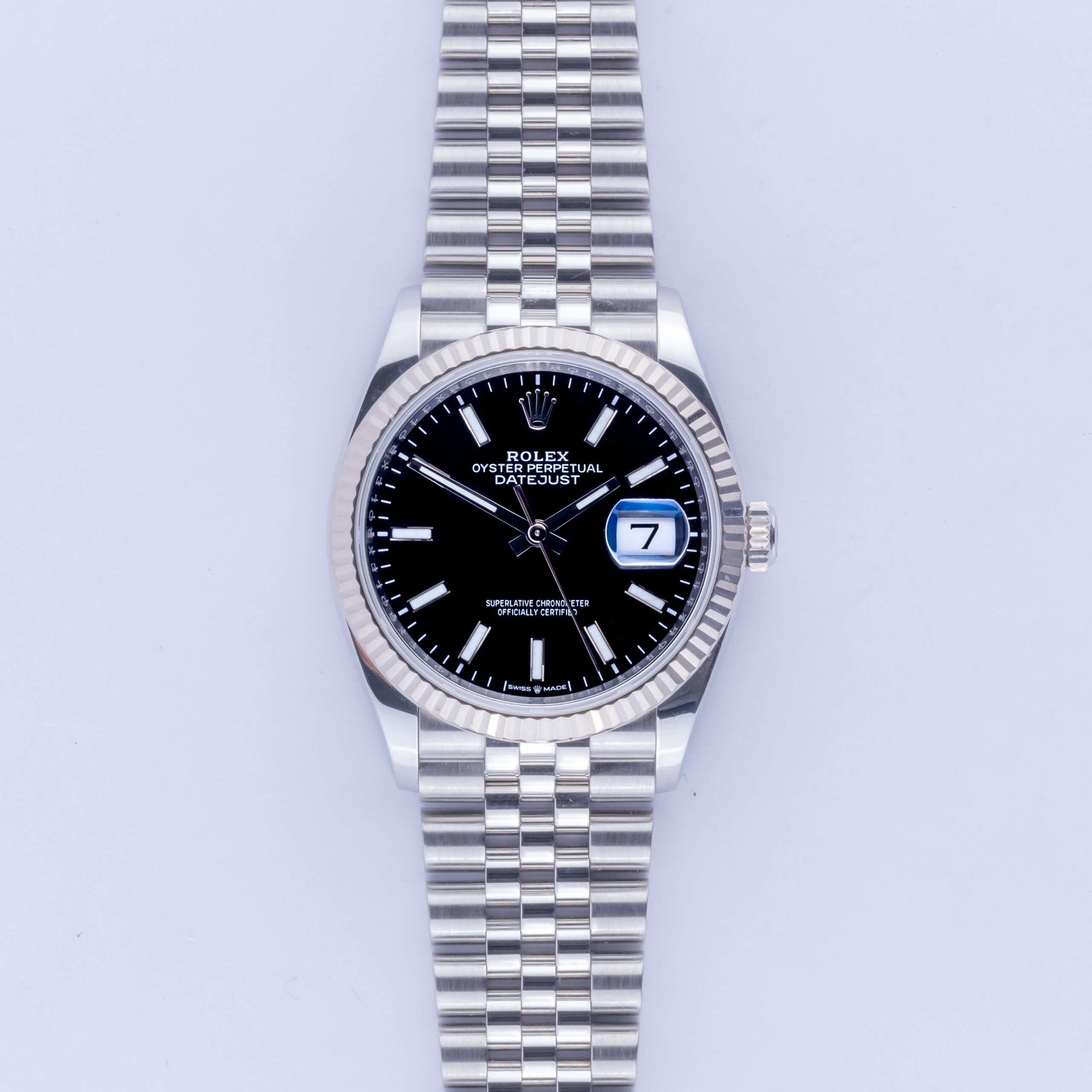 Rolex Oyster Perpetual Datejust Referenz 126234 aus dem Jahr 2021 mit komplettem Set. Die Datejust 126234 misst ein 36-mm-Edelstahlgehäuse, ein Edelstahl-Jubiläumsarmband mit Oysterclasp und eine 18k Weißgold kannelierte Lünette. Die Datejust 126234 verfügt über ein Automatikwerk Kaliber 3235 mit Schnellverstellung des Datums, kratzfestes Saphirglas und ein schwarzes Zifferblatt mit Chromalight-Zeigern und -Indizes.