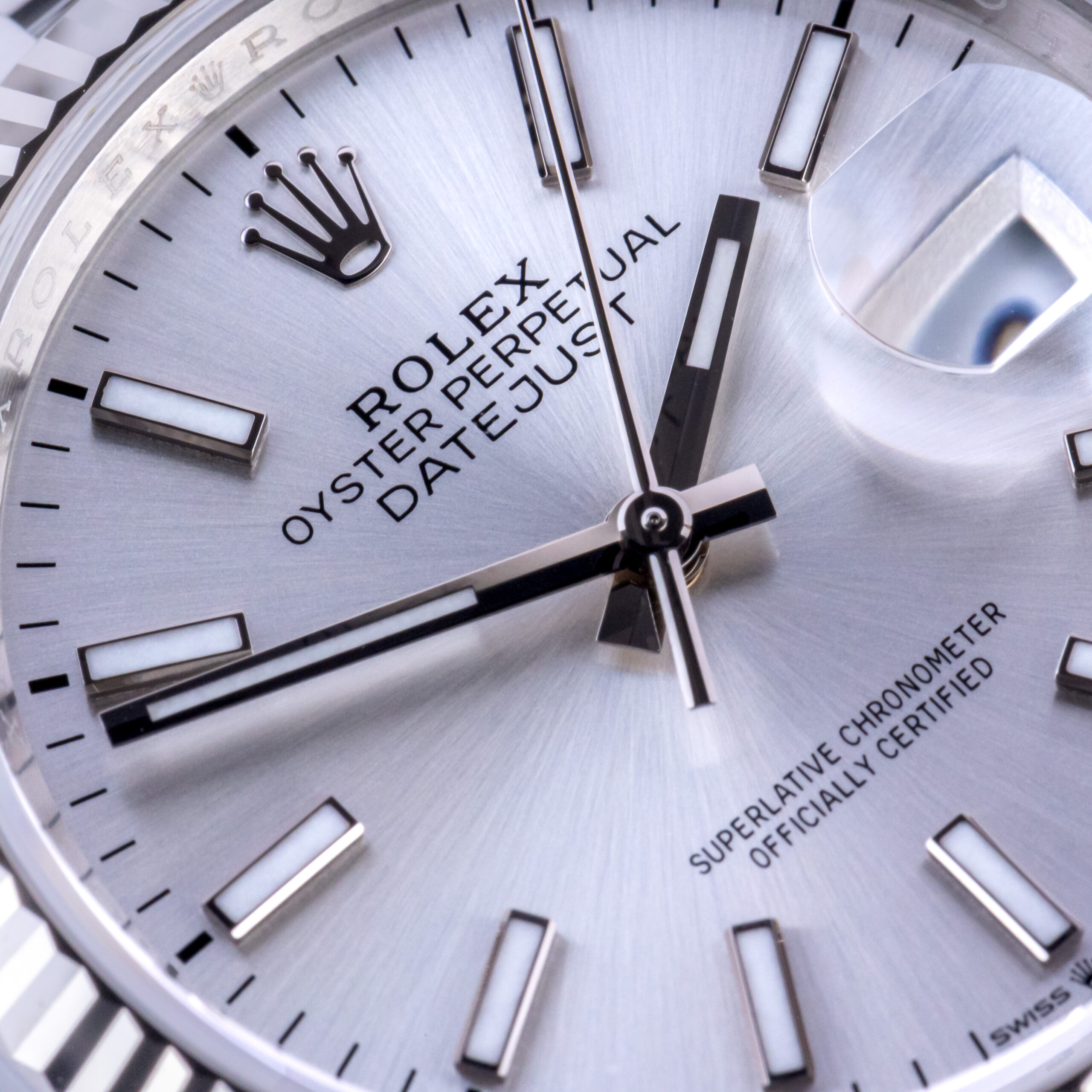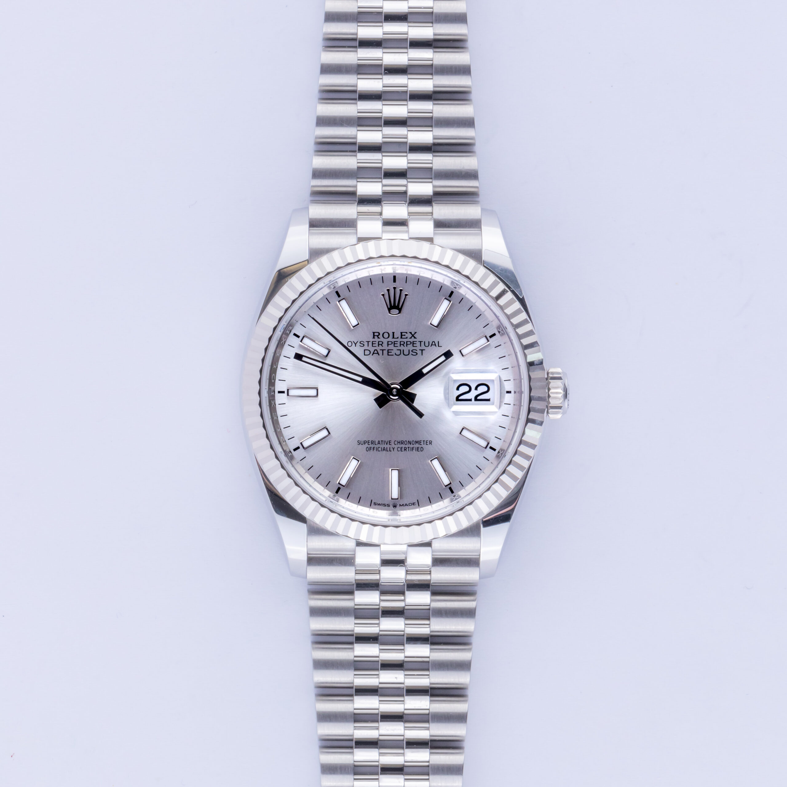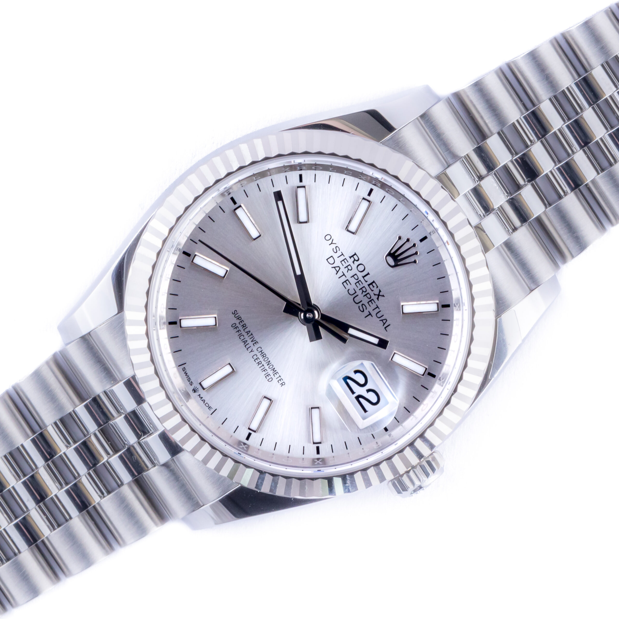 Rolex Oyster Perpetual Datejust Referenz 126234 aus dem Jahr 2024 mit komplettem Set. Die Datejust 126234 misst ein 36-mm-Edelstahlgehäuse, ein Edelstahl-Jubiläumsarmband mit Oysterclasp und eine 18k Weißgold geriffelte Lünette. Diese Datejust 126234 verfügt über ein Automatikwerk Kaliber 3235 mit Quickset Datum Funktion, Kratzfestigkeit Saphirglas und ein silbernes Zifferblatt mit Chromalight Zeiger und Markierungen.