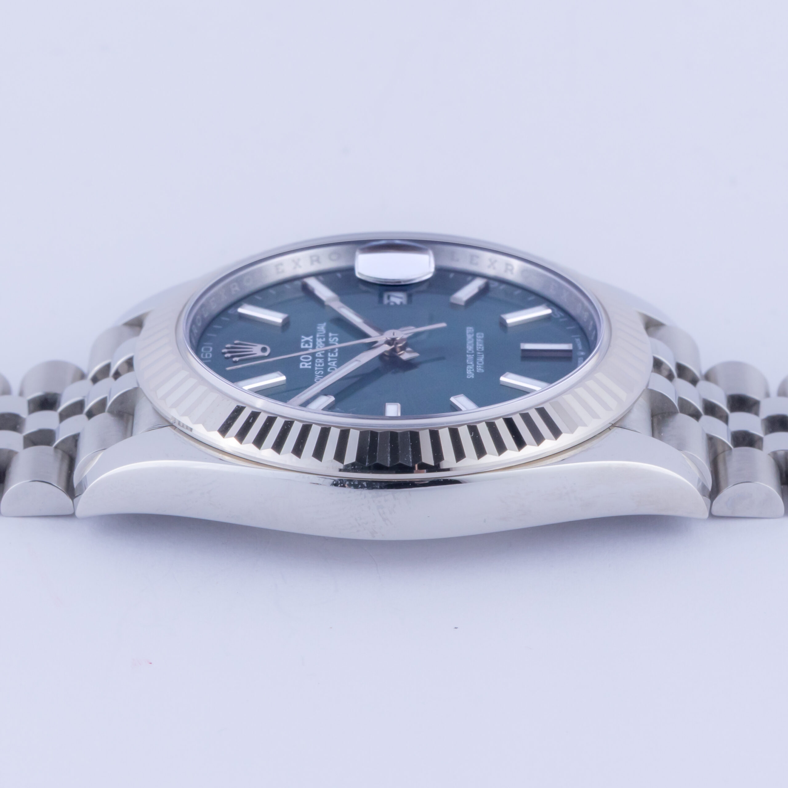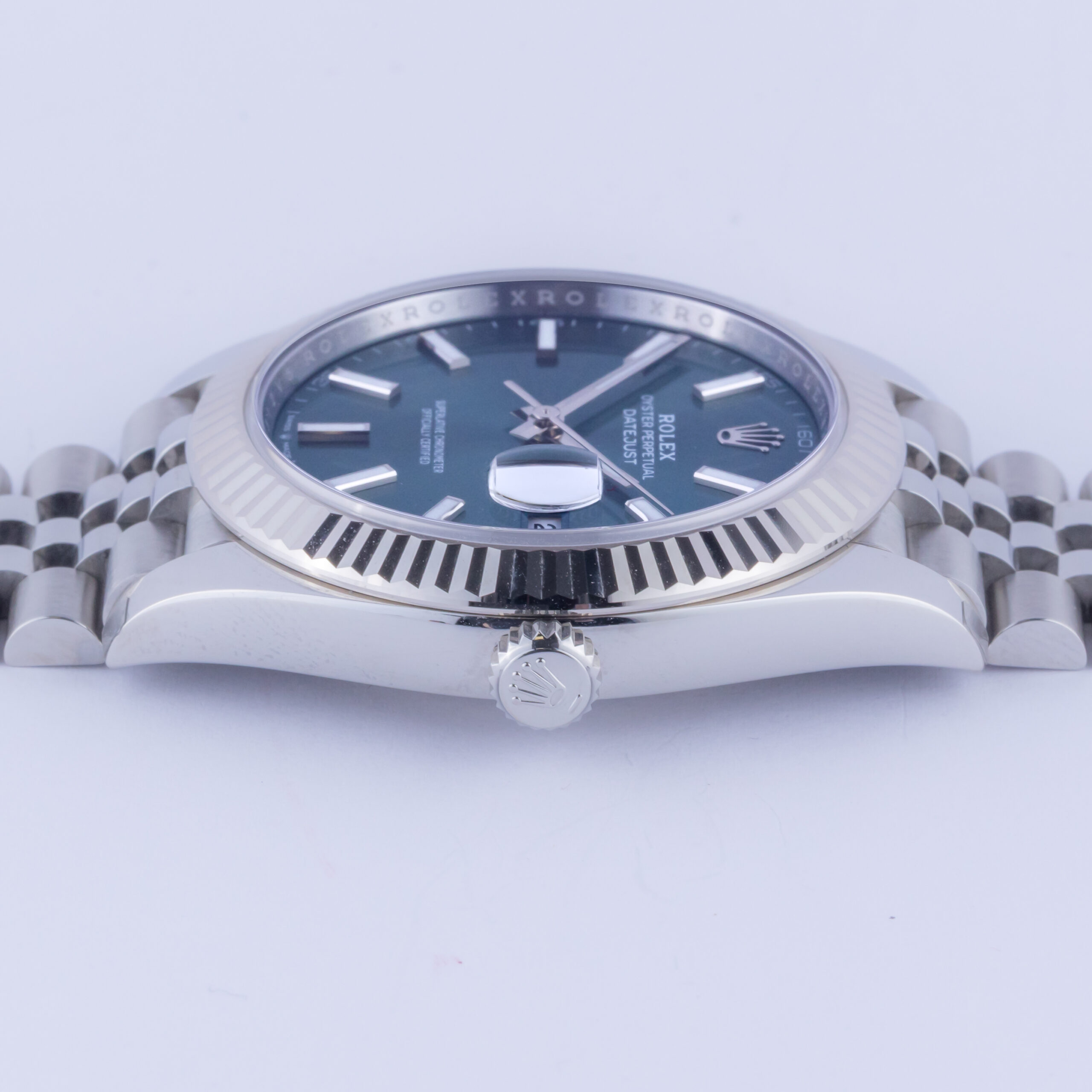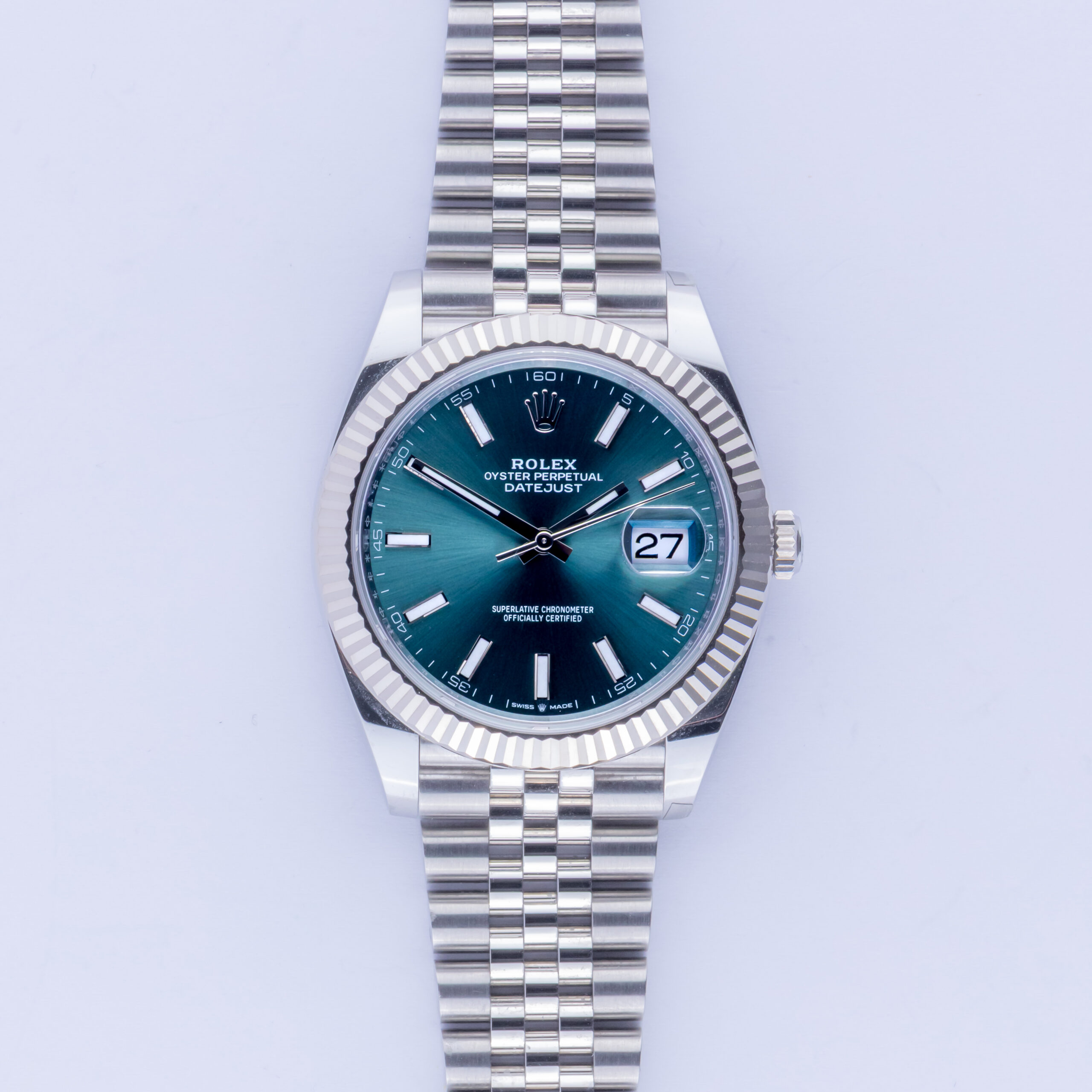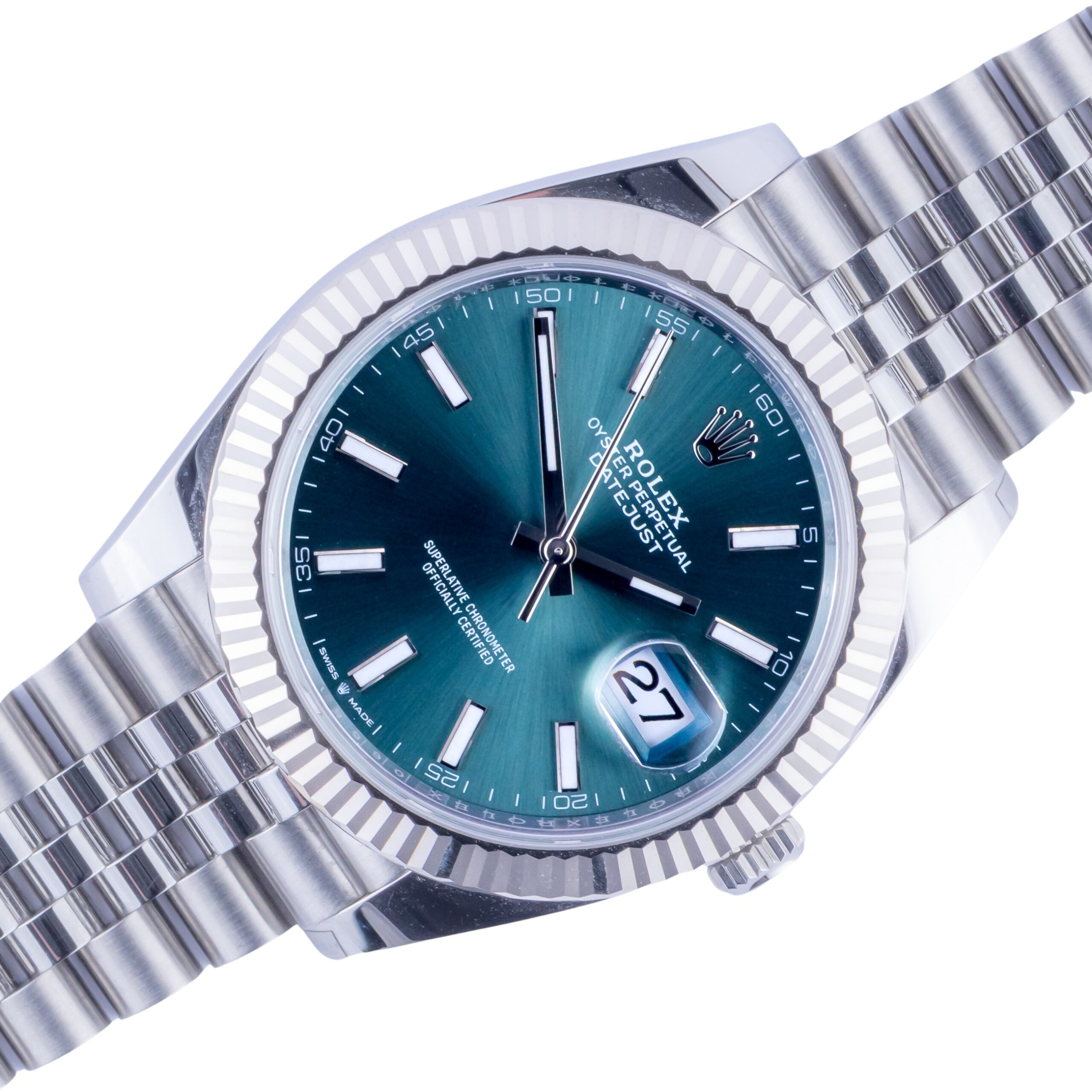 Rolex Oyster Perpetual Datejust Referenz 126334 aus dem Jahr 2024 inklusive komplettem Set. Die Datejust 126334 misst ein 41-mm-Edelstahlgehäuse, ein Edelstahl (904L) Jubilee-Armband mit Oysterclasp und eine kannelierte 18K Weißgold-Lünette. Diese Datejust 126334 verfügt über ein Automatikwerk Kaliber 3235 mit einem Quickset-Datum-Funktion, eine Kratzfestigkeit Saphirglas und mintgrünes Zifferblatt.