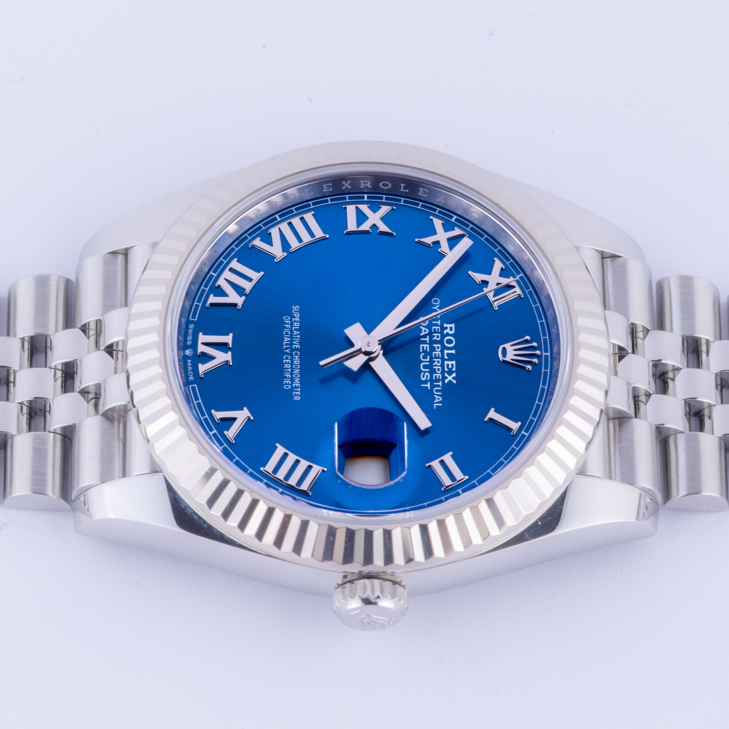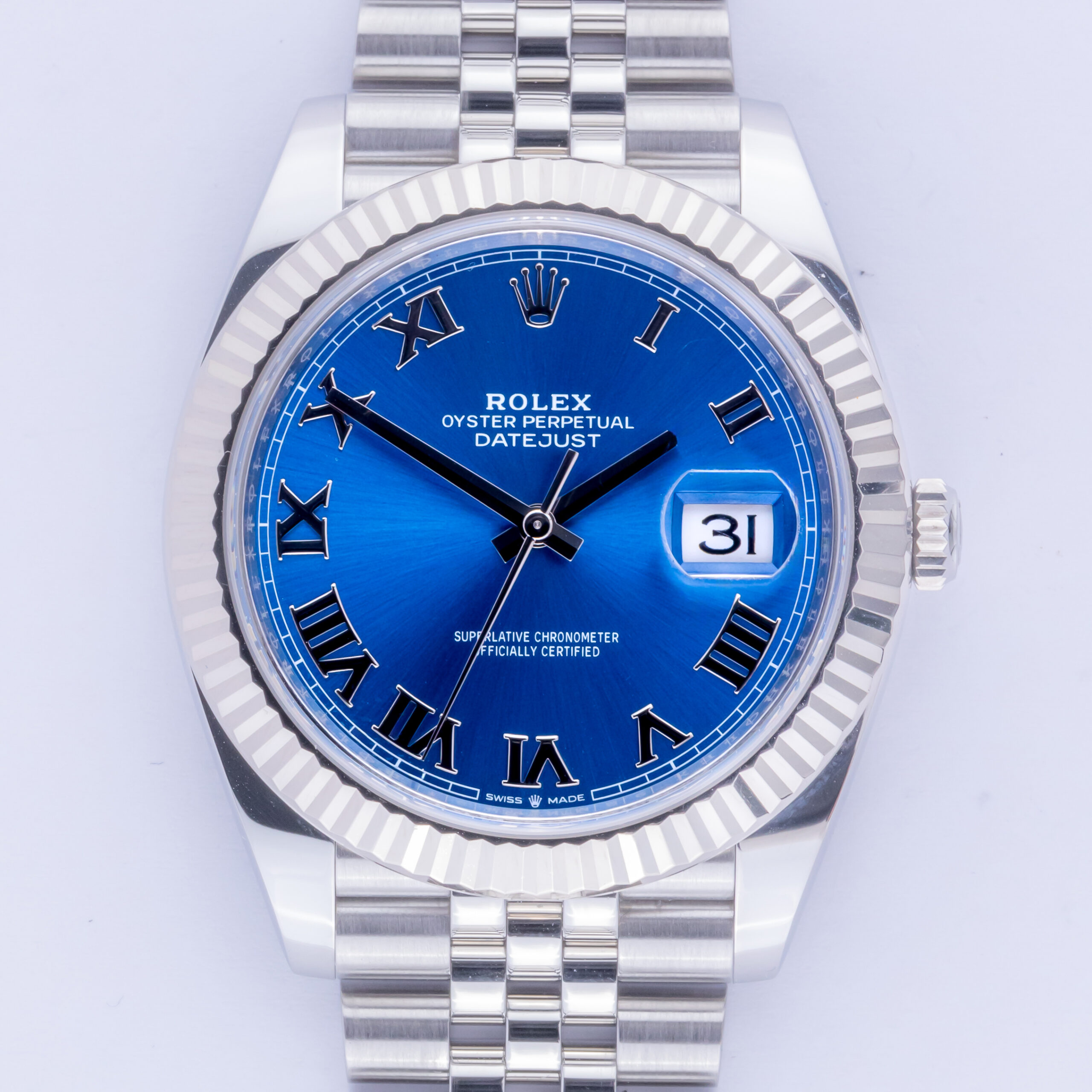 Rolex Oyster Perpetual Datejust Referenz 126334 aus dem Jahr 2024 inklusive komplettem Set. Die Datejust 126334 misst ein 41-mm-Edelstahlgehäuse, ein Edelstahl (904L) Jubilee-Armband mit Oysterclasp und eine kannelierte 18K Weißgold-Lünette. Diese Datejust 126334 verfügt über ein Automatikwerk Kaliber 3235 mit einem Quickset-Datum-Funktion, eine Kratzfestigkeit Saphirglas und Azzurro Zifferblatt.