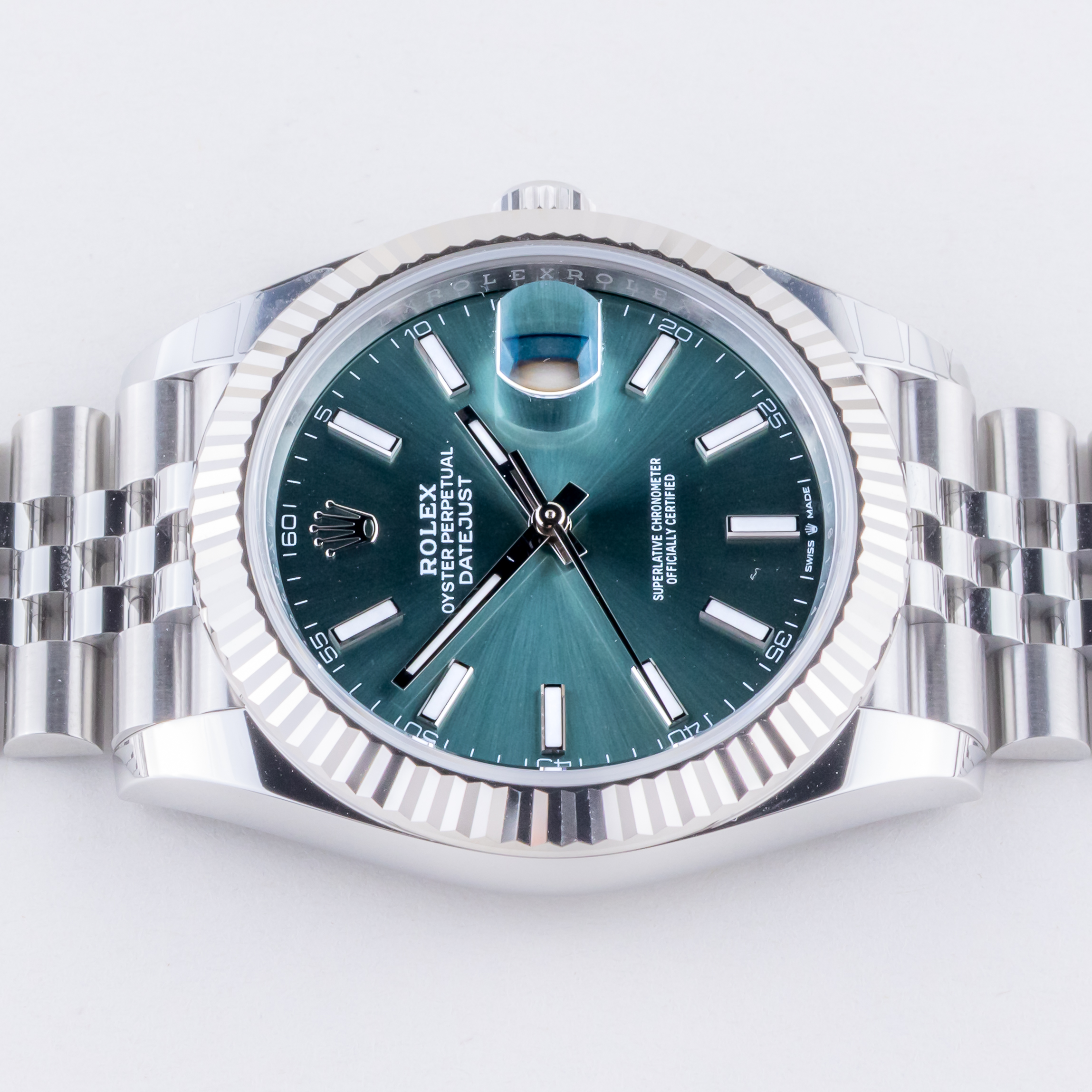 Rolex Oyster Perpetual Datejust Referenz 126334 aus dem Jahr 2025 inklusive komplettem Set. Die Datejust 126334 misst ein 41-mm-Edelstahlgehäuse, ein Edelstahl (904L) Jubilee-Armband mit Oysterclasp und eine kannelierte 18K Weißgold-Lünette. Diese Datejust 126334 verfügt über ein Automatikwerk Kaliber 3235 mit einem Quickset-Datum-Funktion, eine Kratzfestigkeit Saphirglas und mintgrünes Zifferblatt.
