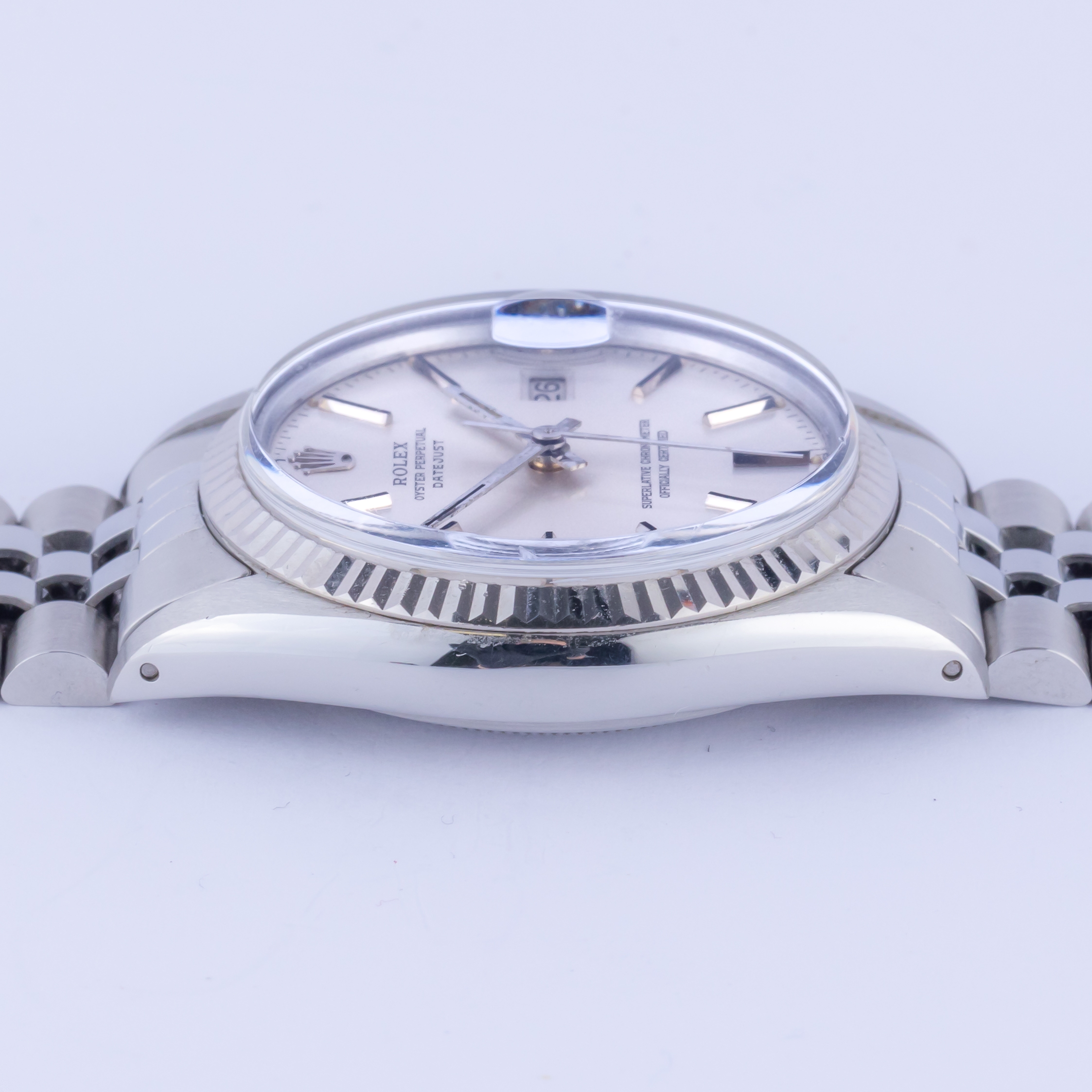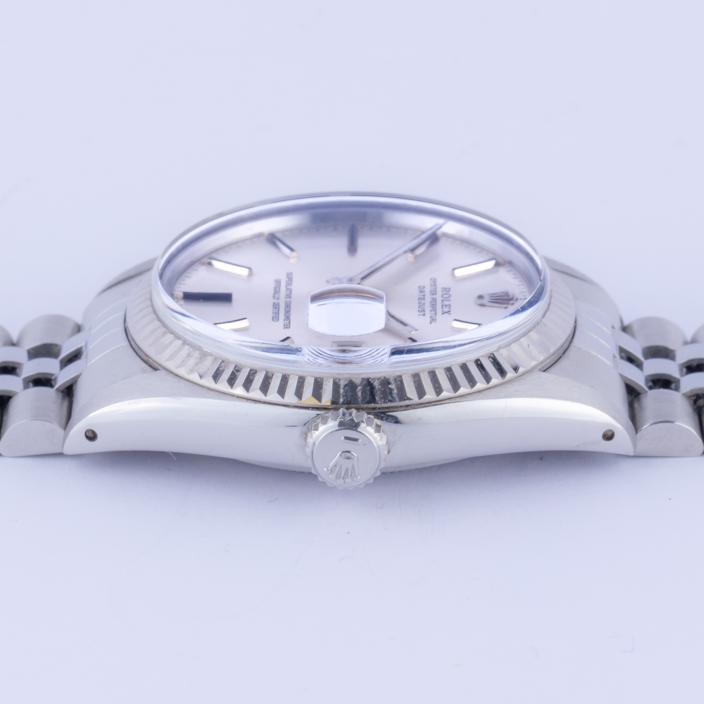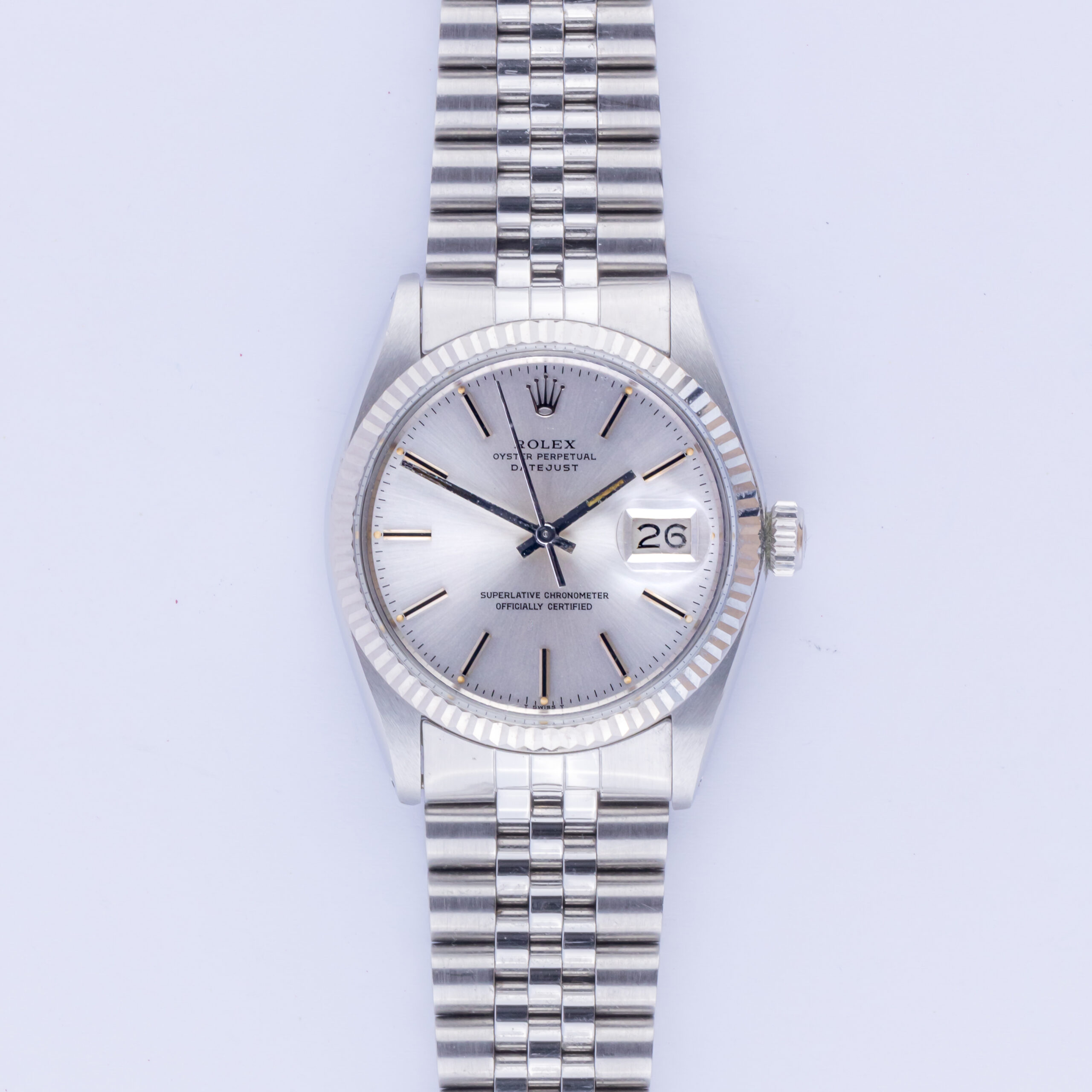Rolex Oyster Perpetual Datejust Referenz 16014 aus dem Jahr 1984 mit komplettem Set. Die Datejust 16014 misst ein 36-mm-Edelstahlgehäuse mit einer 18-karätigen Weißgoldlünette und einem Jubiläumsarmband aus Edelstahl. Die Datejust 16014 verfügt über ein Automatikwerk Kaliber 3035 mit Quickset-Datumsfunktion, ein wasserdichtes Plexiglas und ein silbernes Zifferblatt mit Tritiumzeigern. Jede Uhr, die von Langedyk Vintage Watches verkauft wird, wird mit einer LVW-Uhrenbox, einem Echtheitsbericht und einem kostenlosen weltweiten (versicherten) Versand geliefert. Darüber hinaus gilt für jede gebrauchte Uhr unsere 12-monatige Garantie ab dem Kaufdatum.