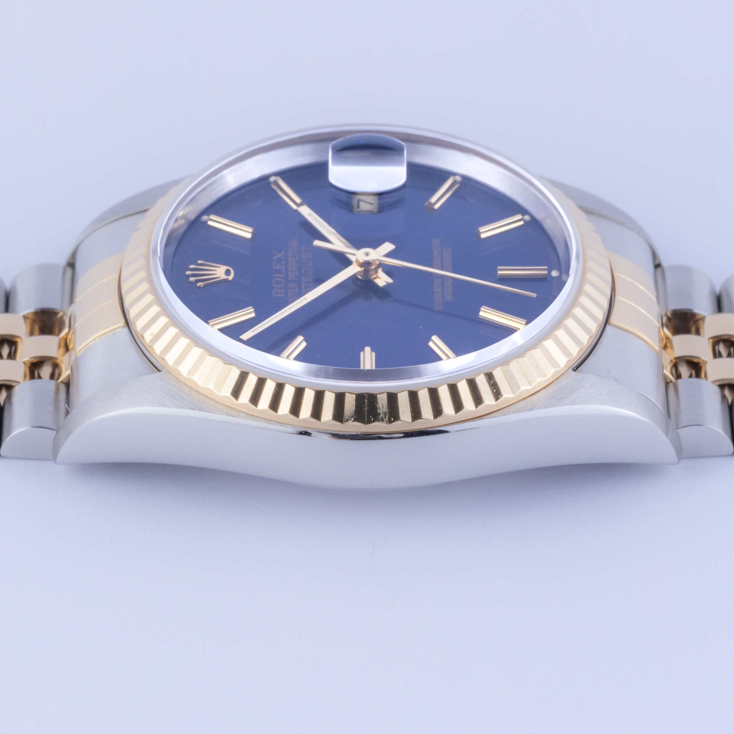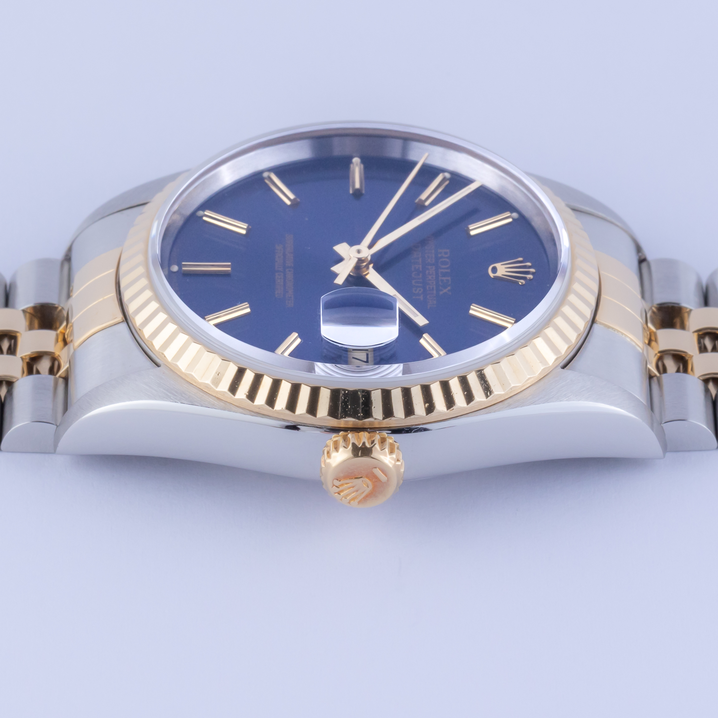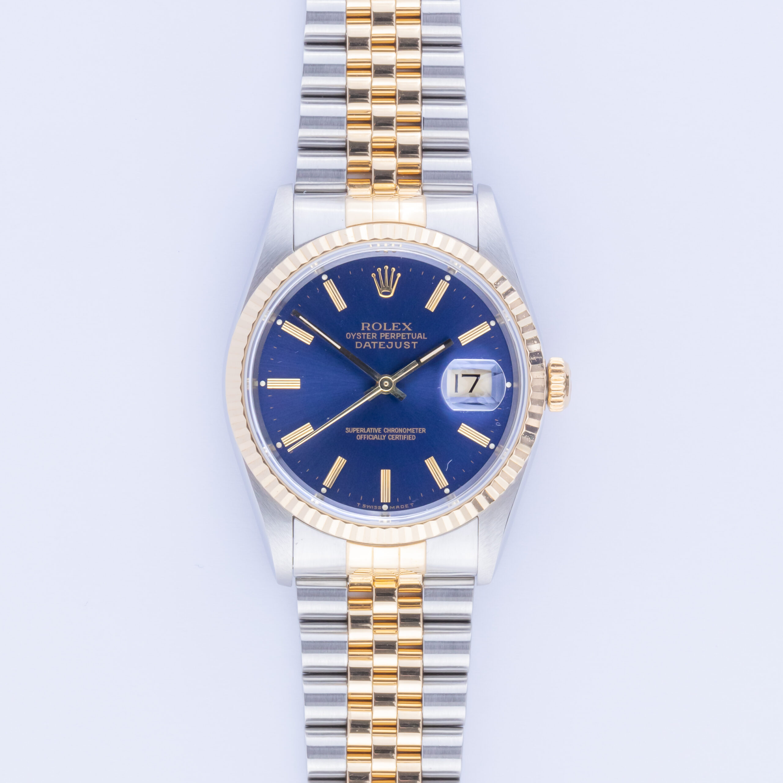 Rolex Oyster Perpetual Datejust Referenz 16233 aus dem Jahr 1995 mit komplettem Set. Die Datejust 16233 misst eine 36mm Gold und Edelstahl Gehäuse, zweifarbige Jubilee Armband und kannelierte 18k Gold Lünette. Diese Datejust 16233 verfügt über ein Automatikwerk Kaliber 3135 mit einem Quickset-Datum-Funktion, eine Kratzfestigkeit Saphirglas und ein blaues Zifferblatt mit Tritium Zeiger.