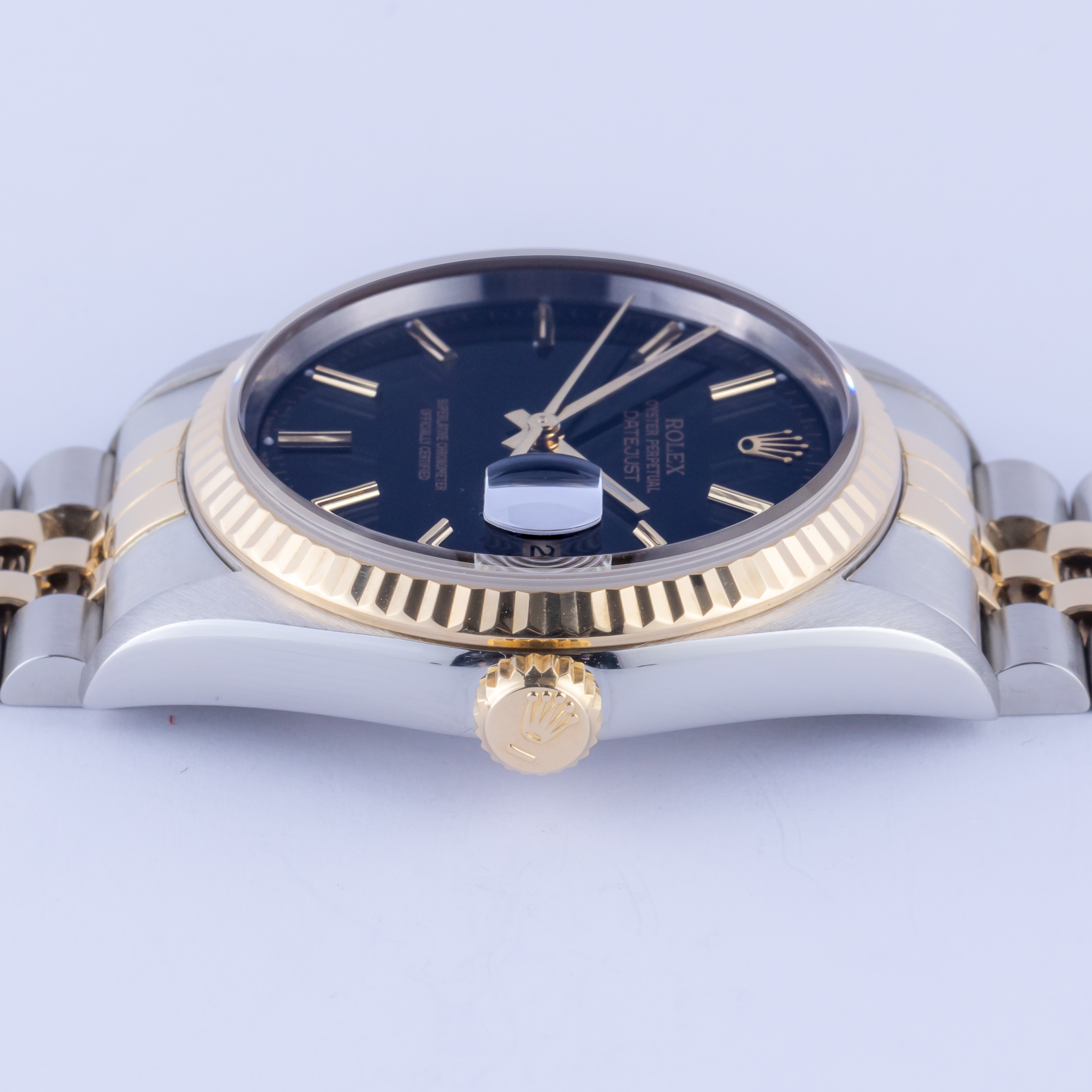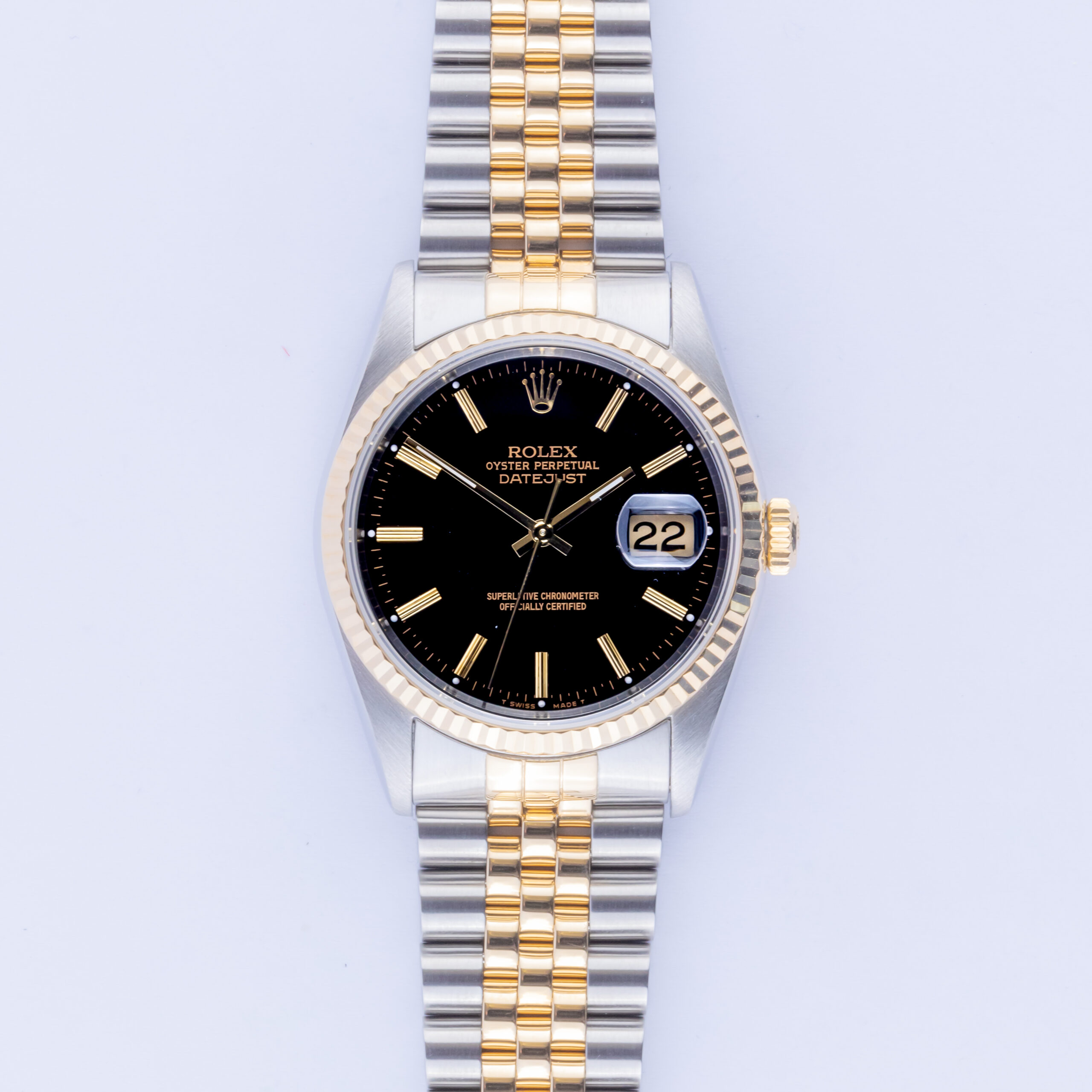 Rolex Oyster Perpetual Datejust Referenz 16233 aus dem Jahr 1995 mit komplettem Set. Die Datejust 16233 misst eine 36mm Gold und Edelstahl Gehäuse, zweifarbige Jubilee Armband und kannelierte 18k Gold Lünette. Diese Datejust 16233 verfügt über ein Automatikwerk Kaliber 3135 mit einem Quickset-Datum-Funktion, eine Kratzfestigkeit Saphirglas und ein schwarzes Zifferblatt mit Tritium Zeiger.
