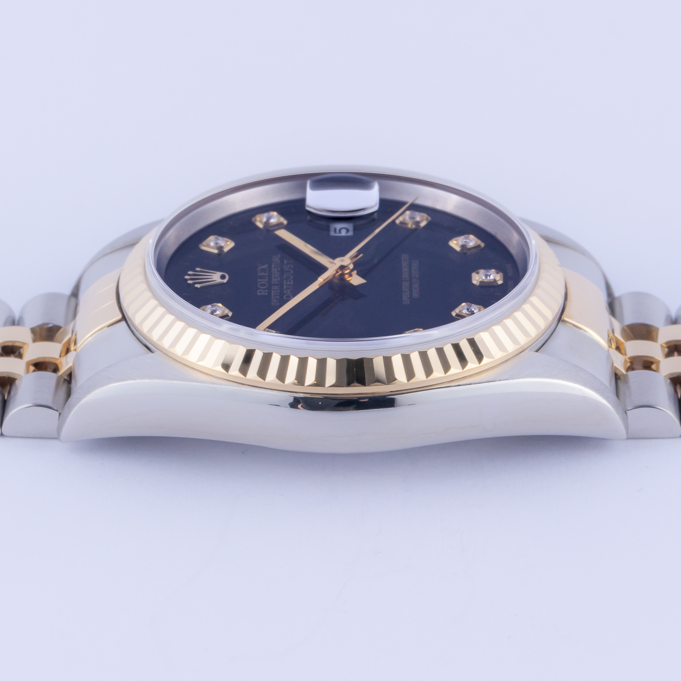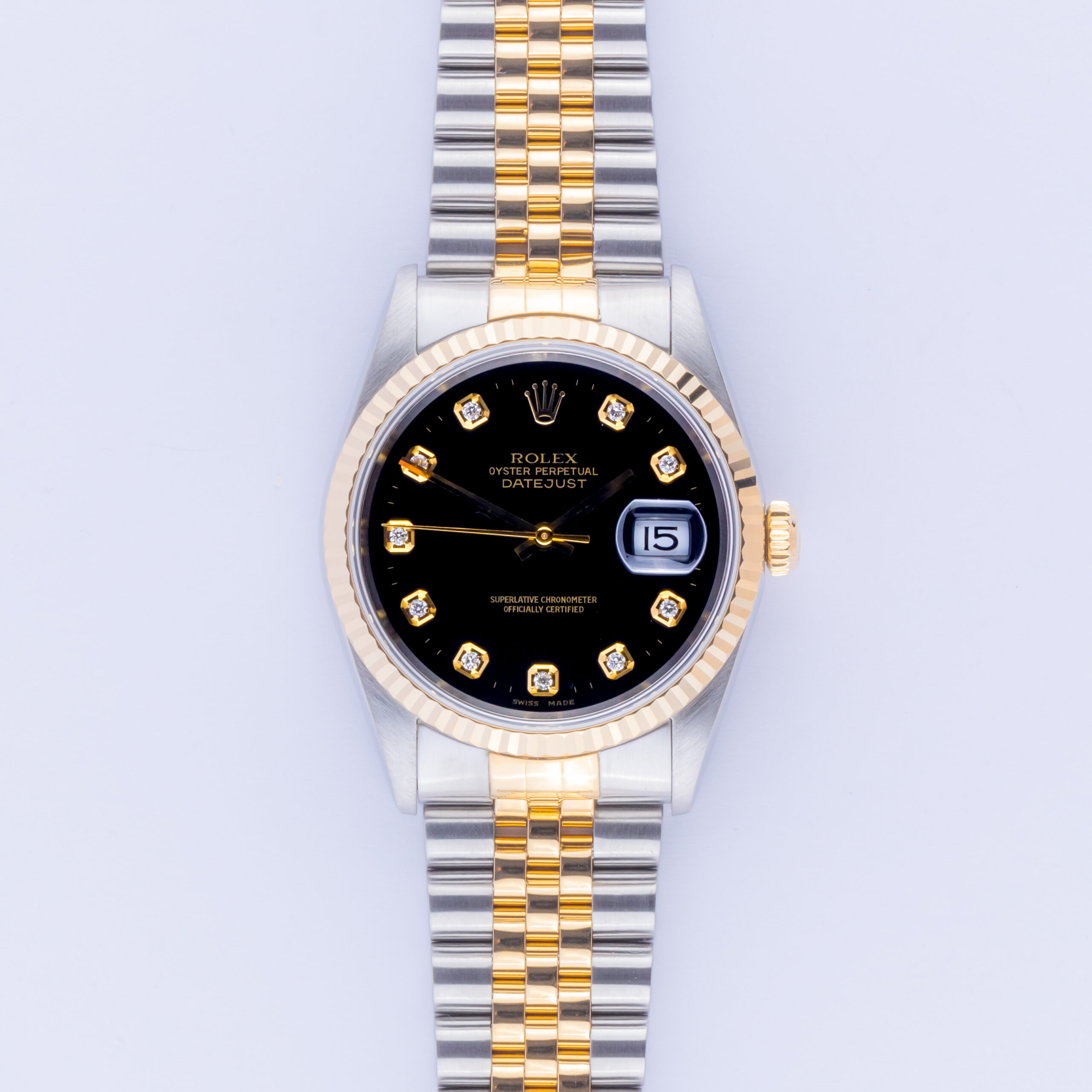 Rolex Oyster Perpetual Datejust Schwarz Diamant 16233 aus dem Jahr 2000 einschließlich voller Satz. Die Datejust 16233 misst eine 36mm Gold und Edelstahl Gehäuse, zweifarbige Jubilee Armband und kannelierte 18k Gold Lünette. Diese Datejust 16233 verfügt über ein Automatikwerk Kaliber 3135 mit einem Quickset-Datum-Funktion, eine Kratzfestigkeit Saphirglas und ein schwarzes Zifferblatt mit Tritium Zeiger und Diamantmarkierungen.