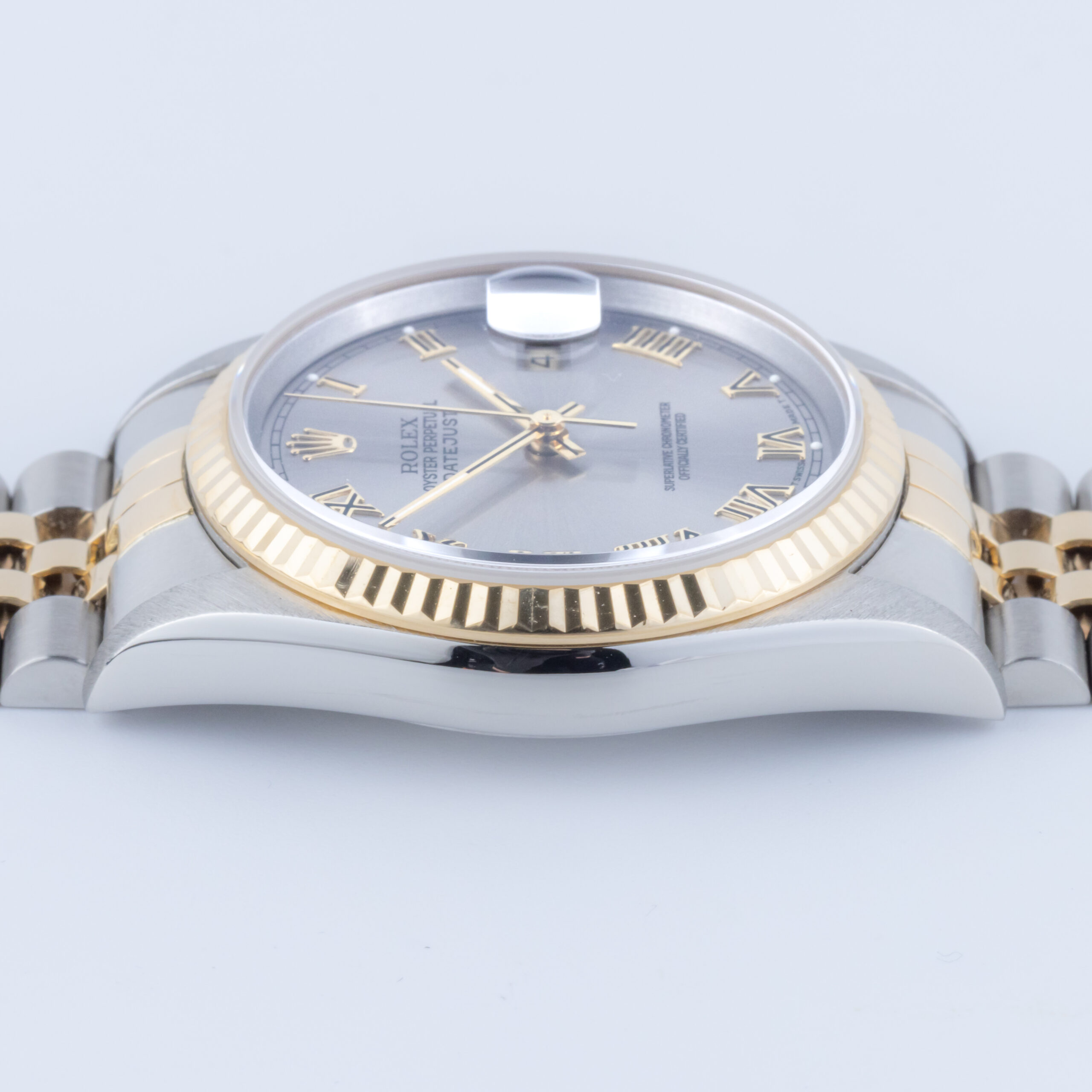 Rolex Oyster Perpetual Datejust Referenz 16233 aus dem Jahr 1995 einschließlich der vollständigen Satz. Die Datejust 16233 misst eine 36mm Gold und Edelstahl Gehäuse, zweifarbige Jubilee Armband und kannelierte 18k Gold Lünette. Diese Datejust 16233 verfügt über ein Automatikwerk Kaliber 3135 mit einem Quickset-Datum-Funktion, eine Kratzfestigkeit Saphirglas und ein graues Zifferblatt mit Tritium Zeiger und römische Markierungen.