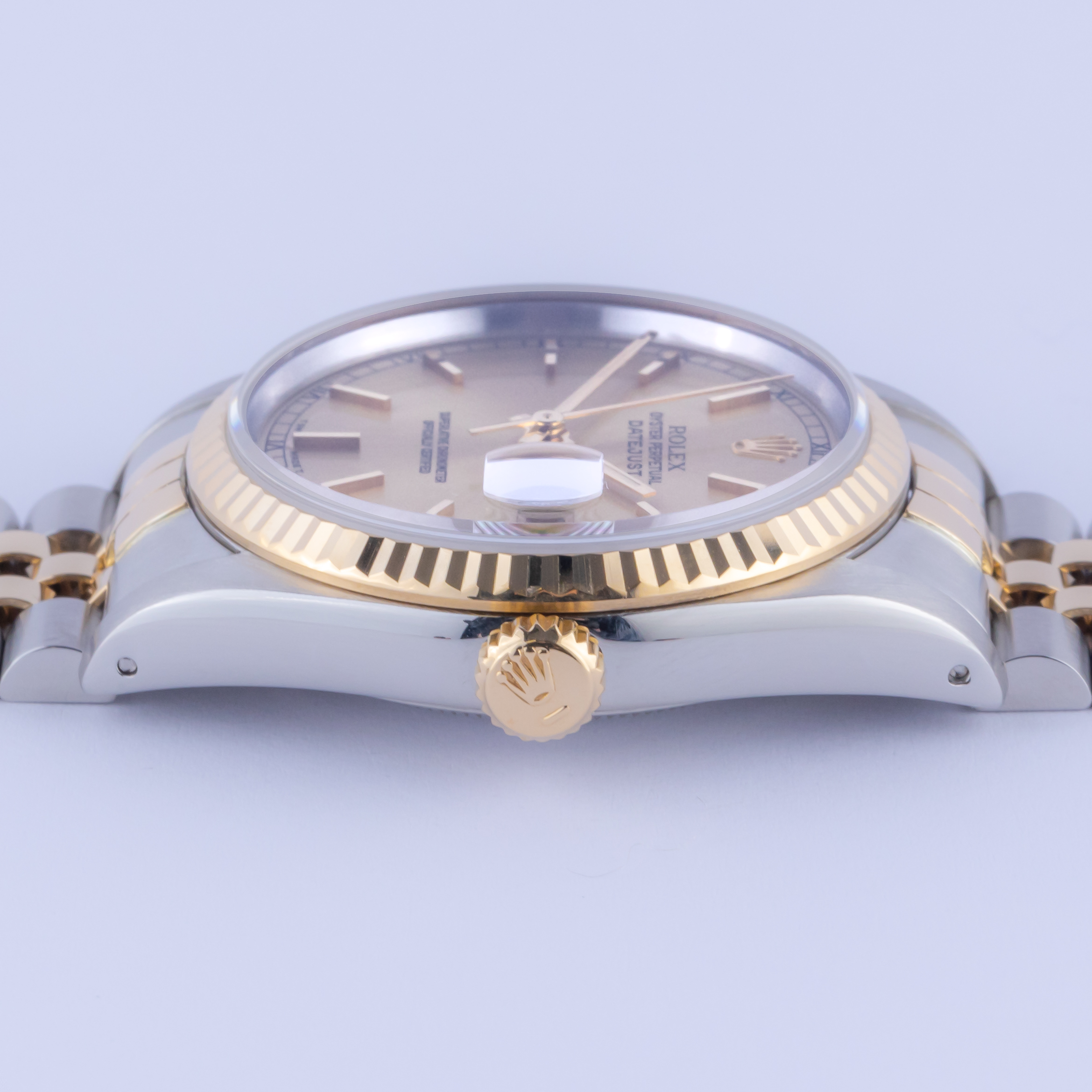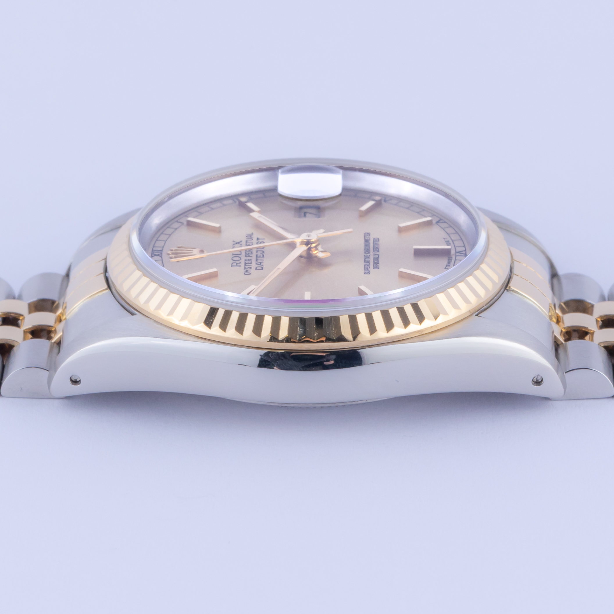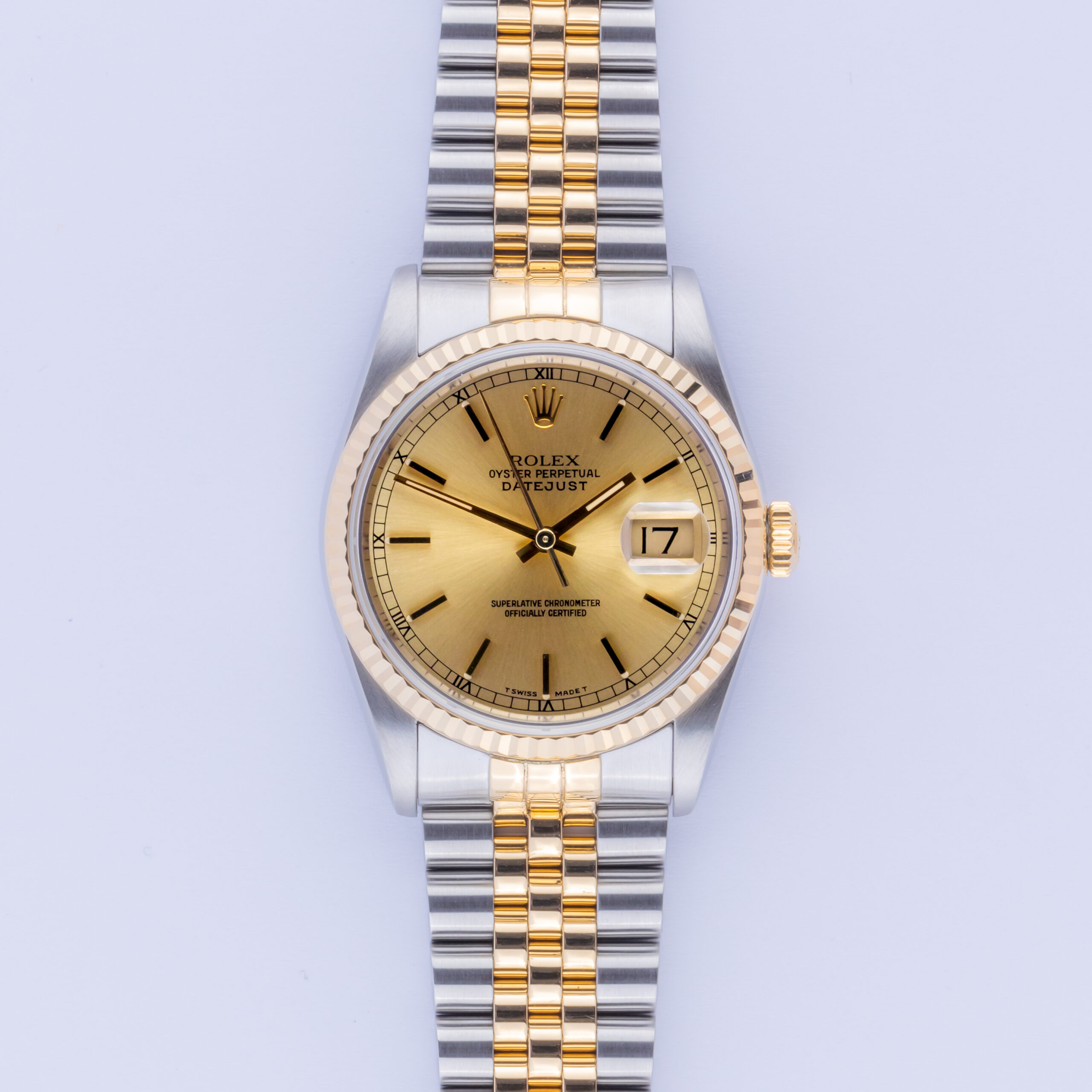 Von der kannelierten Lünette aus 18-karätigem Gold über die 3-Stunden-Datumslupe mit Cyclops-Auge bis hin zur kunstvoll gestalteten Kombination aus Edelstahl und Gelbgold (18-karätig) ist die Rolex Datejust 16233 der wahre Inbegriff der ikonischen Rolex-Uhren. Dieses Modell erschien 1988 zum ersten Mal in den Juwelierläden und wurde mit der neuen Referenznummer 16233″ auf den neuesten Stand der Technik gebracht. Rolex ersetzte zum ersten Mal das übliche Acrylglas und stattete die Datejust mit einem Saphirglas aus, was sie etwas moderner erscheinen lässt.