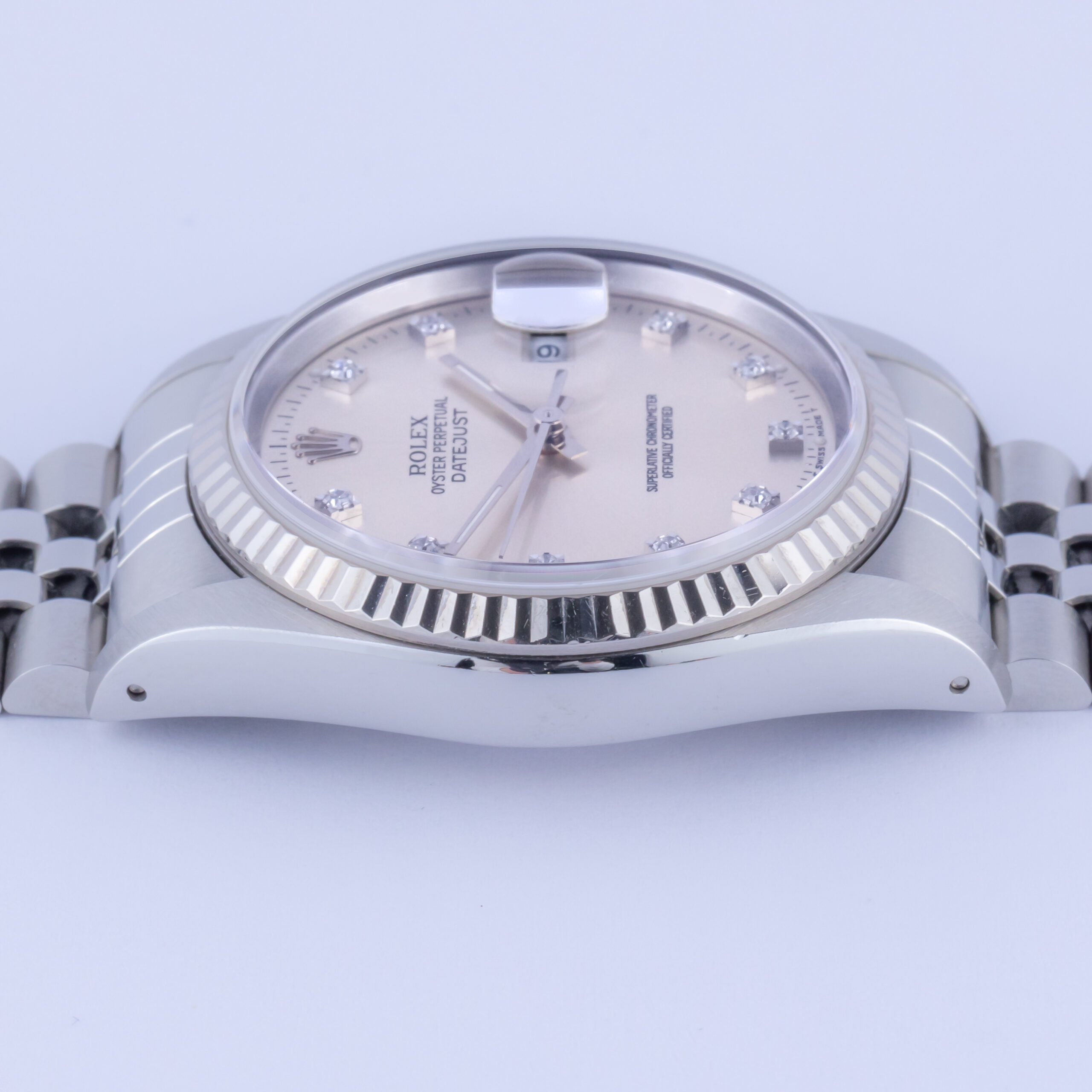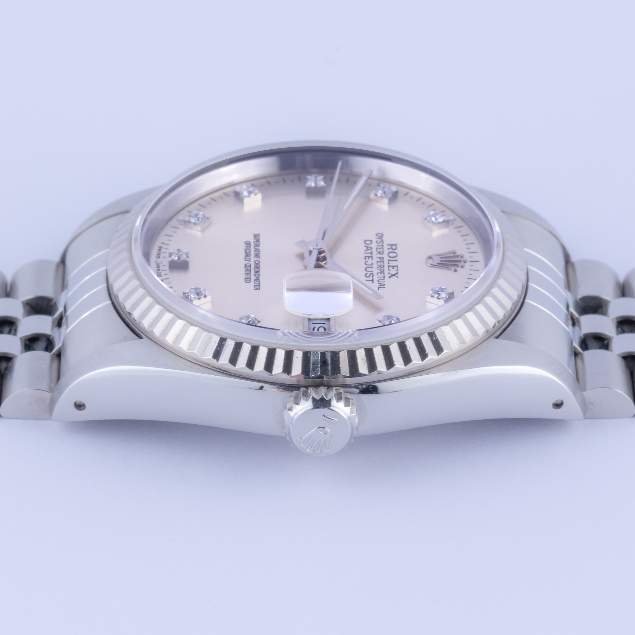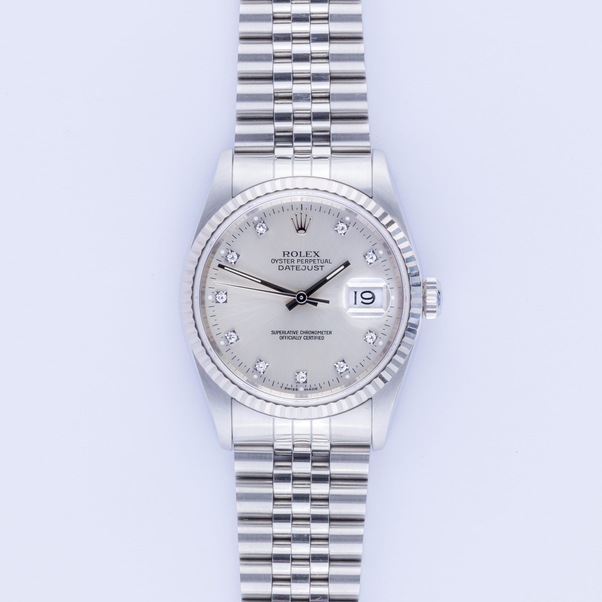 Rolex Oyster Perpetual Datejust Referenz 16234 aus dem Jahr 1991 mit komplettem Set. Die Datejust 16234 Datejust misst ein 36mm Edelstahlgehäuse, ein Edelstahl-Jubiläumsarmband und eine kannelierte 18k Weißgold Lünette. Diese Datejust 16234 verfügt über ein Automatikwerk Kaliber 3135 mit Quickset-Datum-Funktion, ein kratzfestes Saphirglas und ein silbernes Zifferblatt mit Diamantmarkierungen.