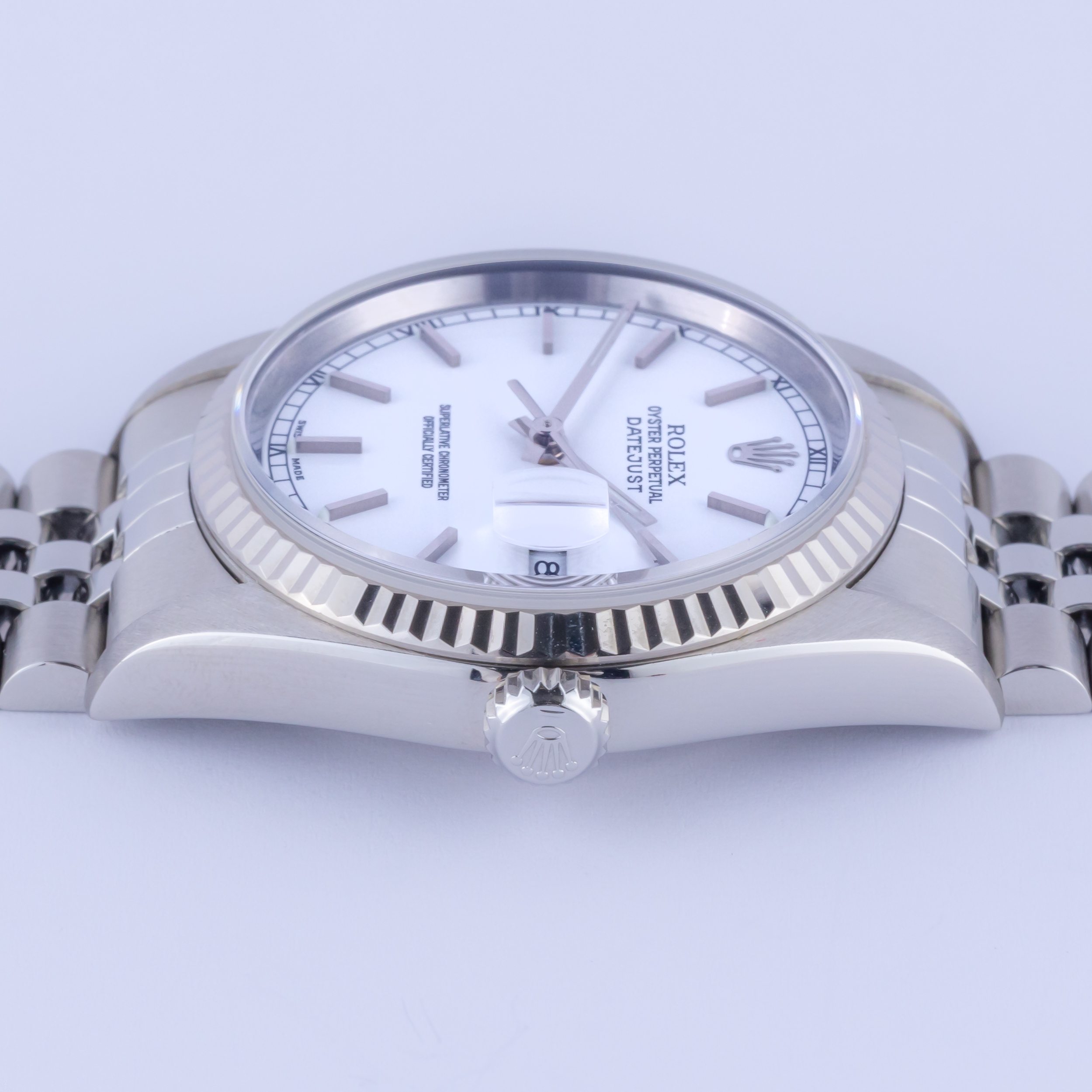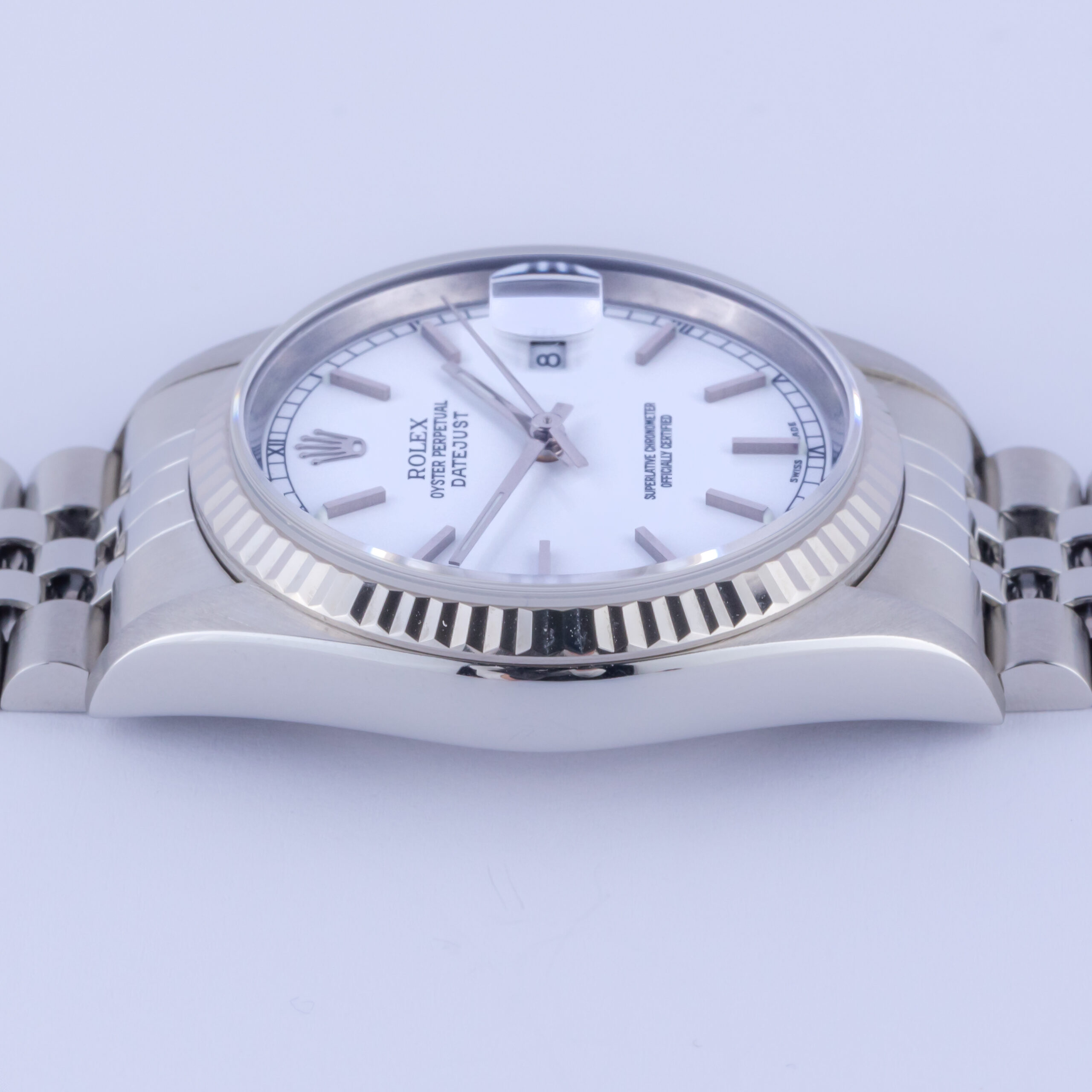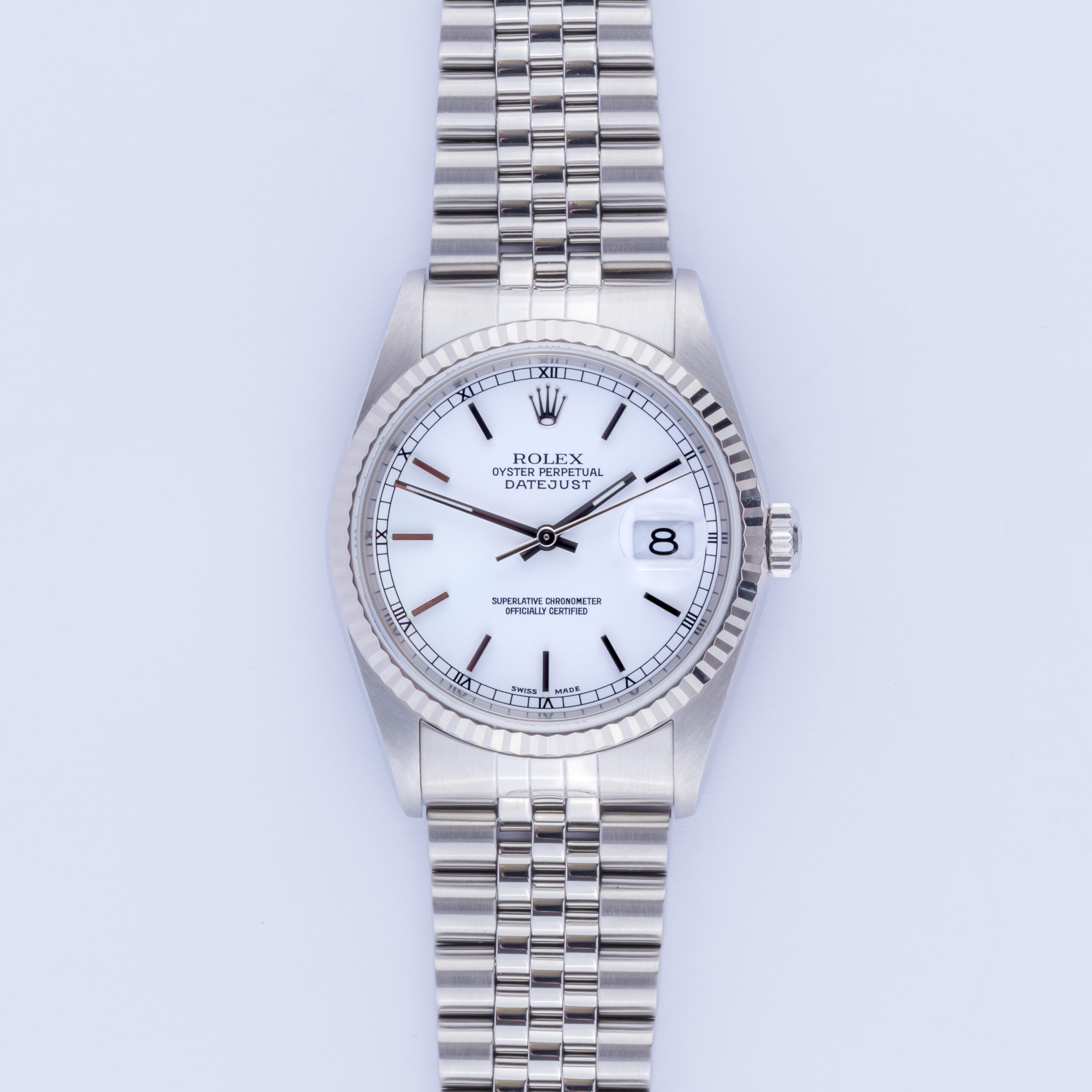 Rolex Oyster Perpetual Datejust Referenz 16234 aus dem Jahr 2002. Die Datejust 16234 Datejust misst ein 36-mm-Edelstahlgehäuse, ein Edelstahl-Jubiläumsarmband und eine kannelierte 18k Weißgoldlünette. Diese Datejust 16234 verfügt über ein Automatikwerk Kaliber 3135 mit Schnellverstellung Datum Funktion, eine Kratzfestigkeit Saphirglas und ein weißes Zifferblatt.