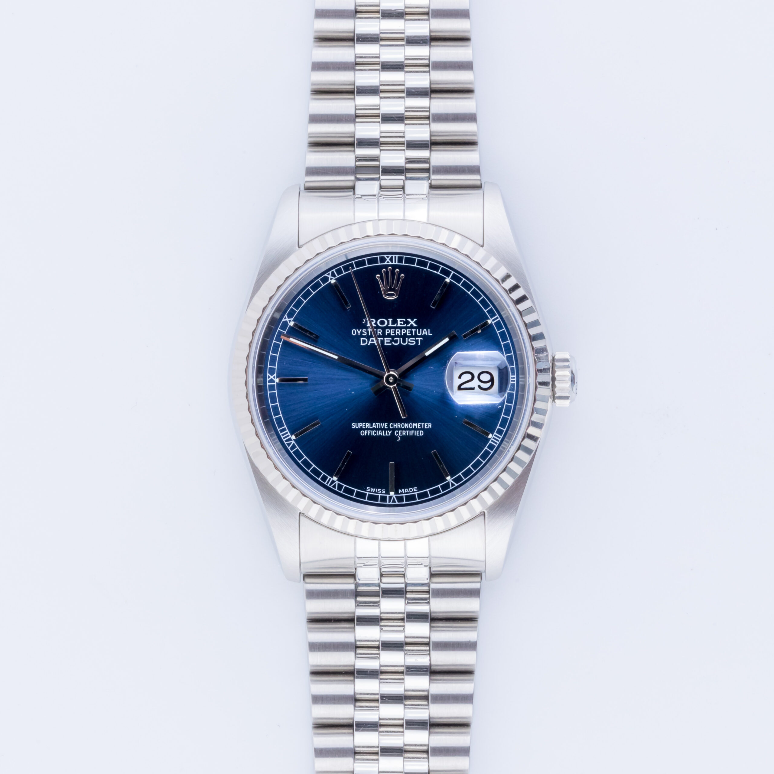 Rolex Oyster Perpetual Datejust Referenz 16234 von 2003 mit komplettem Set. Die Datejust 16234 Datejust misst ein 36-mm-Edelstahlgehäuse, ein Edelstahl-Jubiläumsarmband und eine kannelierte 18k Weißgold-Lünette. Diese Datejust 16234 verfügt über ein Kaliber 3135 Automatikwerk mit Quickset Datum Funktion, ein kratzfestes Saphirglas und ein blaue Zifferblatt.
