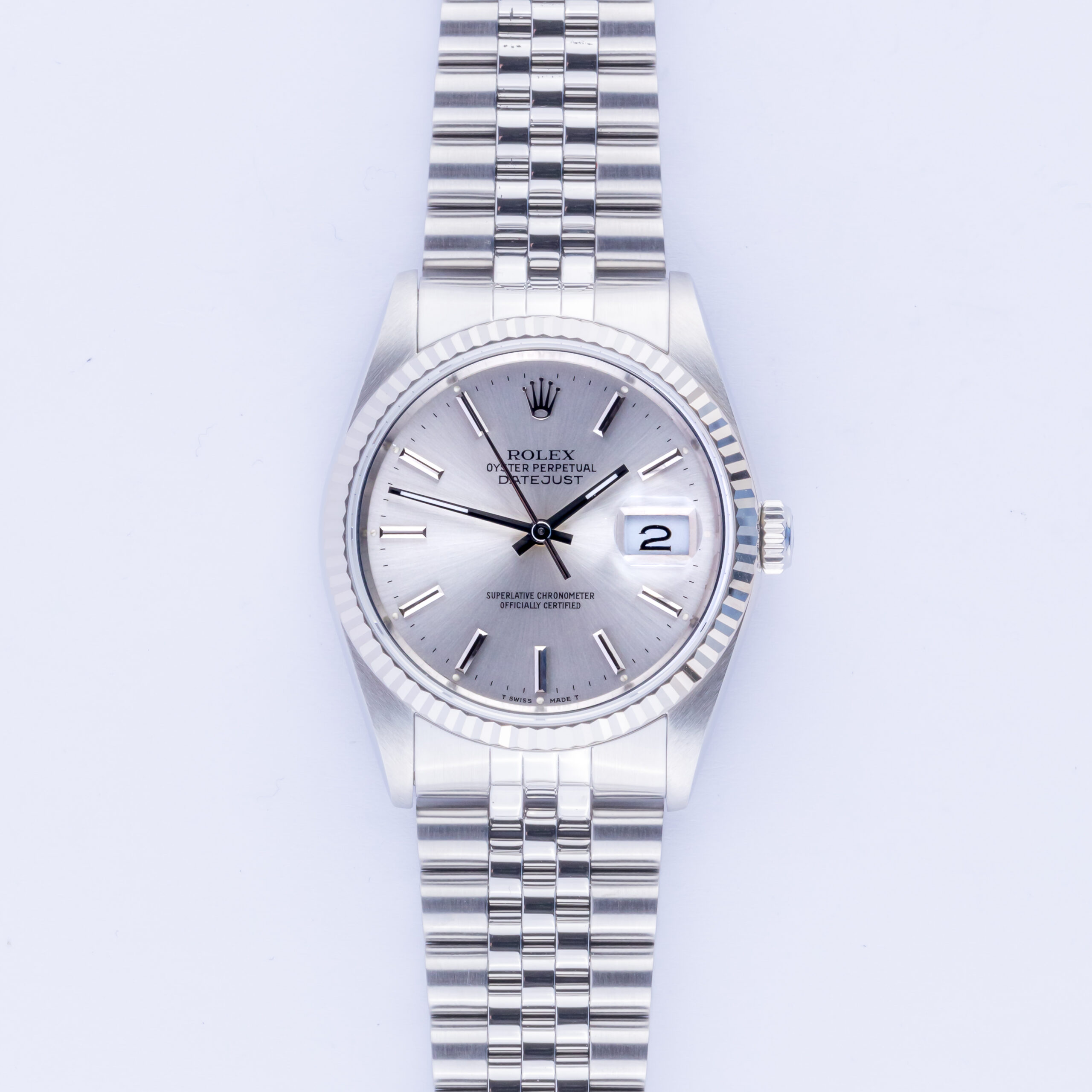 Rolex Oyster Perpetual Datejust Referenz 16234 aus dem Jahr 1989. Die Datejust 16234 Datejust misst ein 36-mm-Edelstahlgehäuse, ein Edelstahl-Jubiläumsarmband und eine kannelierte 18k Weißgoldlünette. Diese Datejust 16234 verfügt über ein Automatikwerk Kaliber 3135 mit Schnellverstellung Datum Funktion, eine Kratzfestigkeit Saphirglas und ein silberness Zifferblatt.