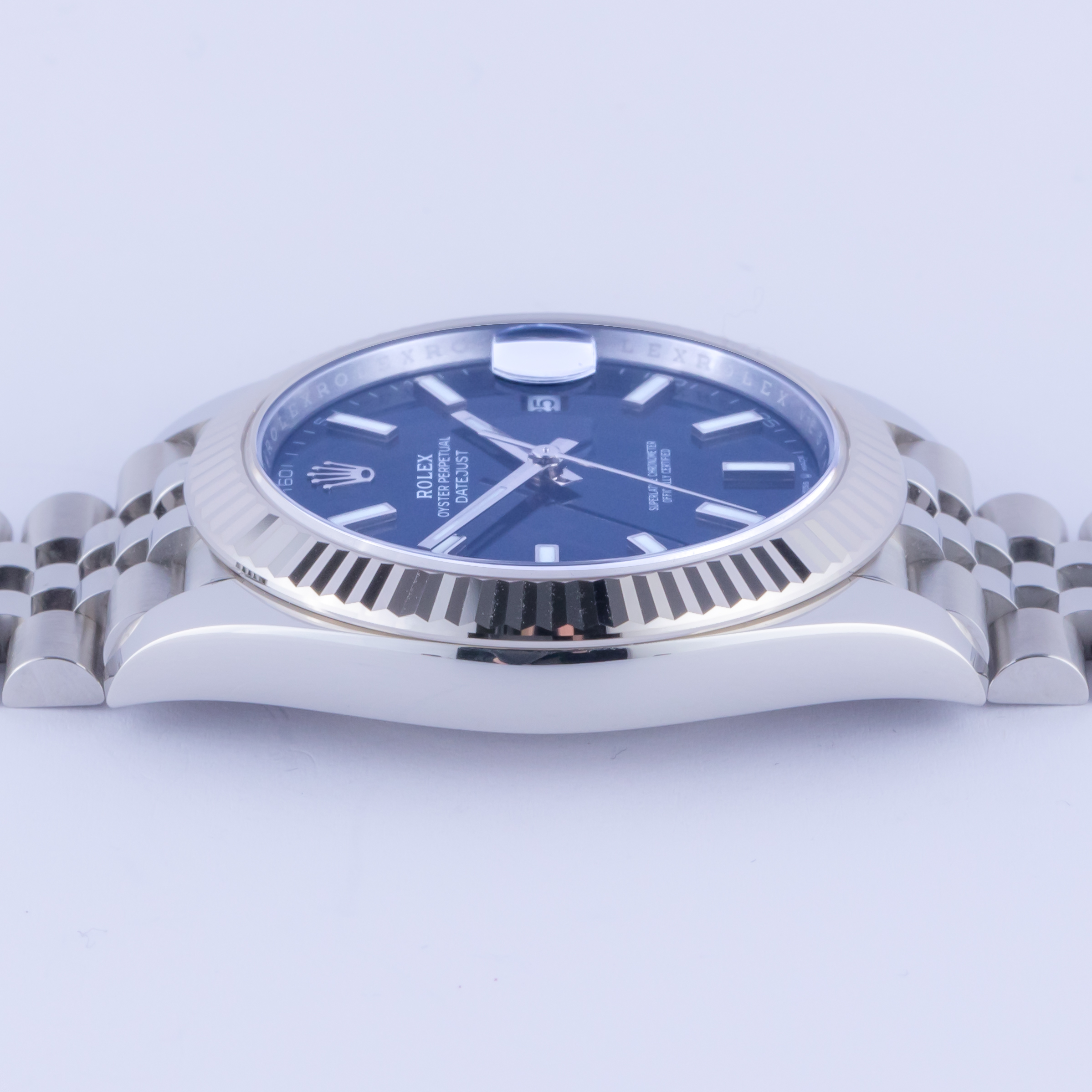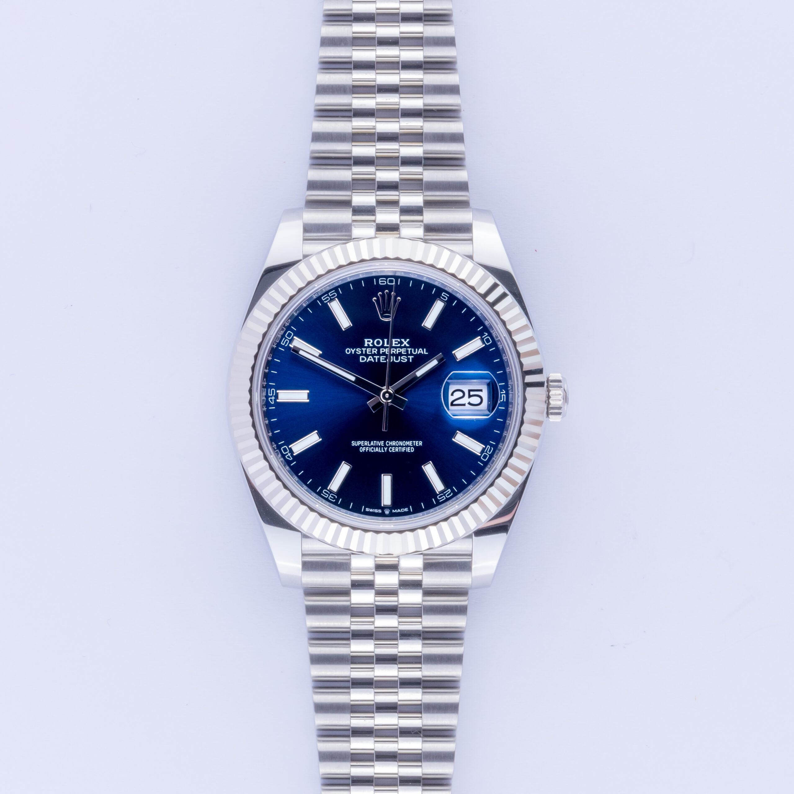 Rolex Oyster Perpetual Datejust Referenz 126334 aus dem Jahr 2022 inklusive komplettem Set. Die Datejust 126334 misst ein 41-mm-Edelstahlgehäuse, ein Edelstahl (904L) Jubilee-Armband mit Oysterclasp und eine kannelierte 18K Weißgold-Lünette. Diese Datejust 126334 verfügt über ein Automatikwerk Kaliber 3235 mit einem Quickset-Datum-Funktion, eine Kratzfestigkeit Saphirglas und blaues Zifferblatt.