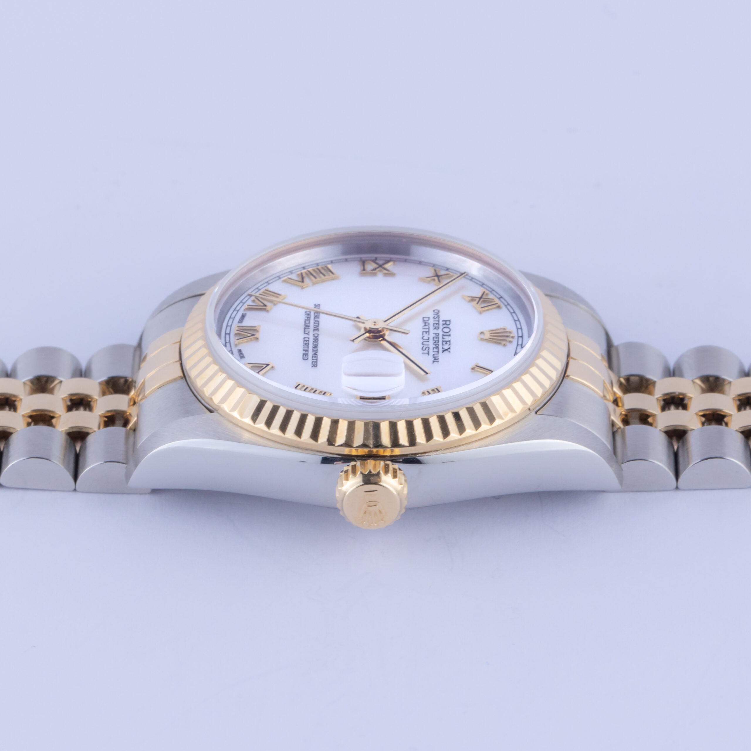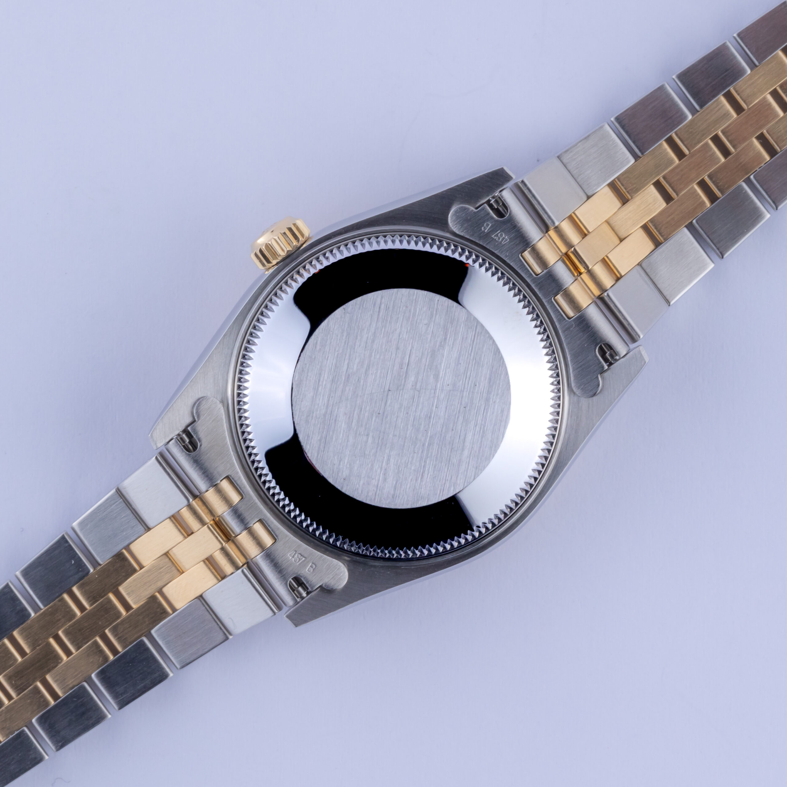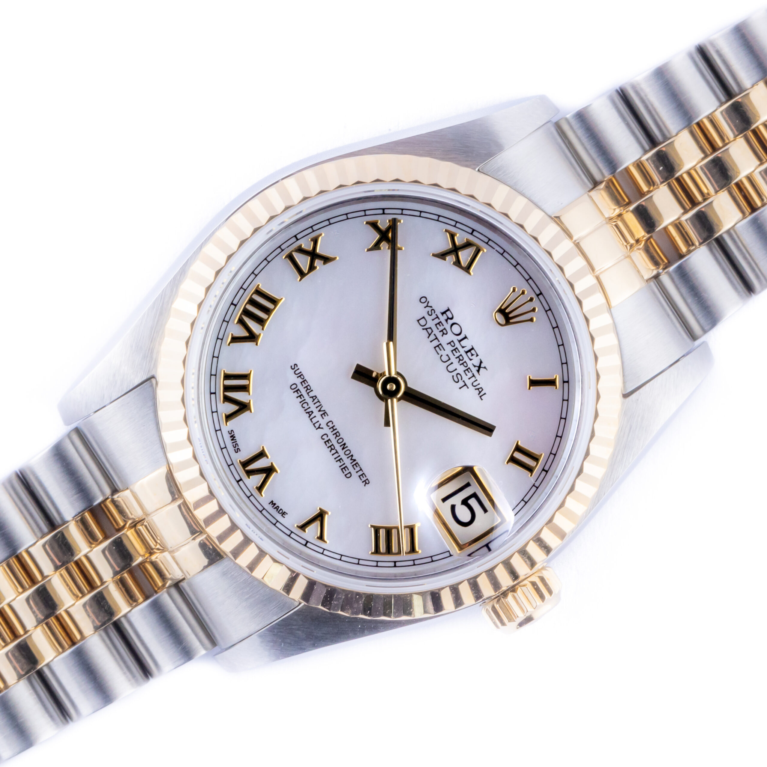 Rolex Oyster Perpetual Datejust Mid-Size Referenz 68273 aus dem Jahr 1995 mit komplettem Set. Die Datejust 68273 misst ein 31mm Gold/Edelstahl-Gehäuse, ein Gold/Edelstahl-Jubilee-Armband und eine geriffelte 18k Goldlünette. Diese Datejust 68273 verfügt über ein Automatikwerk Kaliber 3135 mit Schnellverstellung des Datums, ein kratzfestes Saphirglas und ein MOP Zifferblatt mit Tritiumzeigern und Römischen markierungen.