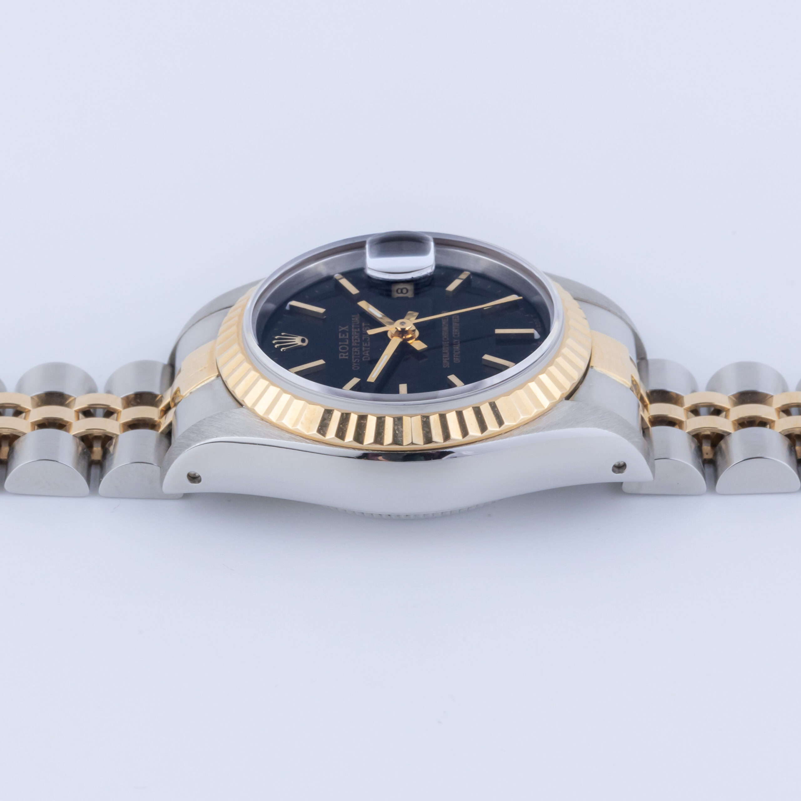 Rolex Oyster Perpetual Lady-Datejust Referenz 69173 aus dem Jahr 1988 einschließlich der vollständigen Satz. Die Lady-Datejust 69173 misst eine 26mm Gold und Edelstahl-Gehäuse, zwei-Ton-Jubiläum Armband und geriffelte 14k Gold Lünette. Diese Lady-Datejust 69173 verfügt über ein Automatikwerk Kaliber 2135 mit Quickset Datum Funktion, eine Kratzfestigkeit Saphirglas und ein schwarzes Zifferblatt w / Tritium Zeiger. Jede Uhr, die von Langedyk Vintage Watches verkauft wird, wird mit einer LVW-Uhrenbox, einem Echtheitsbericht und einem kostenlosen weltweiten (versicherten) Versand geliefert. Darüber hinaus wird jede gebrauchte Uhr mit unserer 12-monatigen Garantie ab dem Kaufdatum angeboten.