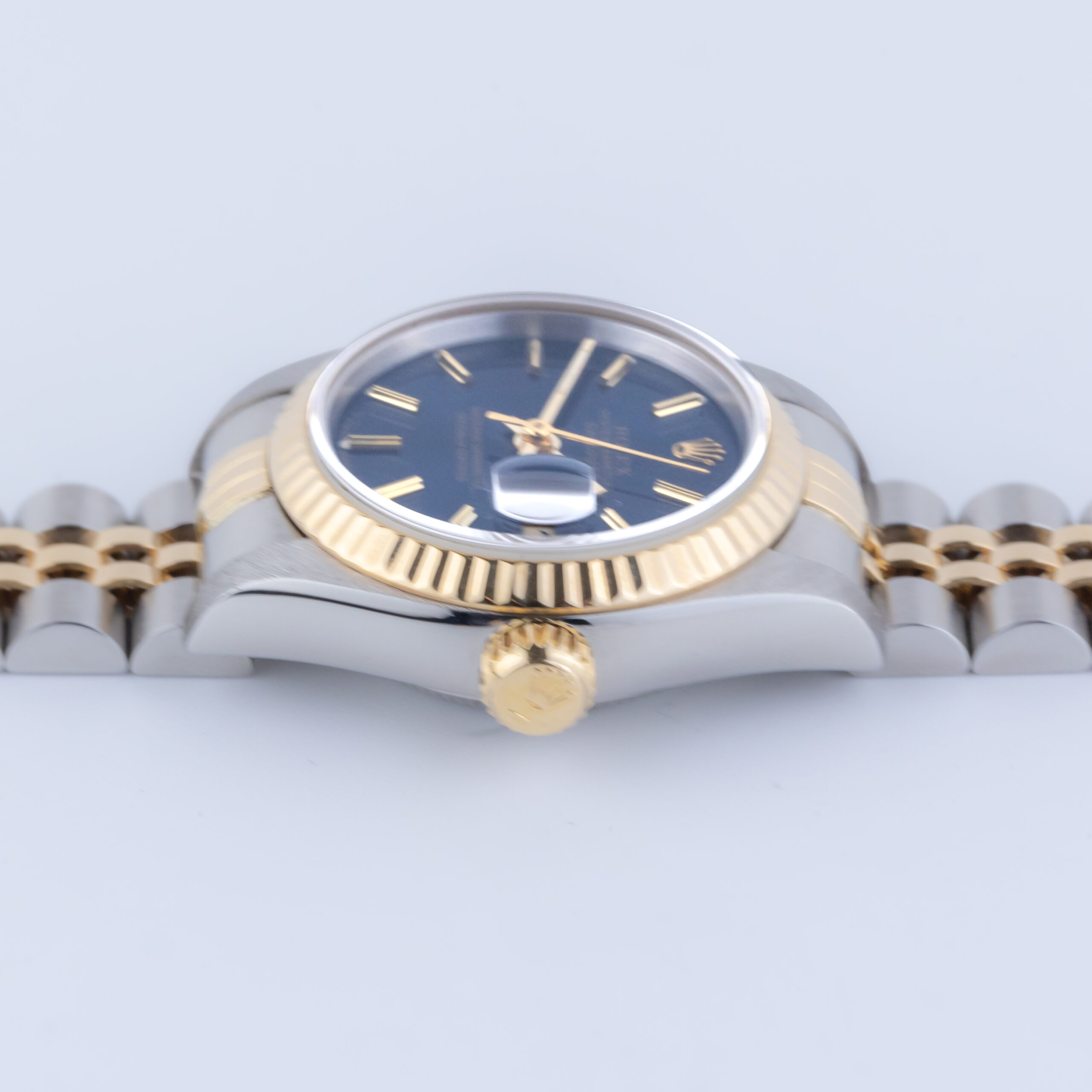 Rolex Oyster Perpetual Lady-Datejust Referenz 69173 aus dem Jahr 1993 mit komplettem Set. Die Lady-Datejust 69173 misst eine 26mm Gold und Edelstahl-Gehäuse, zwei-Ton-Jubiläum Armband und geriffelte 14k Gold Lünette. Diese Lady-Datejust 69173 verfügt über ein Automatikwerk Kaliber 2135 mit Quickset Datum Funktion, eine Kratzfestigkeit Saphirglas und ein blaues Zifferblatt mit Tritium Zeiger. Jede Uhr, die von Langedyk Vintage Watches verkauft wird, wird mit einer LVW-Uhrenbox, einem Echtheitsbericht und einem kostenlosen weltweiten (versicherten) Versand geliefert. Darüber hinaus wird jede gebrauchte Uhr mit unserer 12-monatigen Garantie ab dem Kaufdatum angeboten.