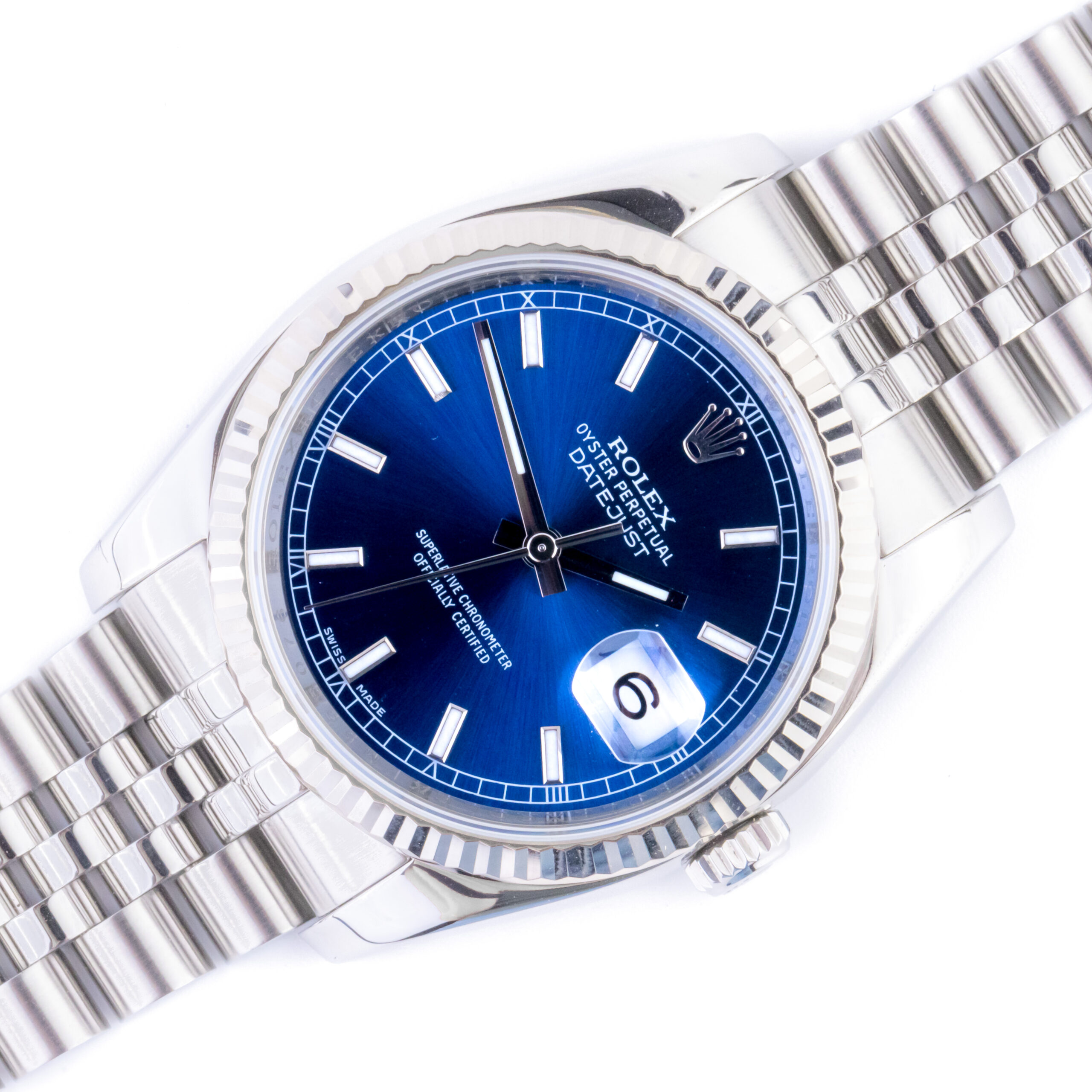 olex Oyster Perpetual Datejust Referenz 116234 aus dem Jahr 2008 mit komplettem Set. Die Datejust 116234 misst ein 36-mm-Edelstahlgehäuse, ein Edelstahl-Jubiläumsarmband mit verdeckter Kronenschließe und eine kannelierte Lünette aus 18 Karat Weißgold. Diese Datejust 116234 verfügt über ein Automatikwerk Kaliber 3135 mit Quickset-Datum-Funktion, ein kratzfestes Saphirglas und eine blaue Stick-Zifferblatt mit Superluminova Index. Auf jede gebrauchte Uhr, die wir verkaufen, gewähren wir eine 12-monatige Garantie ab dem Kaufdatum. Jede Uhr, die von Langedyk Vintage Watches verkauft wird, wird mit einer LVW-Uhrenbox, einem Echtheitsbericht und einem kostenlosen weltweiten (versicherten) Versand geliefert..