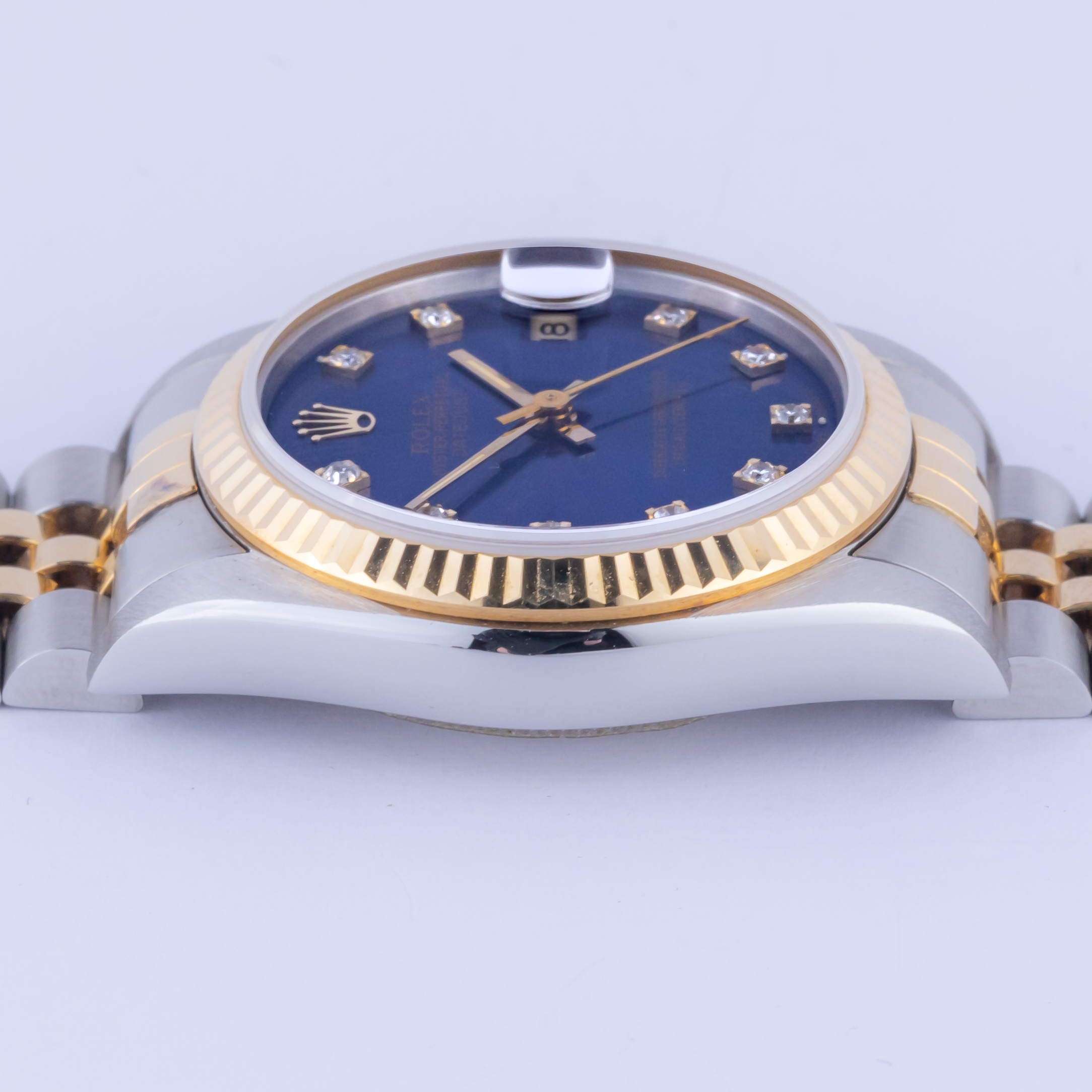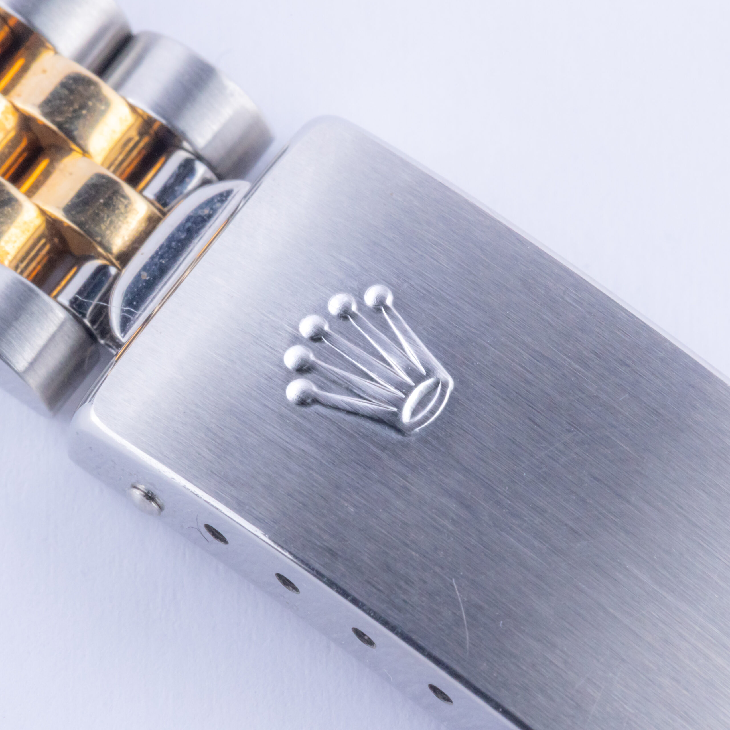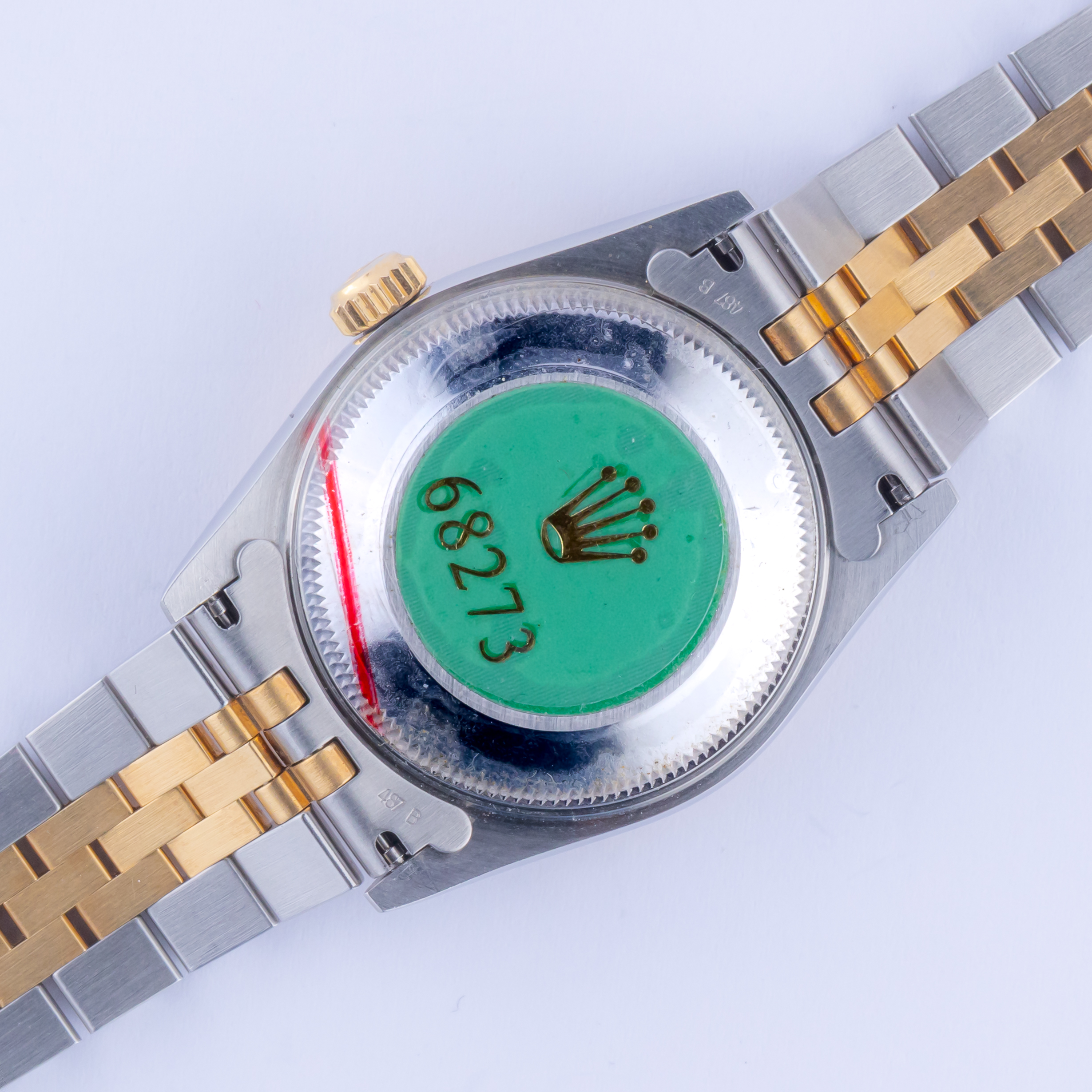 Rolex Oyster Perpetual Datejust Mid-Size Referenz 68273 aus dem Jahr 1995 mit komplettem Set. Die Datejust 68273 misst ein 31mm Gold/Edelstahl-Gehäuse, ein Gold/Edelstahl-Jubilee-Armband und eine geriffelte 18k Goldlünette. Diese Datejust 68273 verfügt über ein Automatikwerk Kaliber 3135 mit Schnellverstellung des Datums, ein kratzfestes Saphirglas und ein blaues Zifferblatt mit Tritiumzeigern und diamantmarkierungen.