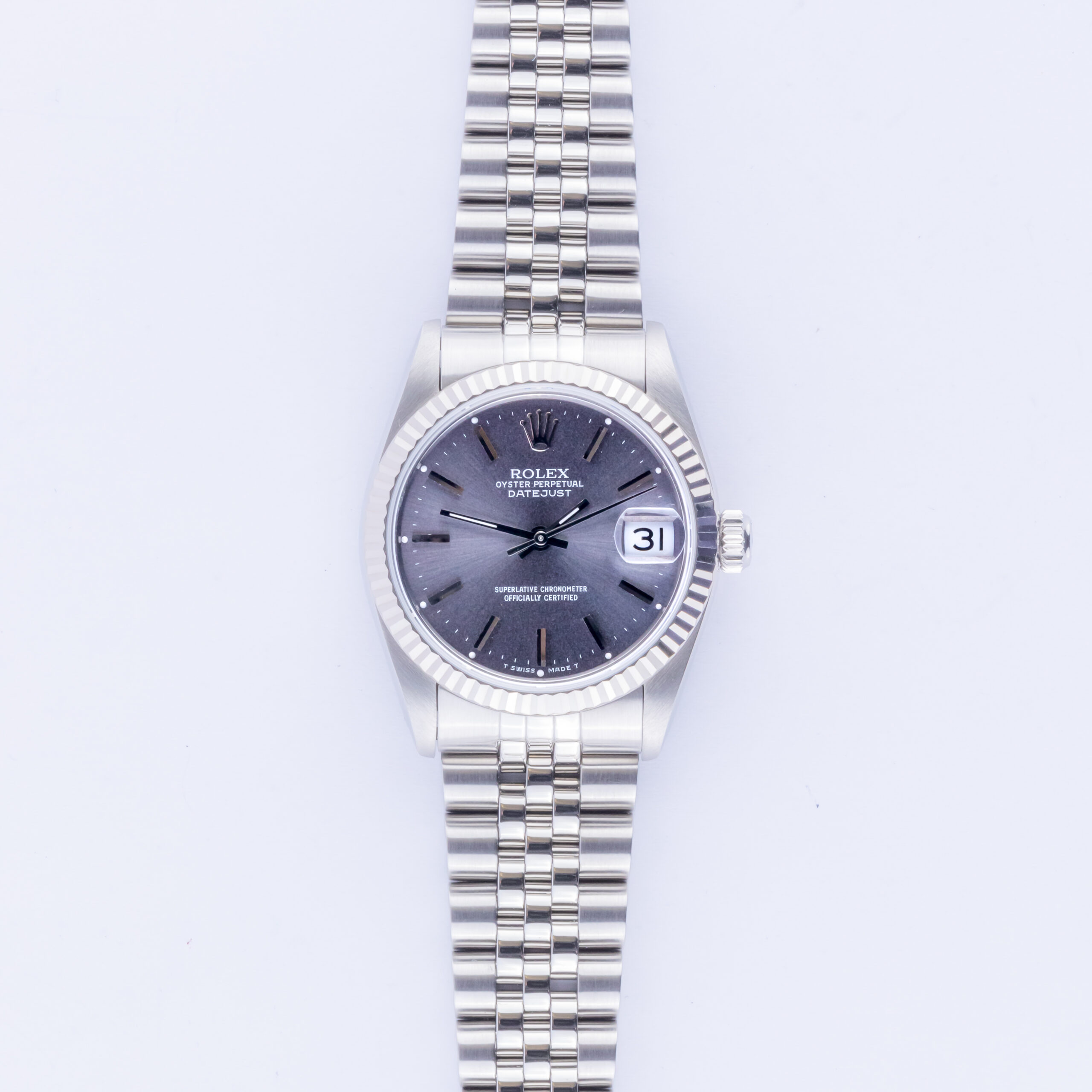 Rolex Oyster Perpetual Datejust Mid-Size Referenz 68274 aus dem Jahr 1989 mit komplettem Set. Die Datejust 68274 misst ein 31mm Edelstahlgehäuse, ein Edelstahl-Jubiläumsarmband und eine kannelierte 18k Weißgoldlünette. Diese Datejust 68274 verfügt über ein Automatikwerk Kaliber 3135 mit Quickset-Datum-Funktion, eine Kratzfestigkeit Saphirglas und ein graues Zifferblatt mit Tritium Zeiger.