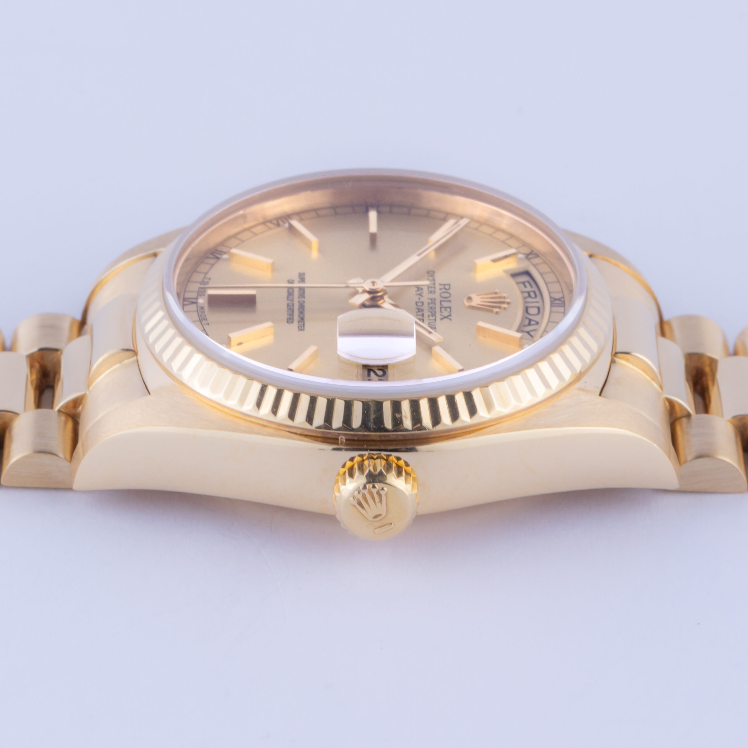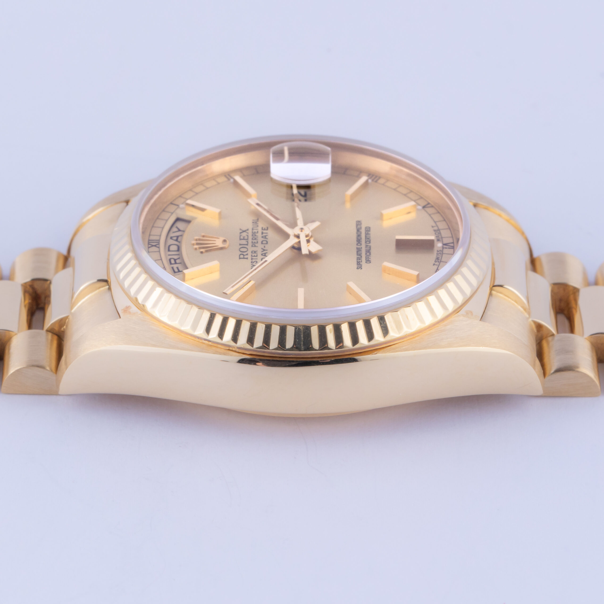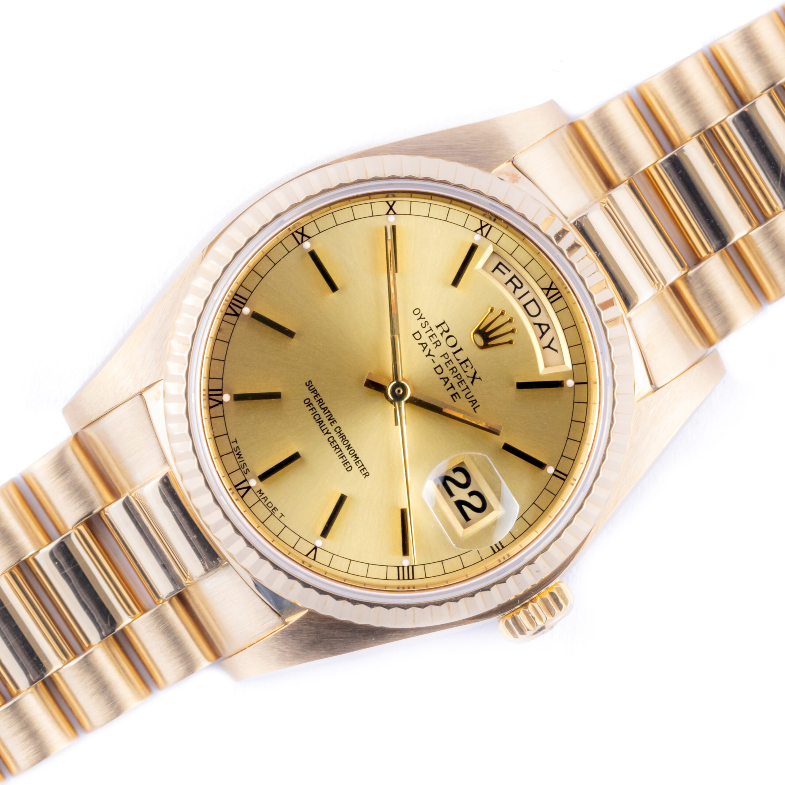 Rolex Oyster Perpetual Day-Date Referenz 18038 aus dem Jahr 1979. Die Day-Date 18038 misst ein 36-mm-Gehäuse aus 18-karätigem Gold, ein 18-karätiges Präsidentenarmband mit Kronenschließe und eine kannelierte Lünette aus 18-karätigem Gold. Die Day-Date 18038 verfügt über ein Automatikwerk Kaliber 3055 mit Schnellverstellung von Datum und Wochentag, ein kratzfestes Saphirglas und ein champagnerfarbenes Stabzifferblatt mit Tritiumzeigern.