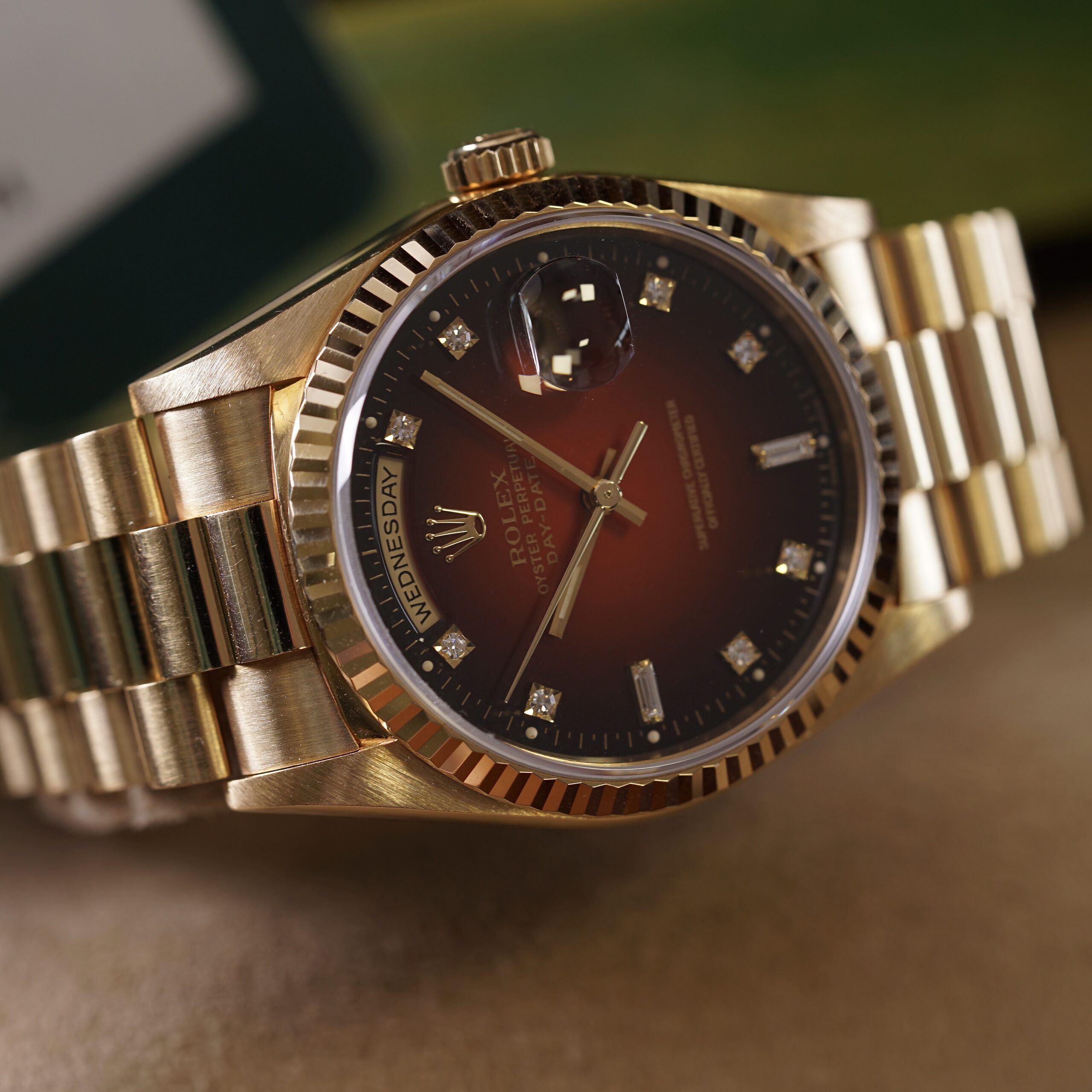 Mit der Veröffentlichung der Rolex President 18238 in den späten 80er Jahren stellte Rolex eine neue Kraft für seine kultigen Luxusuhren vor. Sie verbesserten die mechanische Genialität der Day-Date mit dem mächtigen Cal. 3155 Perpetual Uhrwerk in Kombination mit der Double Quickset Funktion. Mit dieser Funktion können Sie sowohl das Datum als auch den Wochentag wechseln, ohne die Uhrzeit zu verändern. Drehen Sie die Krone in eine Richtung, um das Datum zu ändern, drehen Sie sie in die andere Richtung, um den Tag zu ändern. Wahrlich so einfach wie elegant.