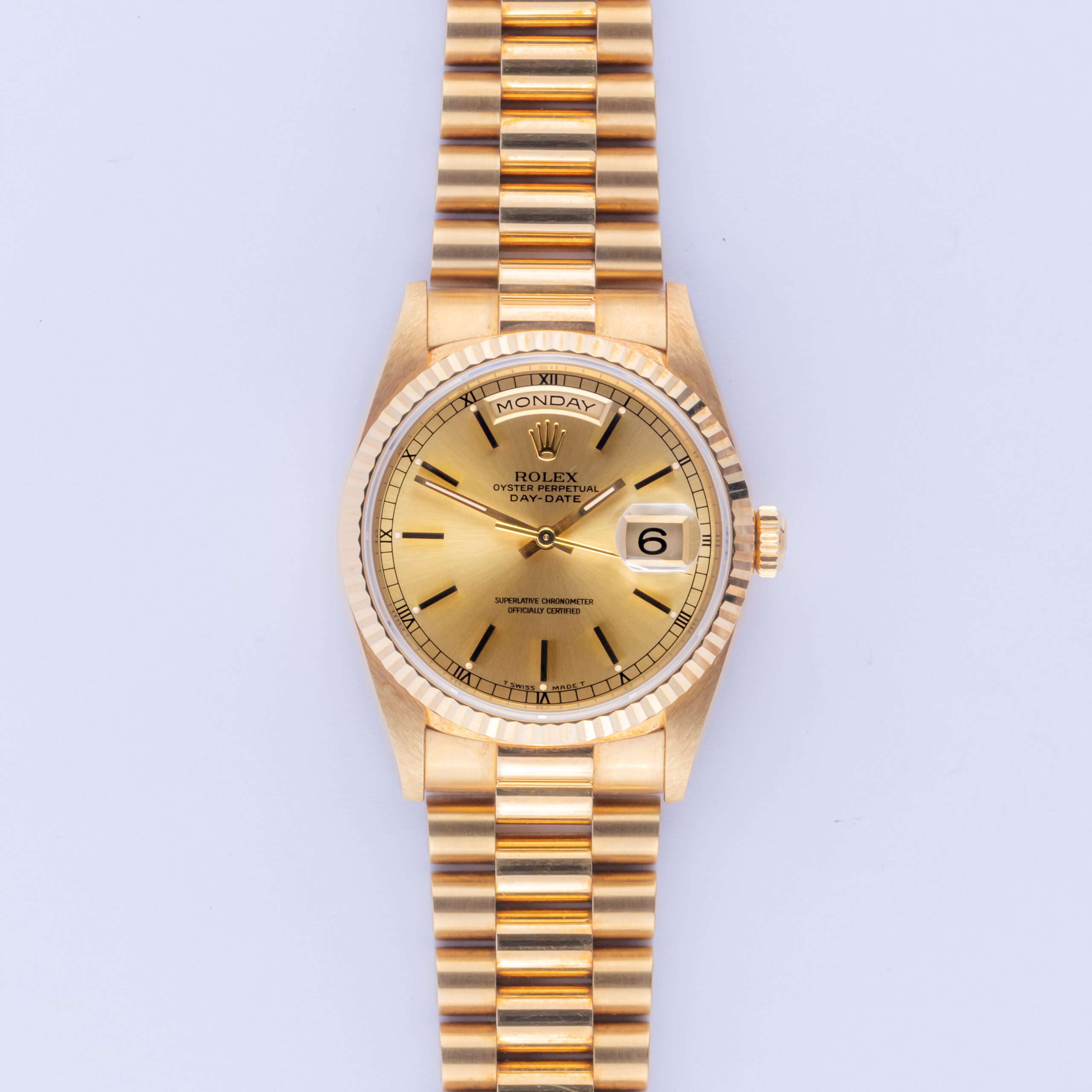 Rolex Oyster Perpetual Day-Date Referenz 18238 aus dem Jahr 1990 einschließlich des kompletten Satzes. Die Day-Date 18238 hat ein 36-mm-Gehäuse aus 18-karätigem Gold, ein 18-karätiges President-Uhrenarmband mit Kronenschließe und eine kannelierte Lünette aus 18-karätigem Gold. Die Day-Date 18238 verfügt über ein Automatikwerk Kaliber 3155 mit doppelter Schnellverstellung von Datum und Wochentag, kratzfestes Saphirglas und ein champagnerfarbenes Zifferblatt.