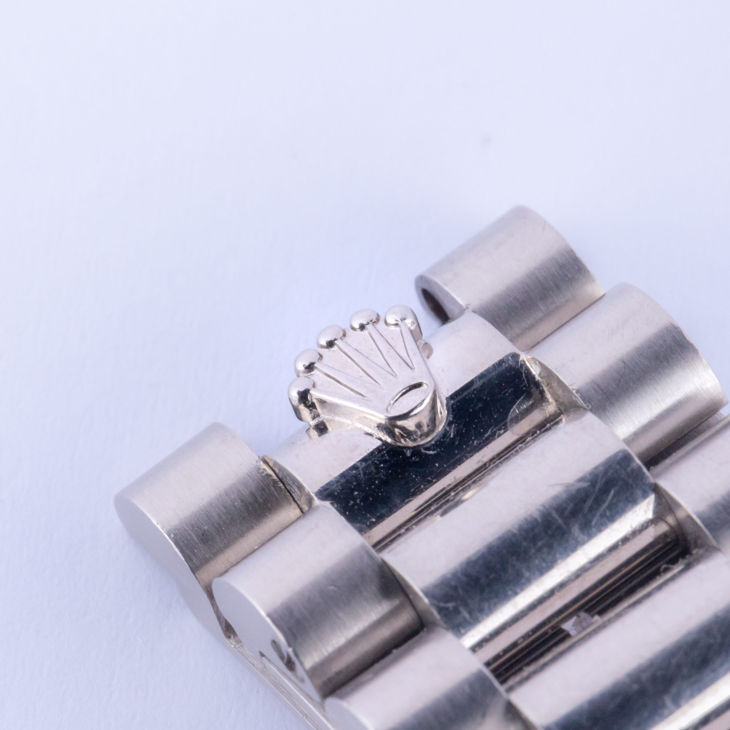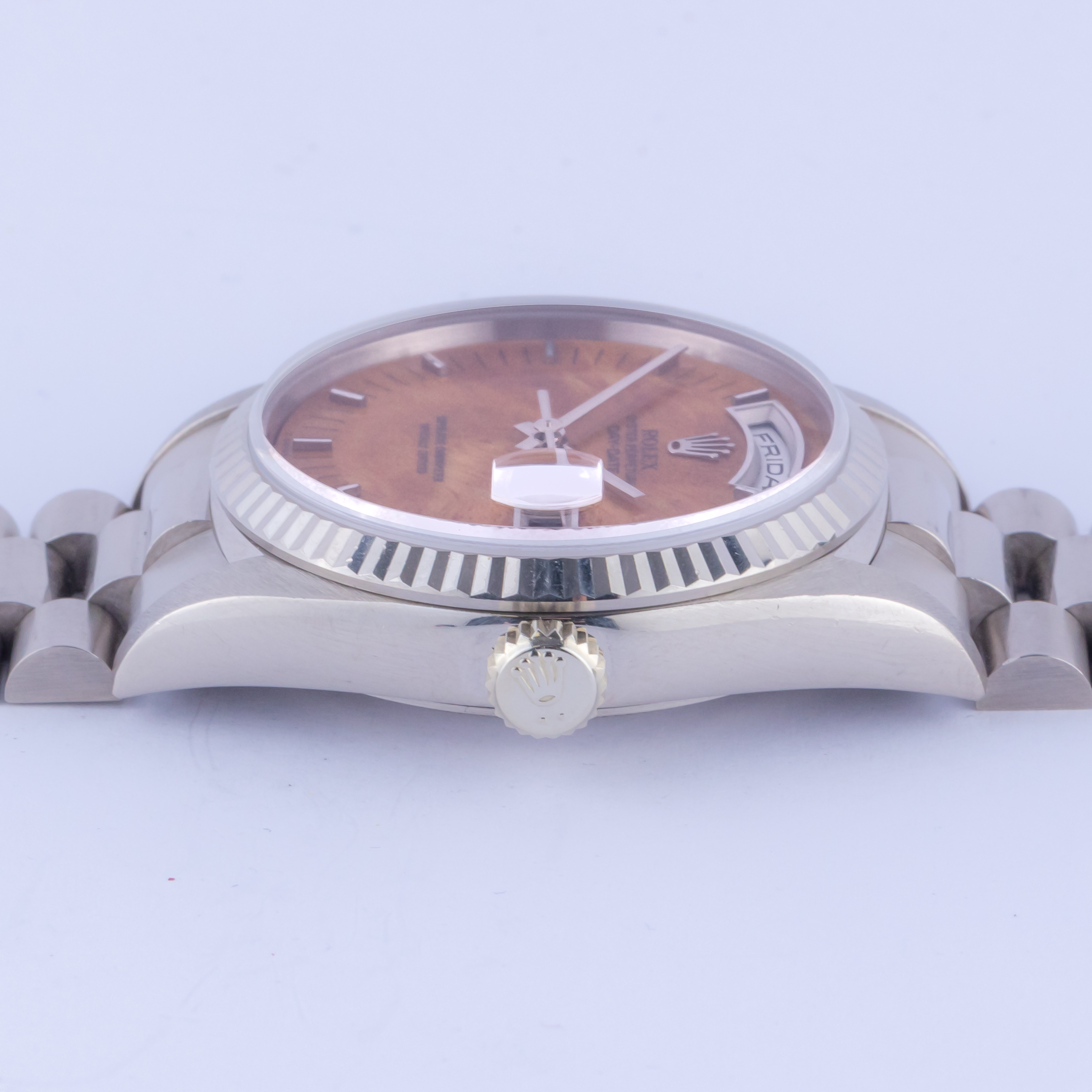 Rolex Oyster Perpetual Day-Date Referenz 18239 aus dem Jahr 1996 mit komplettem Set. Die Day-Date 18239 misst ein 36mm 18k Weißgold Gehäuse, ein 18k Weißgold Präsident Armband mit verdeckter Kronenschließe und kannelierte 18k Weißgold Lünette. Diese Day-Date 18239 verfügt über ein Automatikwerk Kaliber 3155 mit doppelter Schnellverstellung des Datums, ein kratzfestes Saphirglas und ein Holzzifferblatt mit Tritiumzeigern.