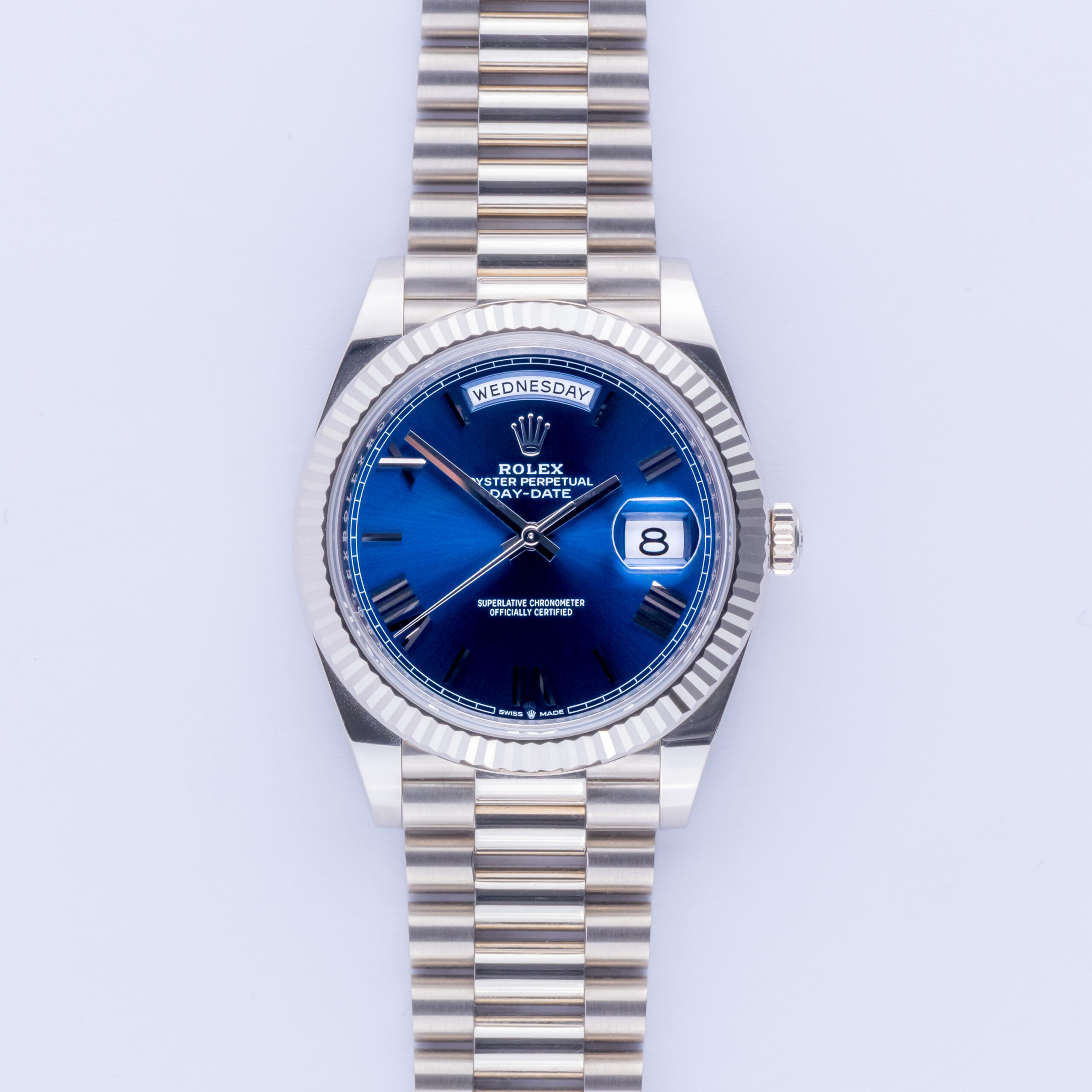Rolex Oyster Perpetual Day-Date Referenz 228239 aus dem Jahr 2022 inklusive Komplettset. Die Day-Date 228239 misst ein 40mm 18k Weißgoldgehäuse, ein 18k Weißgold Präsident Armband mit Crownclasp und kannelierte 18k Weißgold Lünette. Die Day-Date 228239 verfügt über ein Automatikwerk Kaliber 3255 mit doppelter Schnellverstellung von Datum und Wochentag, ein kratzfestes Saphirglas und ein blaues Zifferblatt.