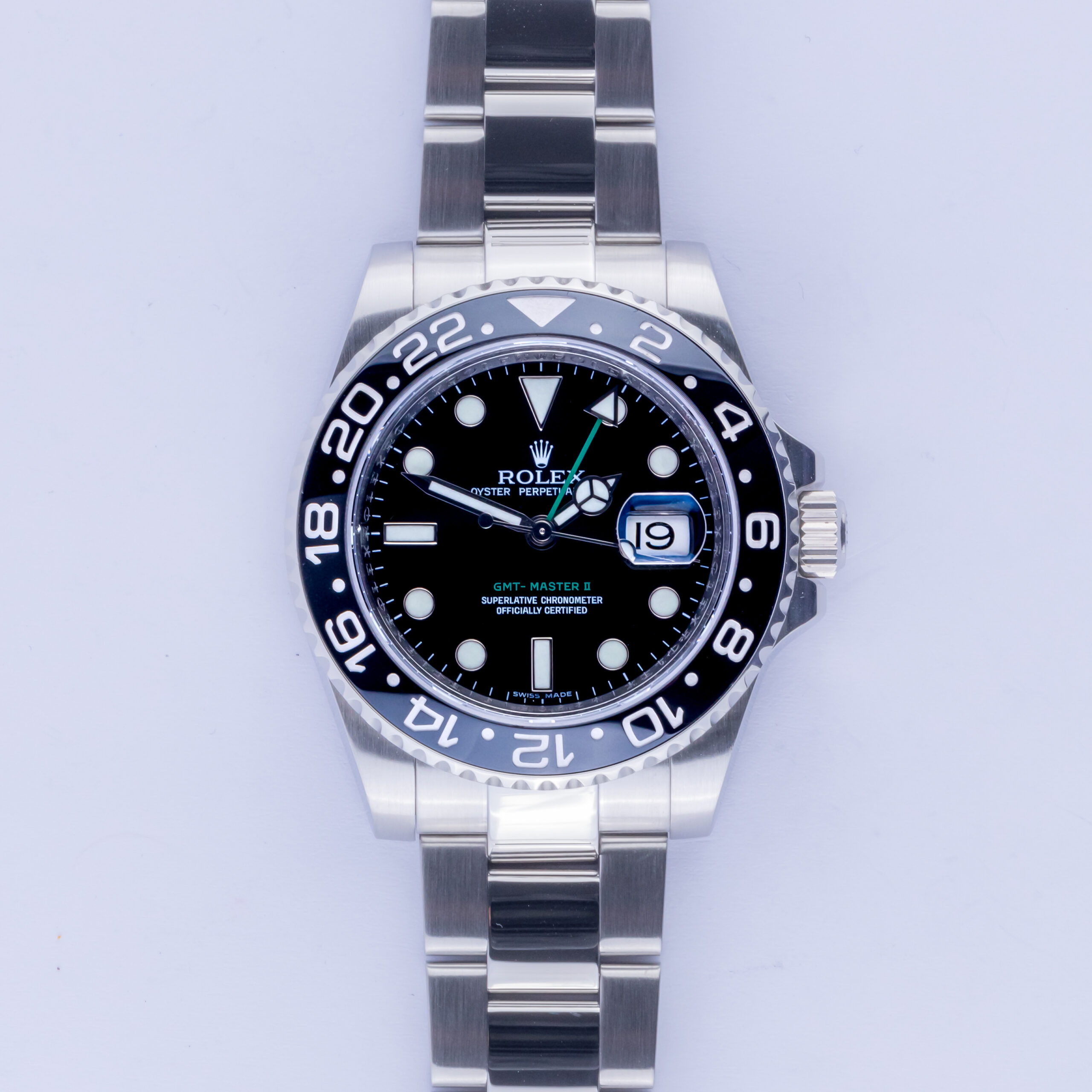 Rolex Oyster Perpetual GMT-Master II Referenz 116710 von 2008 inklusive Box und Papieren. Die GMT-Master II misst ein 40mm Edelstahlgehäuse, Edelstahl Oyster Armband mit Fliplock Schließe und drehbare Lünette. Die GMT-Master II 116710 verfügt über ein Automatikwerk Kaliber 3186 mit GMT-Funktion, ein kratzfestes Saphirglas und ein schwarzes Zifferblatt mit superluminova.
