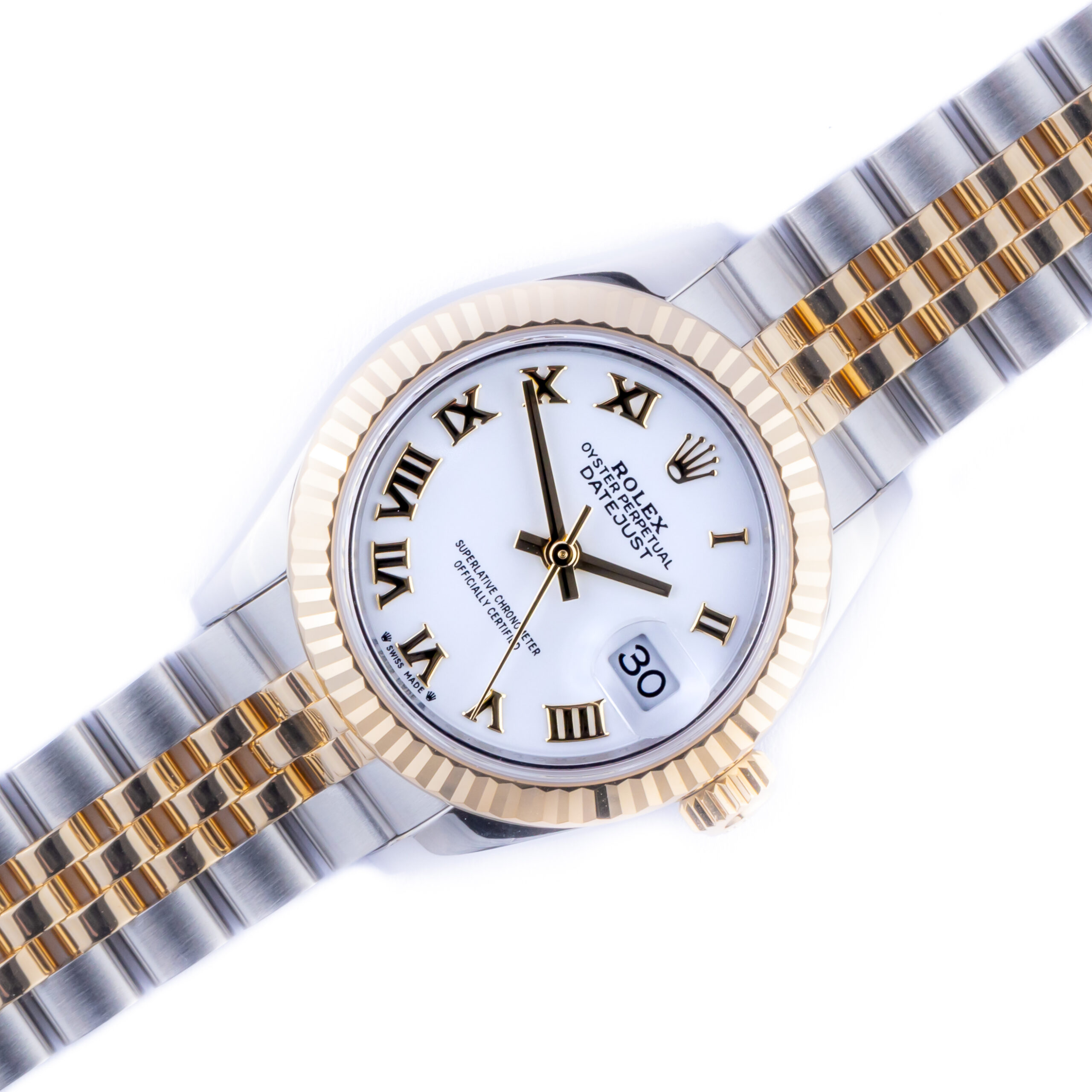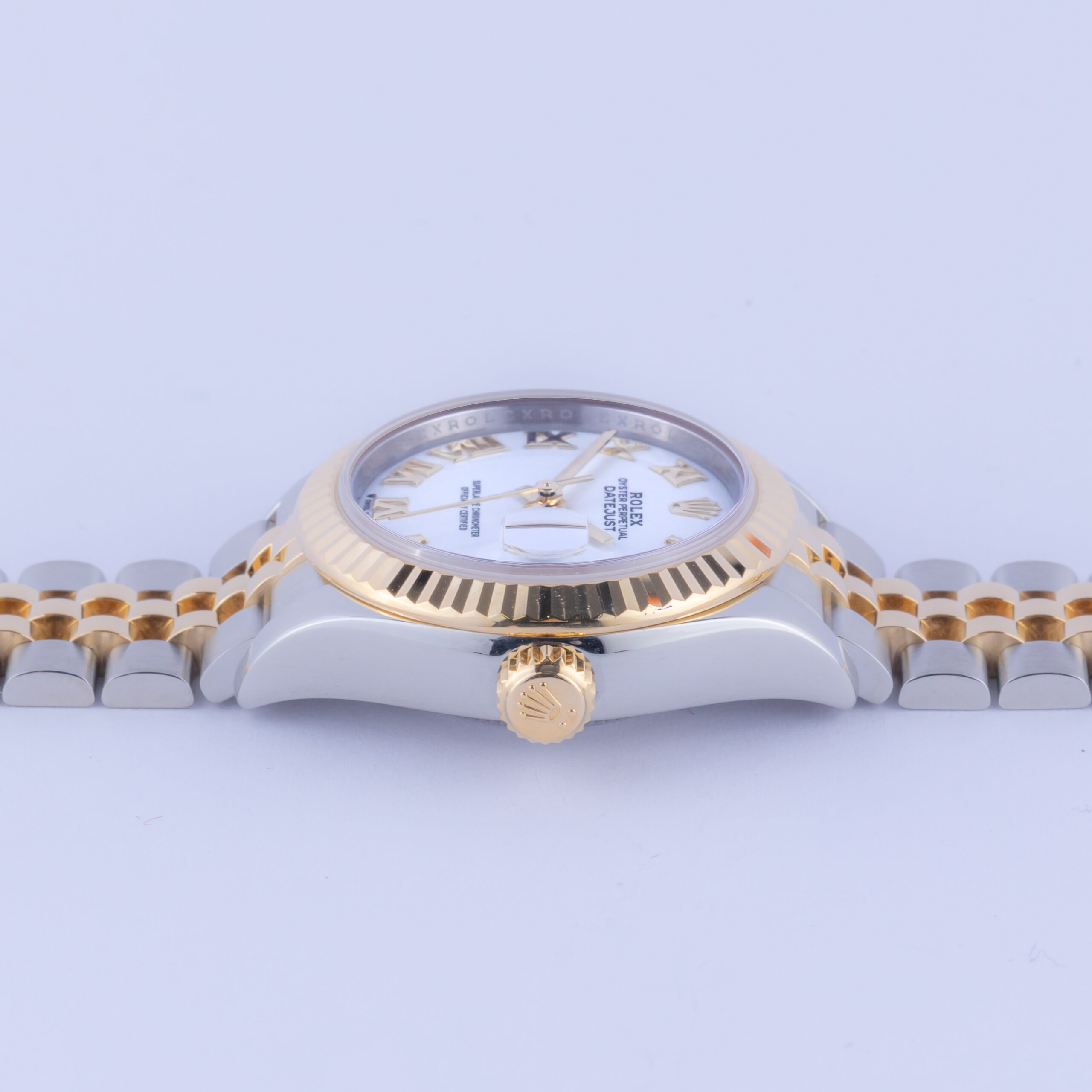 Rolex Oyster Perpetual Lady-Datejust Referenz 279173 aus dem Jahr 2023 mit komplettem Set. Die Lady-Datejust 279173 hat ein 26-mm-Gehäuse aus gelbgold und Edelstahl, ein zweifarbiges Jubiläumsarmband mit verdeckter Kronenschließe und eine Lünette aus 18 Karat Gelbgold. Diese Lady-Datejust 279173 verfügt über ein Automatikwerk Kaliber 2236 mit Schnellverstellung des Datums, ein kratzfestes Saphirglas und ein weißes Zifferblatt mit Römischen markierungen.