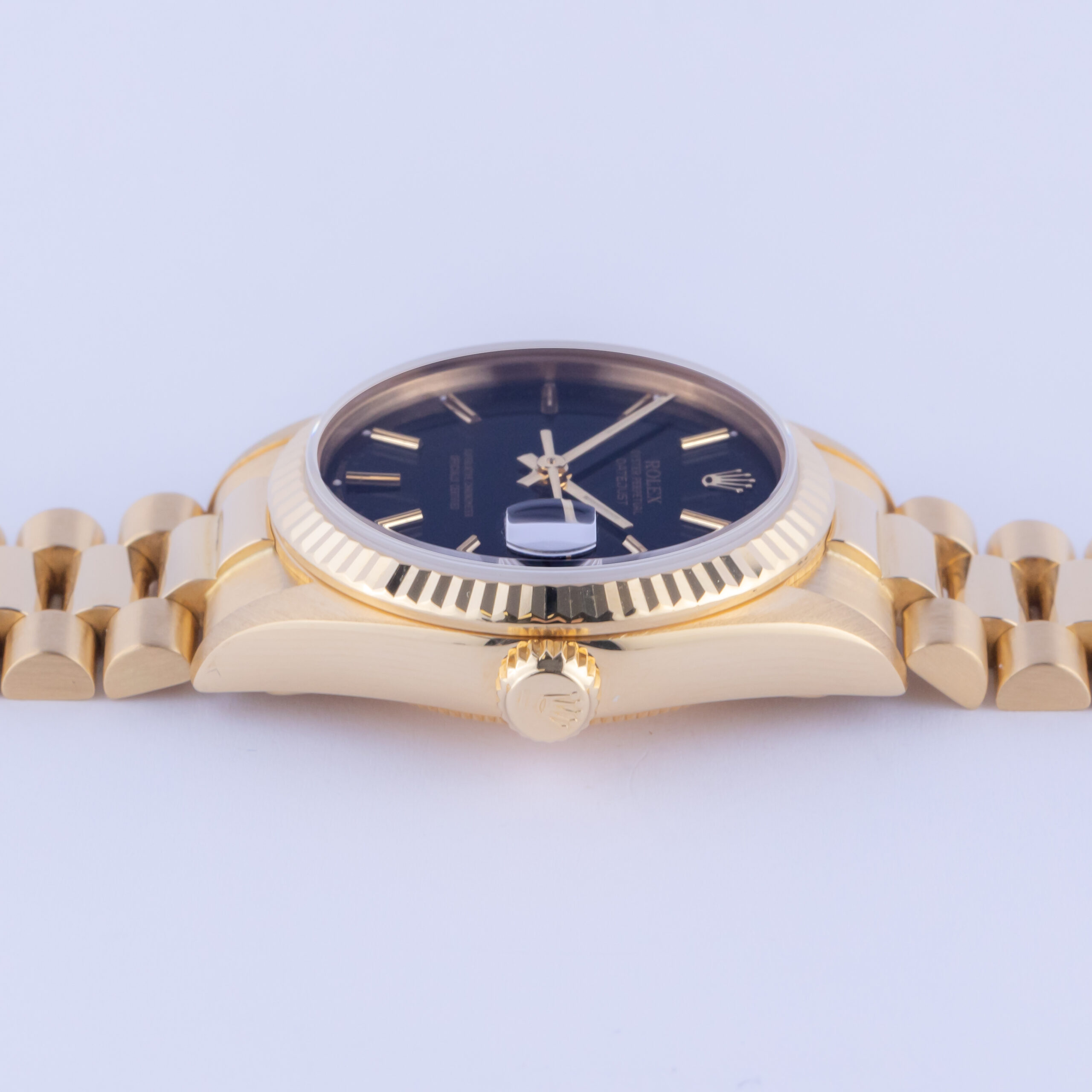 Rolex Oyster Perpetual Lady-Datejust Referenz 68278 aus dem Jahr 1985 mit komplettem Set. Die Lady-Datejust 68278 misst ein 31-mm-Goldgehäuse, ein goldenes President-Armband und eine kannelierte Lünette aus 18 Karat Gold. Die Lady-Datejust 68278 verfügt über ein Automatikwerk Kaliber 2135 mit Schnellverstellung Datum Funktion, Saphirglas und einem schwarzes-Stick Zifferblatt.