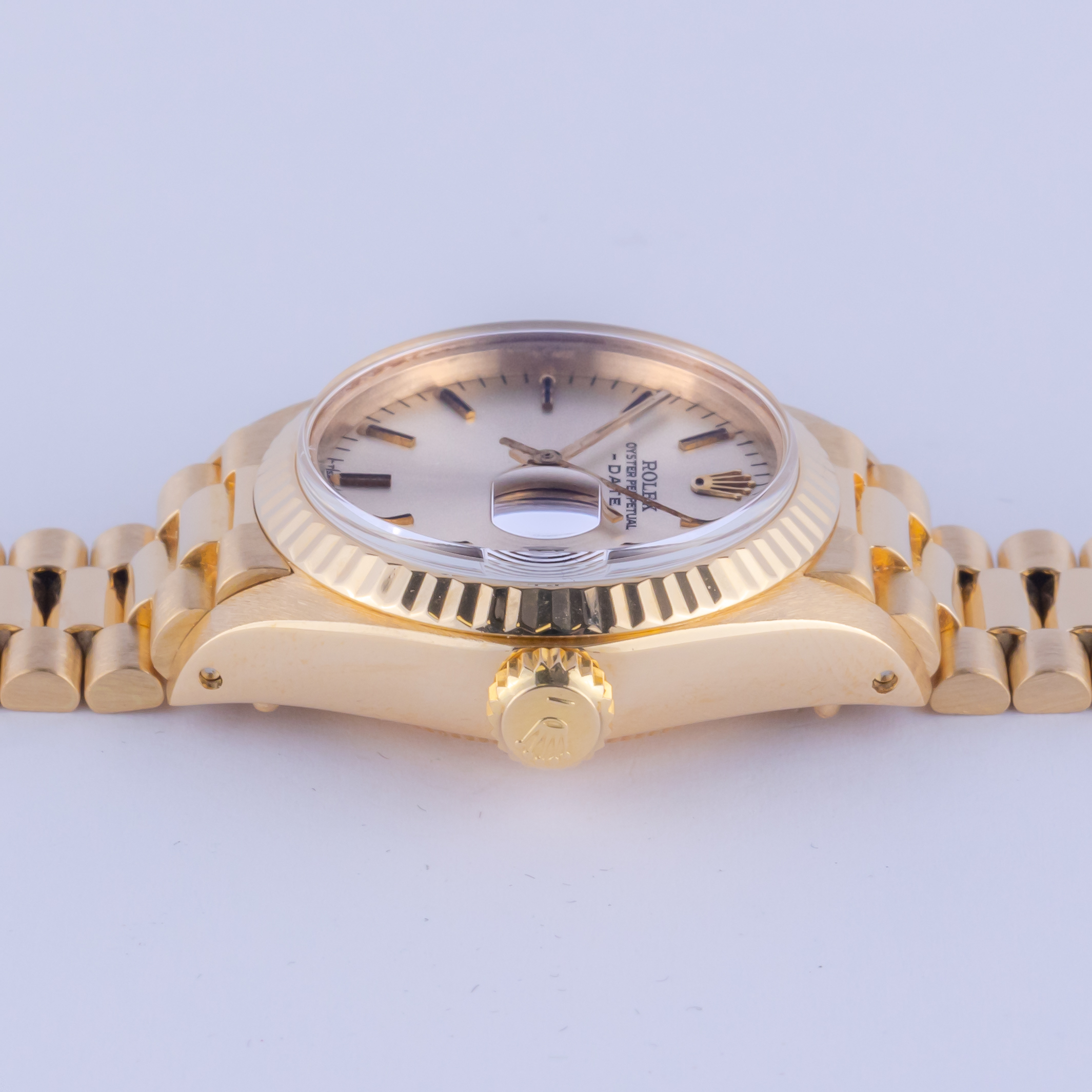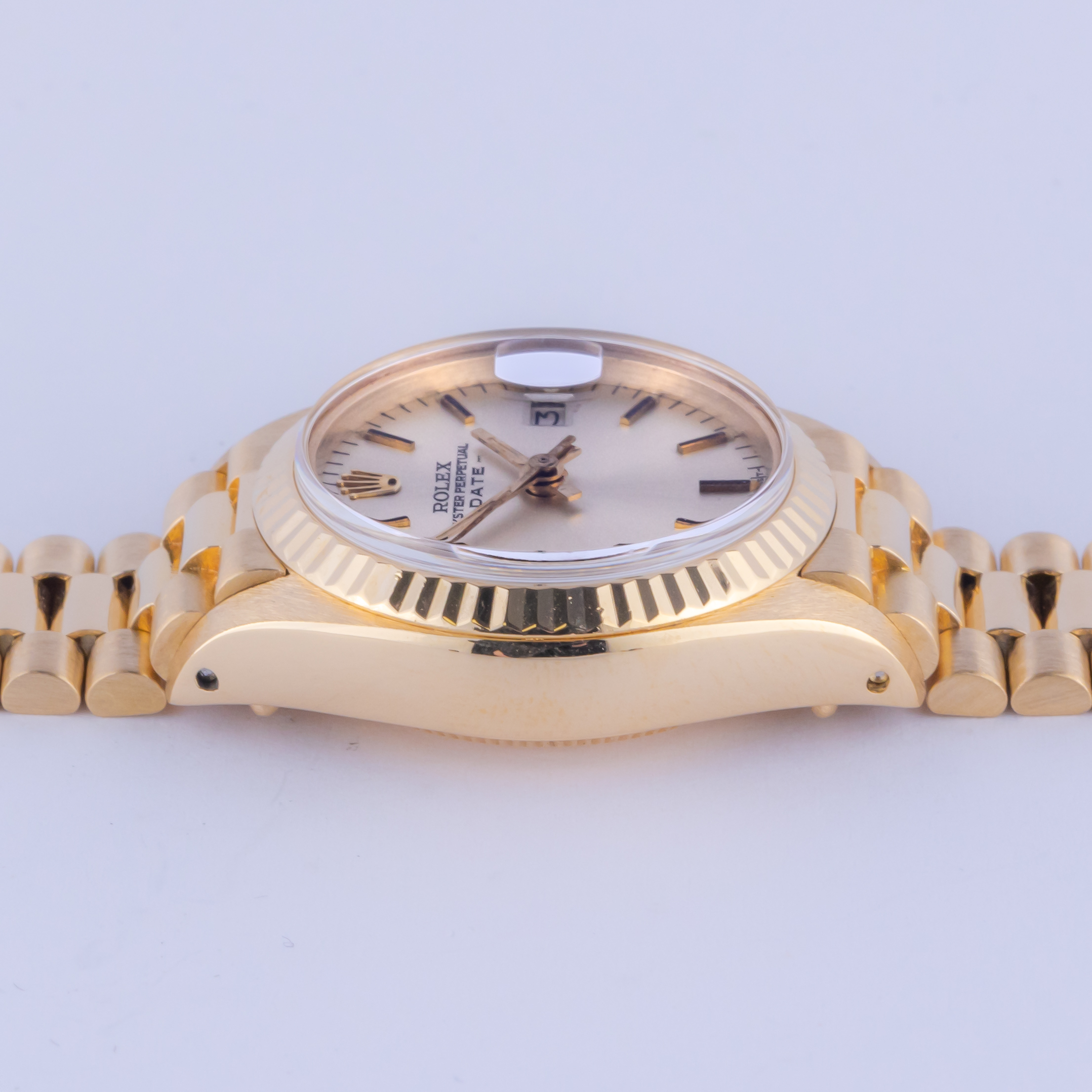 Rolex Lady-Datejust Referenz 6917/8 aus dem Jahr 1981 mit komplettem Set. Die Lady-Datejust 6917/8 misst ein 26mm Goldgehäuse, Gold President und geriffelte 18k Goldlünette. Diese Lady-Datejust 6917/8 verfügt über ein Automatikwerk Kaliber 2035 mit Quickset-Datum-Funktion, Plexiglas und ein silbernes-Zifferblatt.