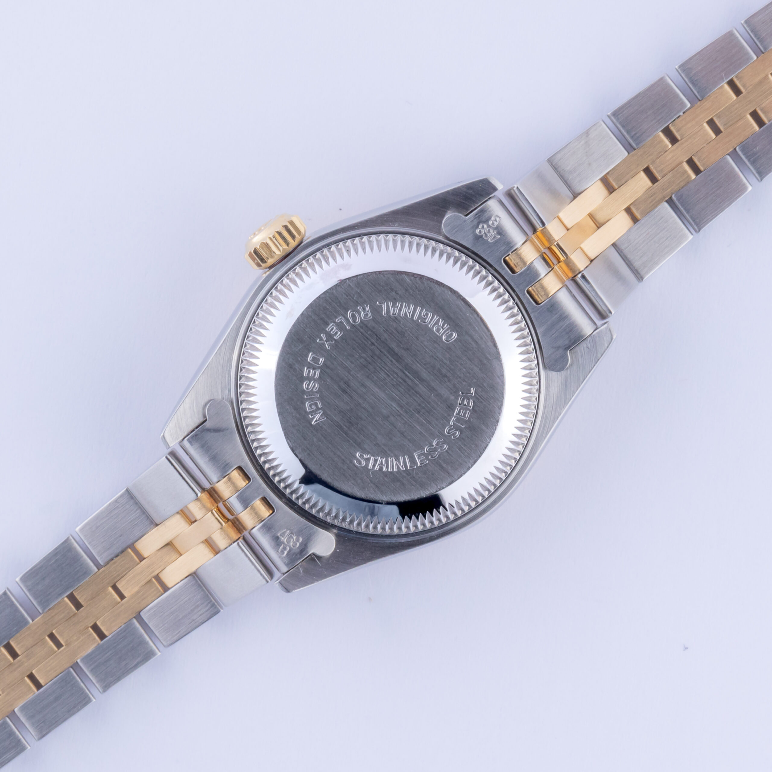 Rolex Oyster Perpetual Lady-Datejust Referenz 69173 aus dem Jahr 1993 mit komplettem Set. Die Lady-Datejust 69173 misst eine 26mm Gold und Edelstahl-Gehäuse, zwei-Ton-Jubiläum Armband und geriffelte 14k Gold Lünette. Diese Lady-Datejust 69173 verfügt über ein Automatikwerk Kaliber 2135 mit Quickset Datum Funktion, eine Kratzfestigkeit Saphirglas und ein Champagner Zifferblatt mit Tritium Zeiger.