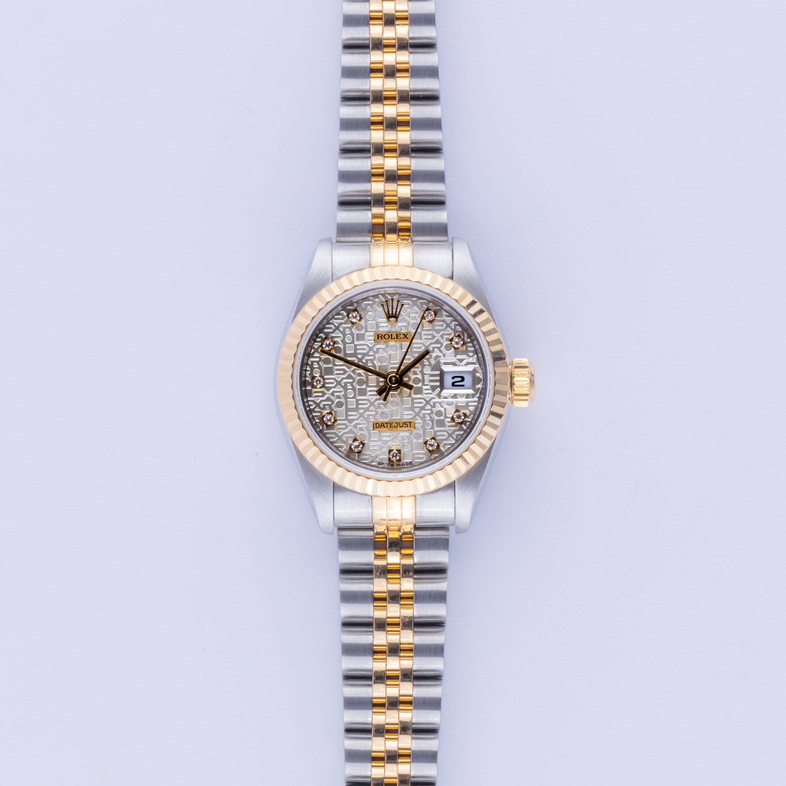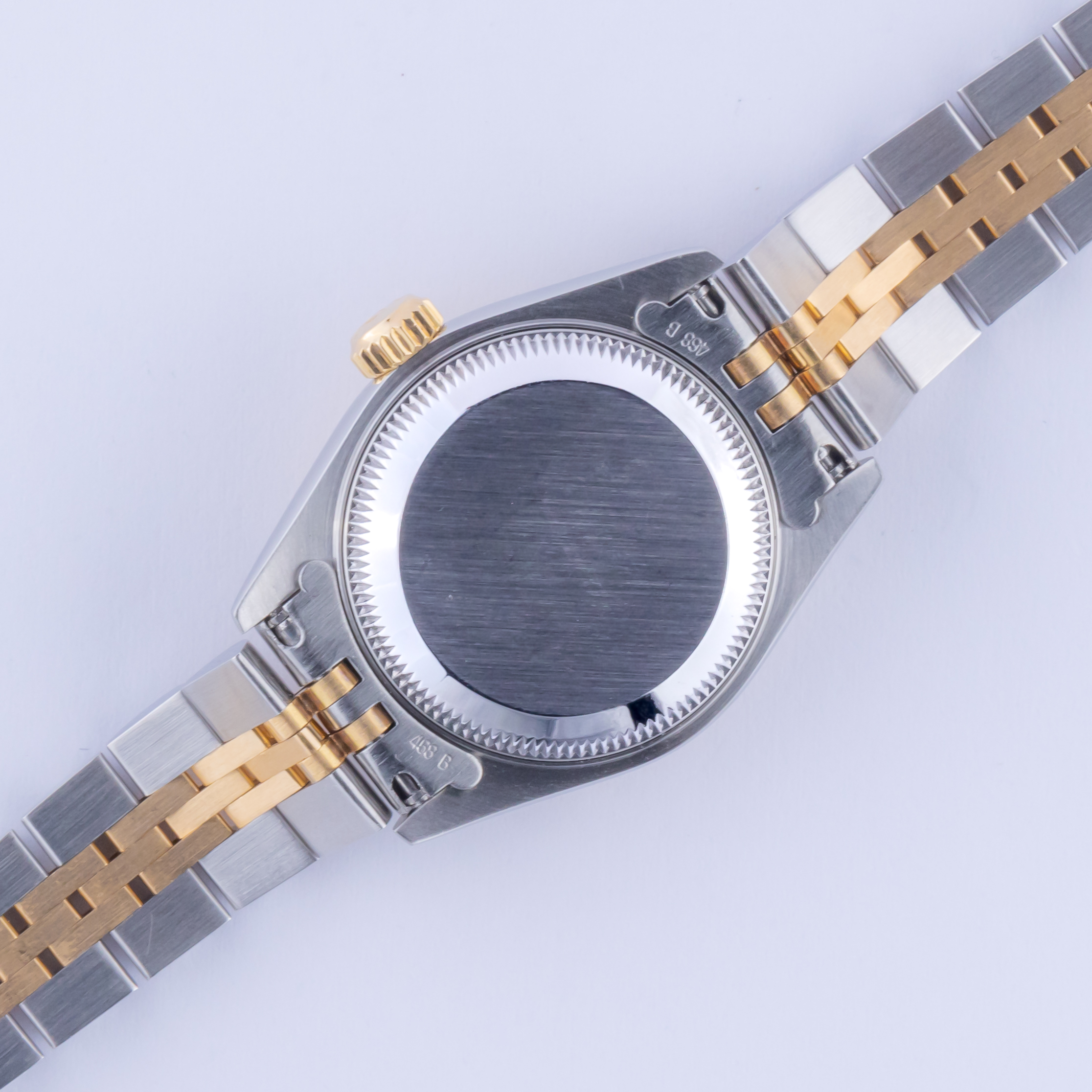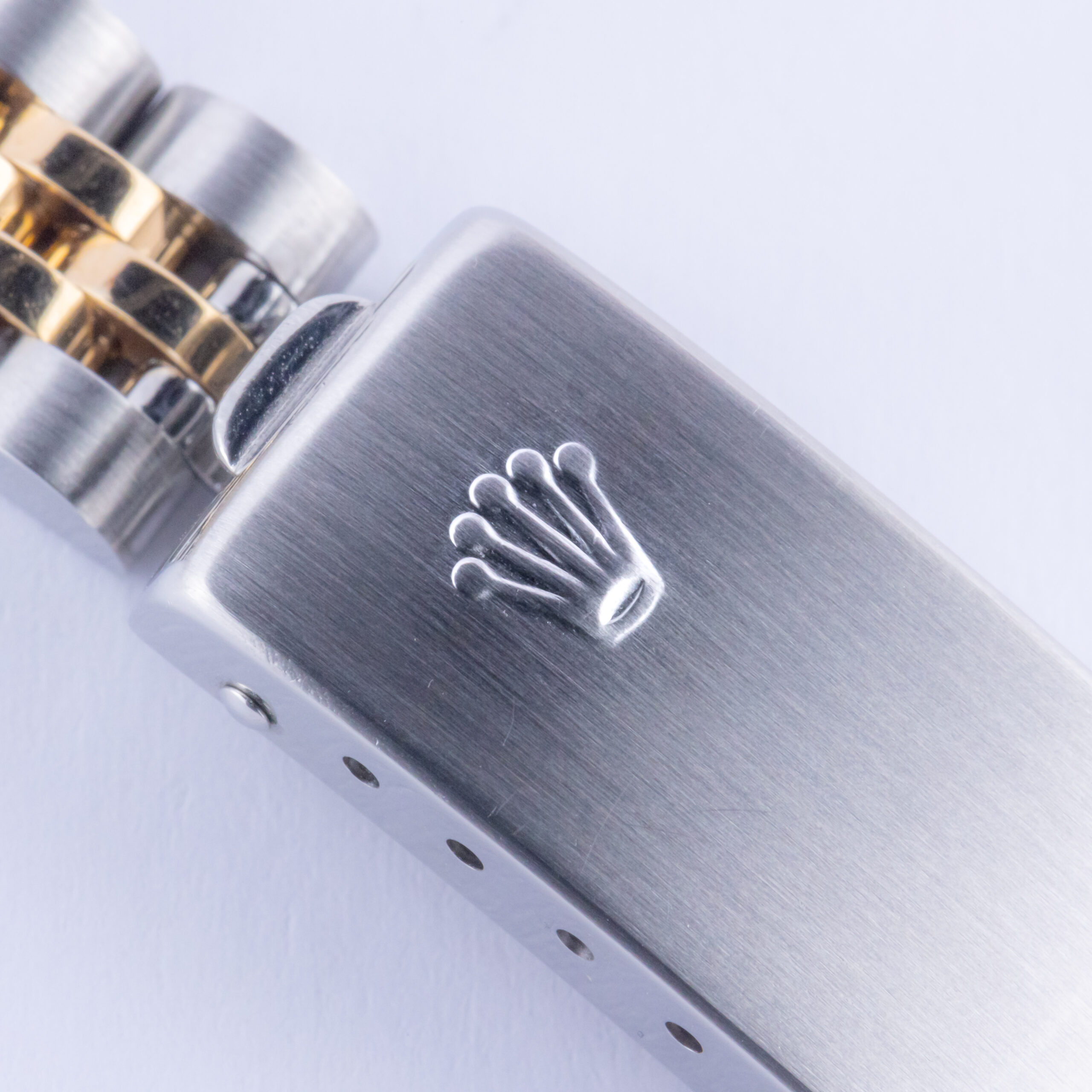 Rolex Oyster Perpetual Lady-Datejust Referenz 69173 aus dem Jahr 1996 mit komplettem Set. Die Lady-Datejust 69173 misst eine 26mm Gold und Edelstahl-Gehäuse, zwei-Ton-Jubiläum Armband und geriffelte 14k Gold Lünette. Diese Lady-Datejust 69173 verfügt über ein Automatikwerk Kaliber 2135 mit Quickset Datum Funktion, eine Kratzfestigkeit Saphirglas und ein silbernes logo Zifferblatt mit Tritium Zeiger.