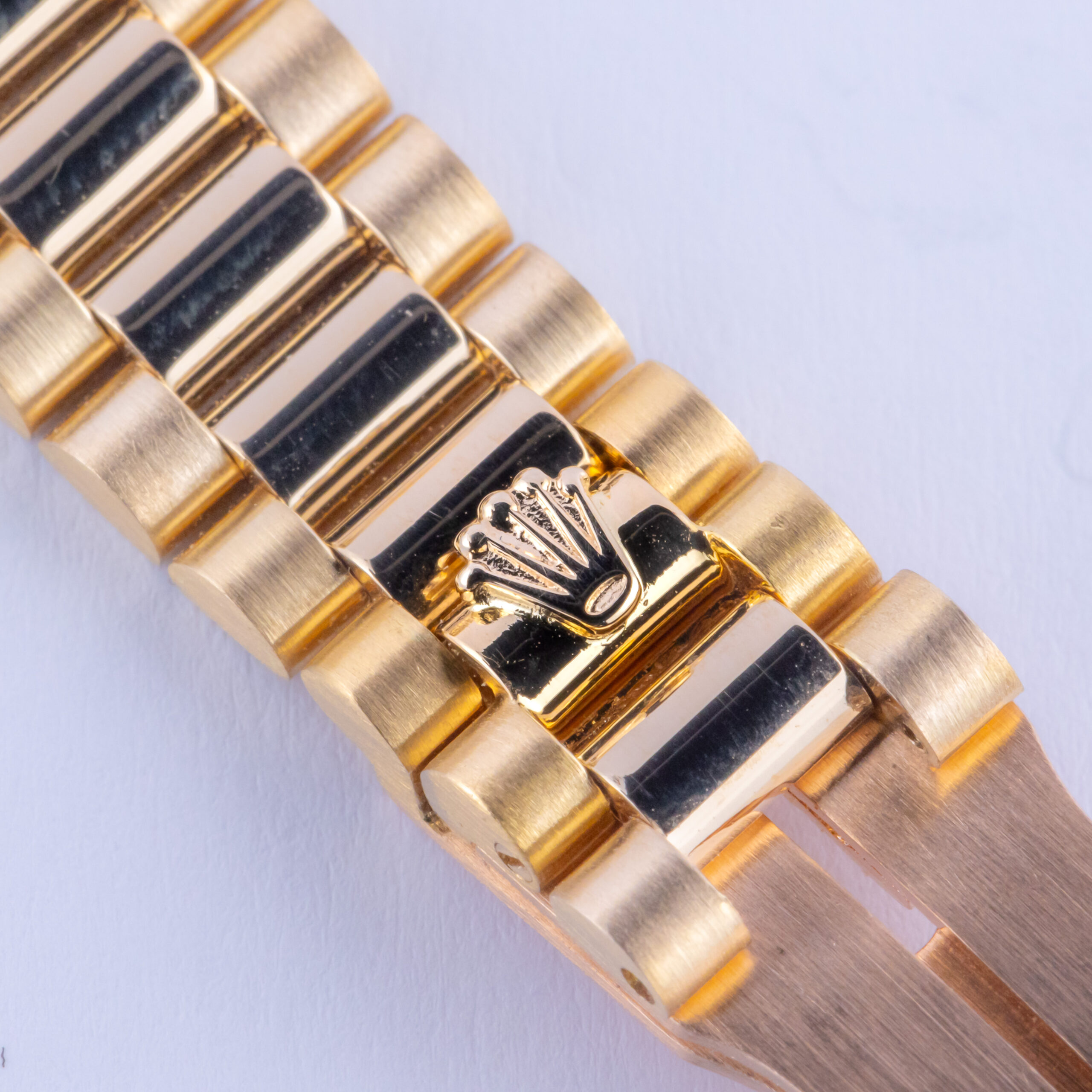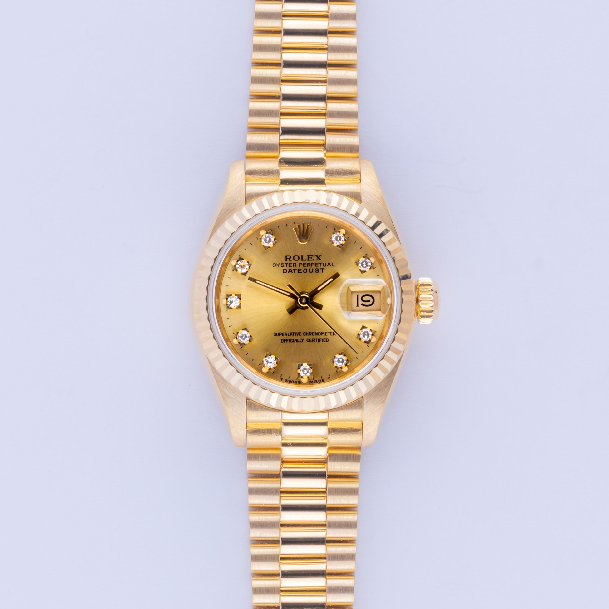 Rolex Oyster Perpetual Lady-Datejust Referenz 69178 aus dem Jahr 1990 mit komplettem Set. Die Lady-Datejust 69178 misst ein 26-mm-Goldgehäuse, ein goldenes Jubiläumsarmband und eine kannelierte Lünette aus 18 Karat Gelbgold. Diese Lady-Datejust 69178 verfügt über ein Automatikwerk Kaliber 2135 mit Quickset-Datum-Funktion, Saphirglas und ein champagnerfarbenes Zifferblatt mit Diamantmarkierungen.
