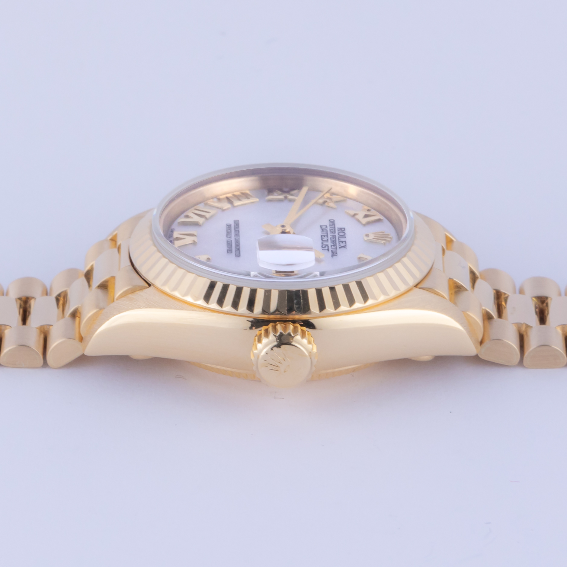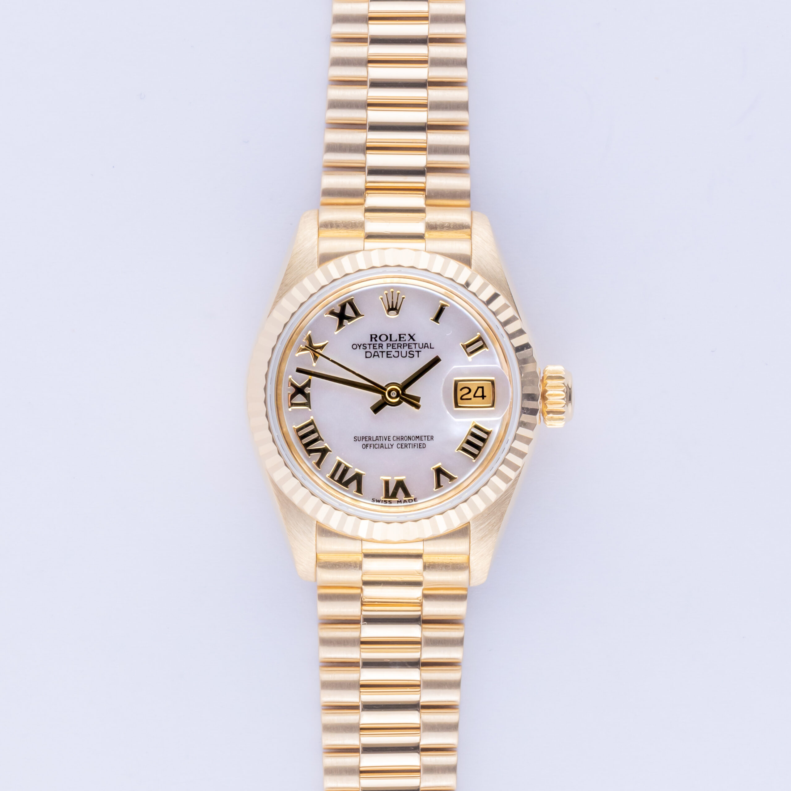 Rolex Oyster Perpetual Lady-Datejust Referenz 69178 aus dem Jahr 1996 mit komplettem Set. Die Lady-Datejust 69178 misst ein 26-mm-Goldgehäuse, ein goldenes Jubiläumsarmband und eine kannelierte Lünette aus 18 Karat Gelbgold. Diese Lady-Datejust 69178 verfügt über ein Automatikwerk Kaliber 2135 mit Quickset-Datum-Funktion, Saphirglas und ein MOP Zifferblatt mit Römische Markierungen.