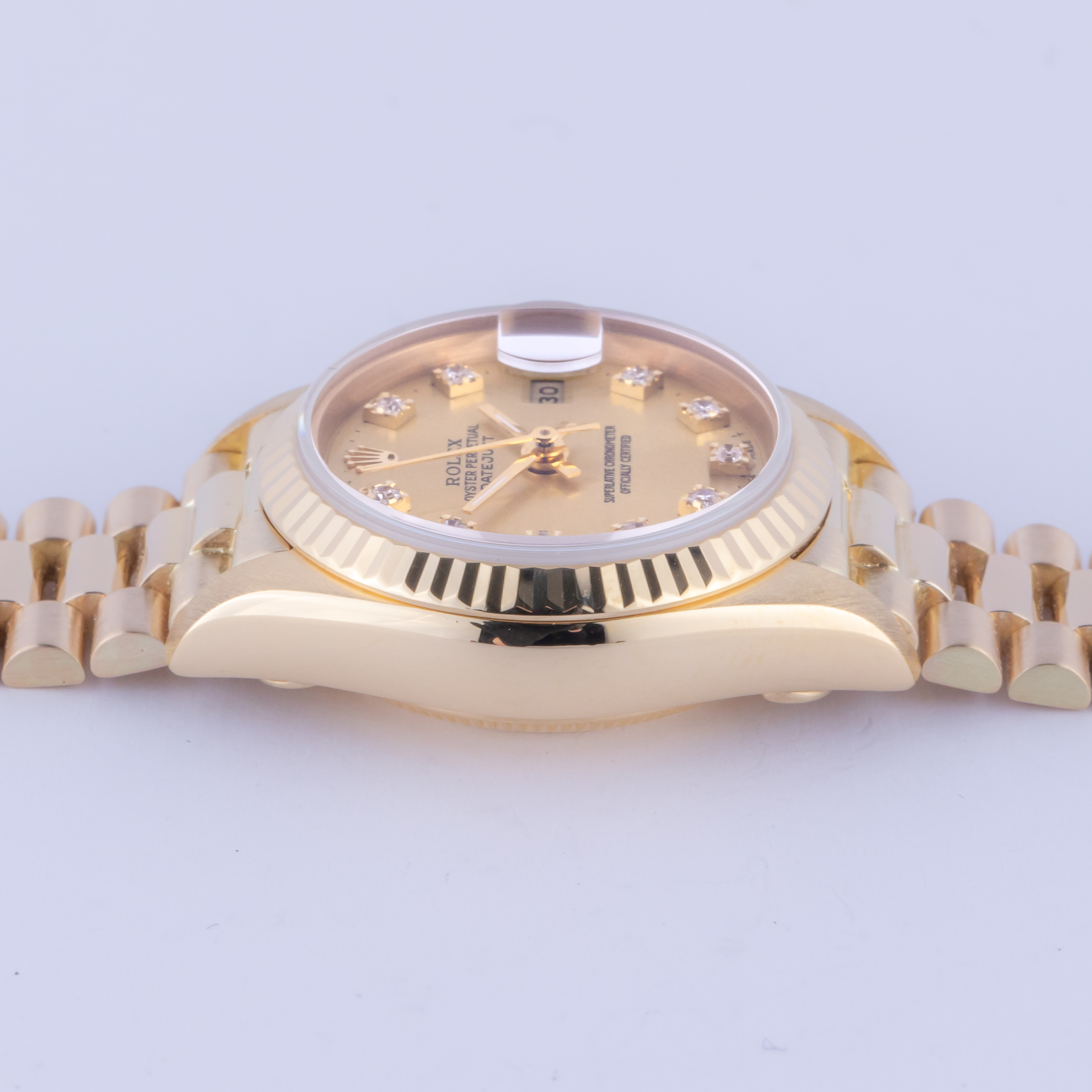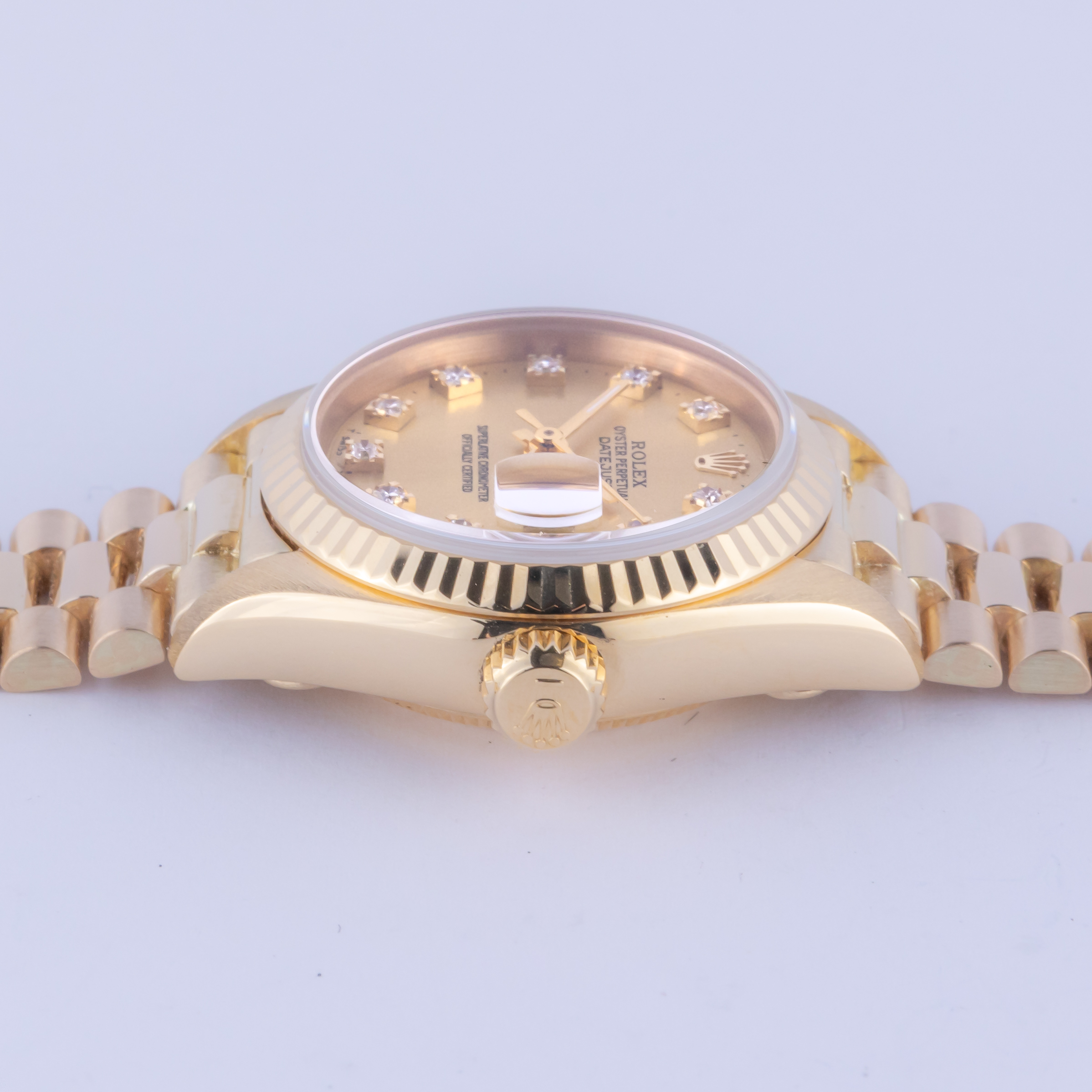 Rolex Oyster Perpetual Lady-Datejust Referenz 69178 aus dem Jahr 1993 mit komplettem Set. Die Lady-Datejust 69178 misst ein 26-mm-Goldgehäuse, ein goldenes Jubiläumsarmband und eine kannelierte Lünette aus 18 Karat Gelbgold. Diese Lady-Datejust 69178 verfügt über ein Automatikwerk Kaliber 2135 mit Quickset-Datum-Funktion, Saphirglas und ein champagnerfarbenes Zifferblatt mit Diamantmarkierungen.