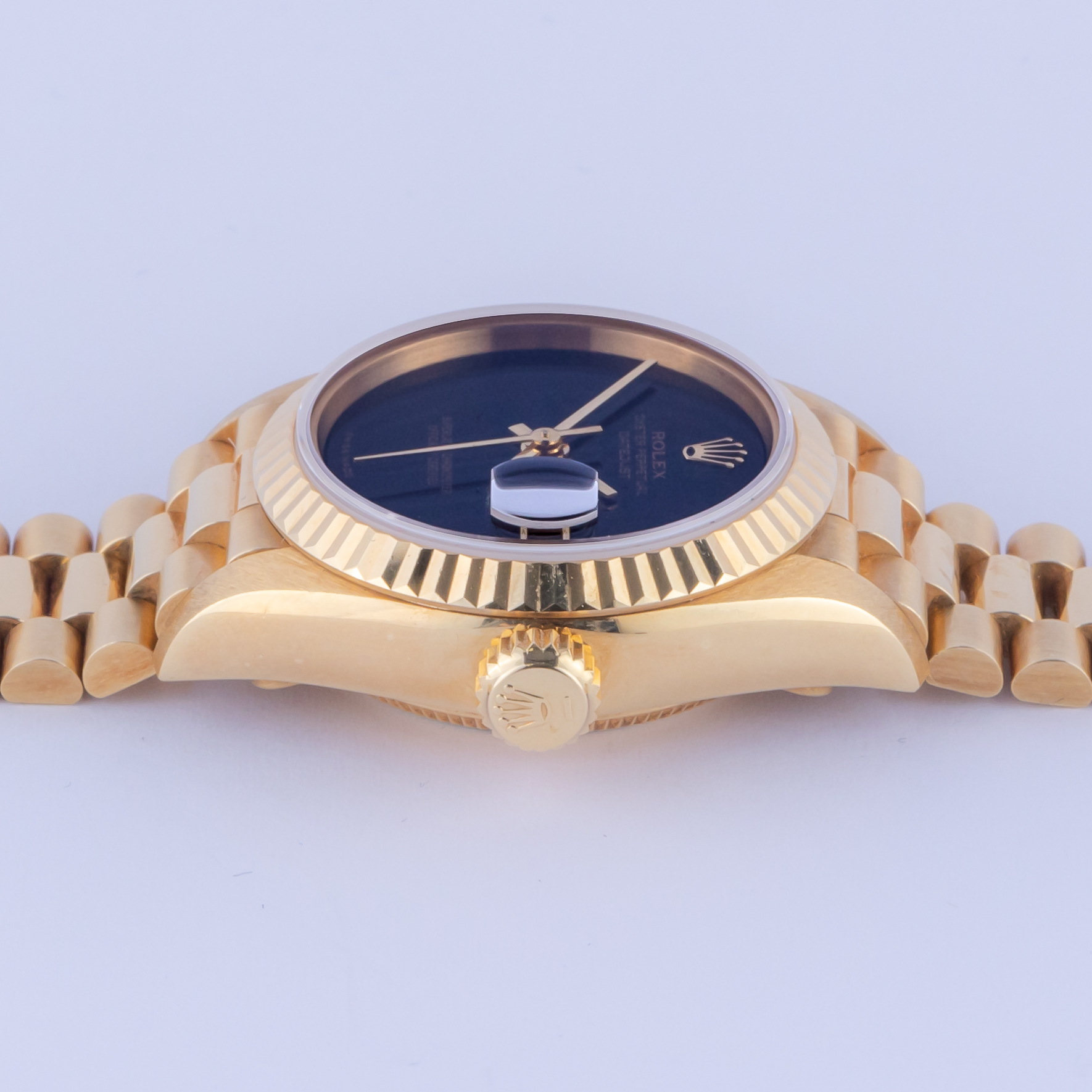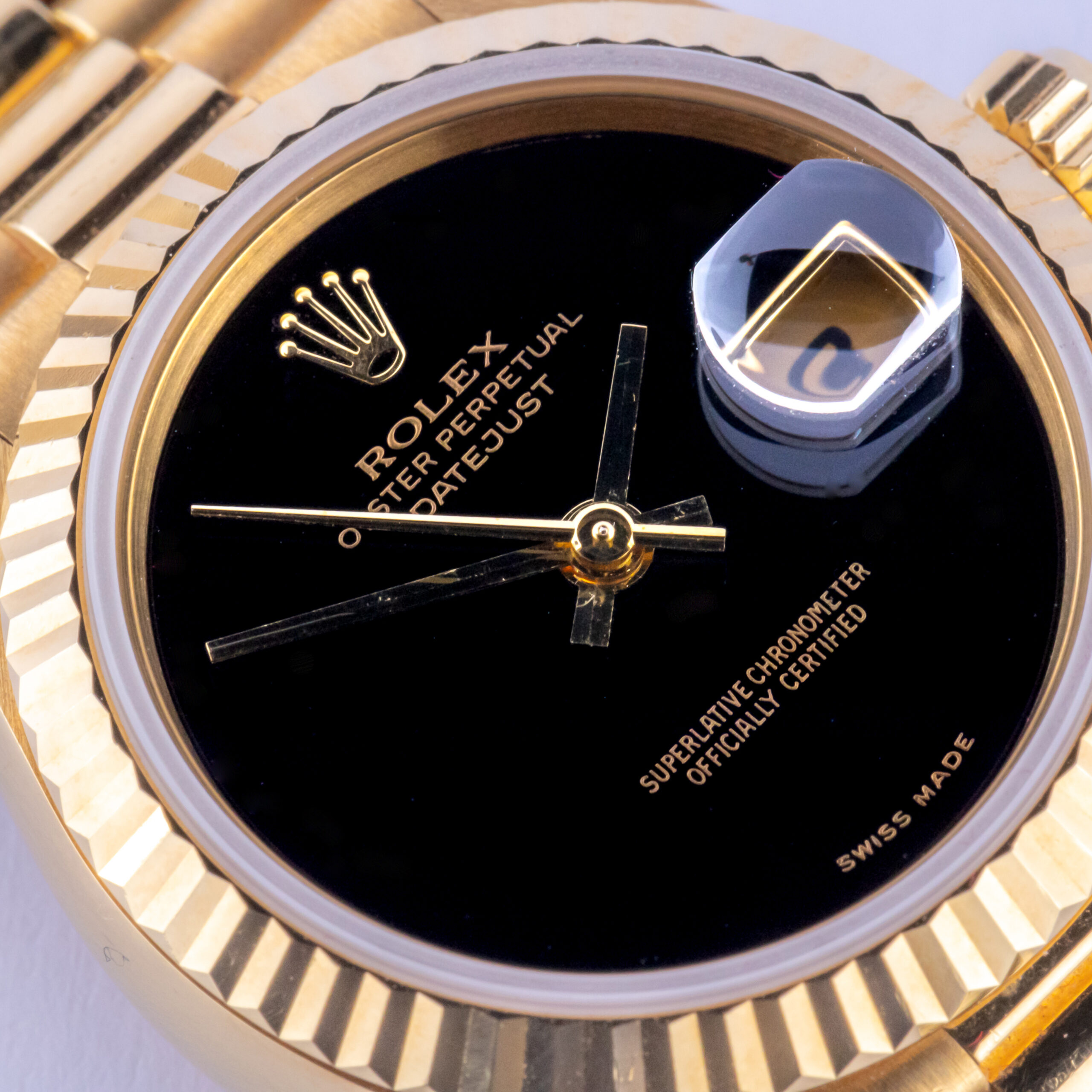 Rolex Oyster Perpetual Lady-Datejust Referenz 69178 aus dem Jahr 1990 mit komplettem Set. Die Lady-Datejust 69178 misst ein 26-mm-Goldgehäuse, ein goldenes Jubiläumsarmband und eine kannelierte Lünette aus 18 Karat Gelbgold. Diese Lady-Datejust 69178 verfügt über ein Automatikwerk Kaliber 2135 mit Quickset-Datum-Funktion, Saphirglas und ein Onyx Zifferblatt.