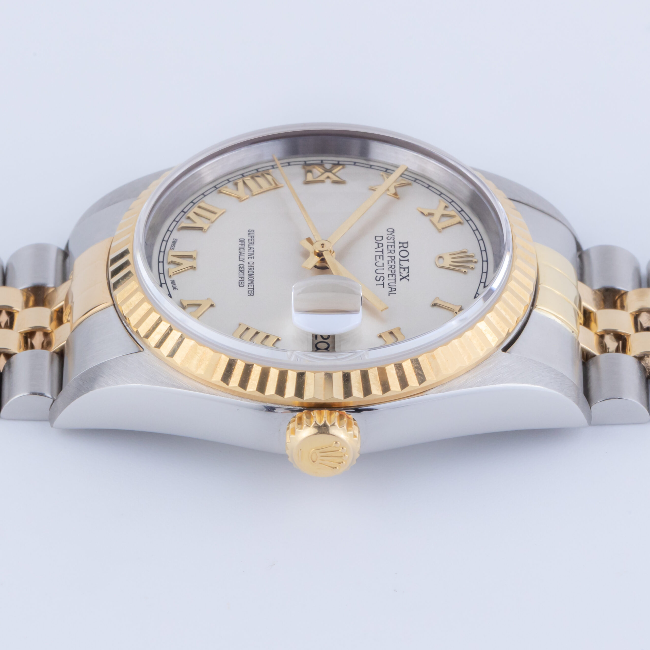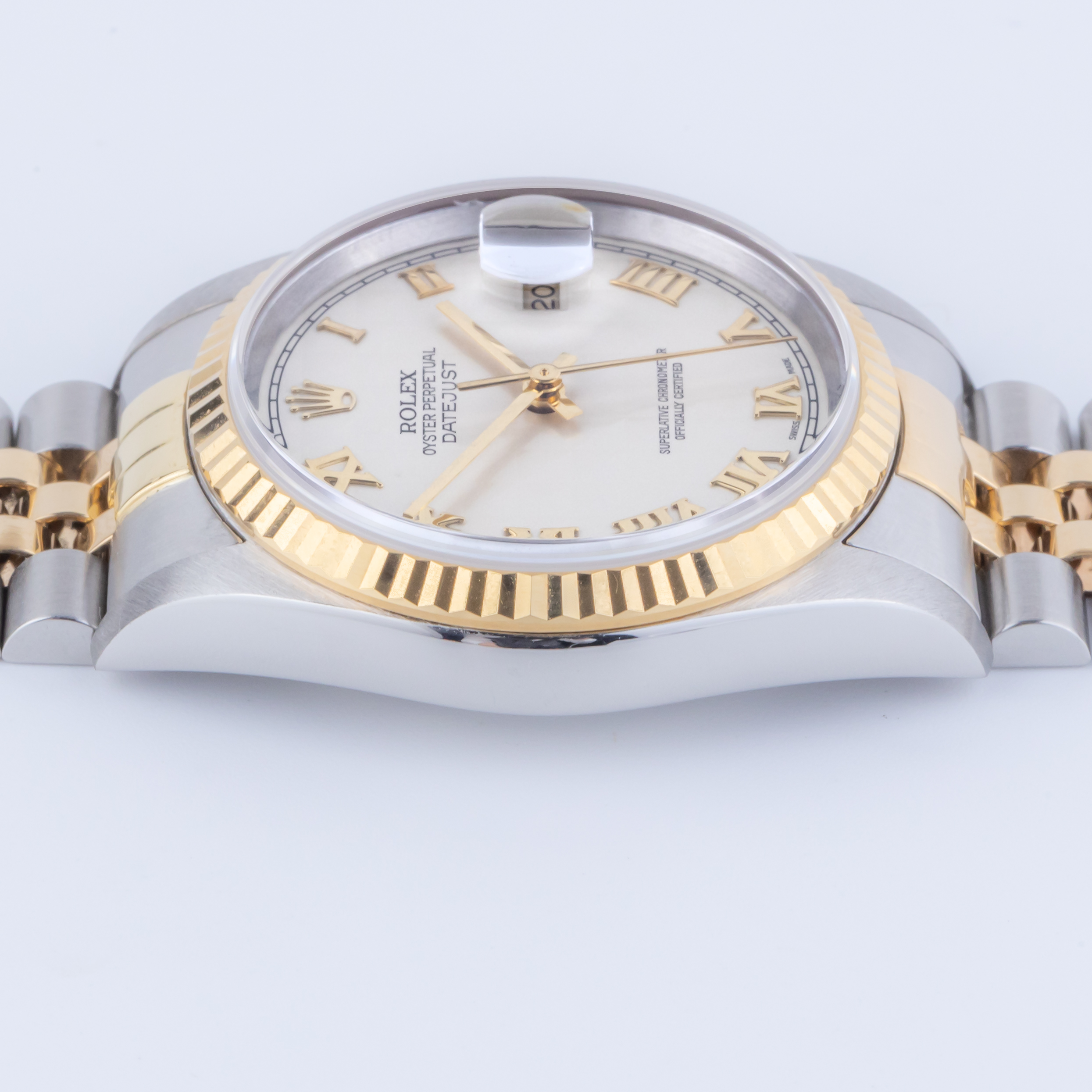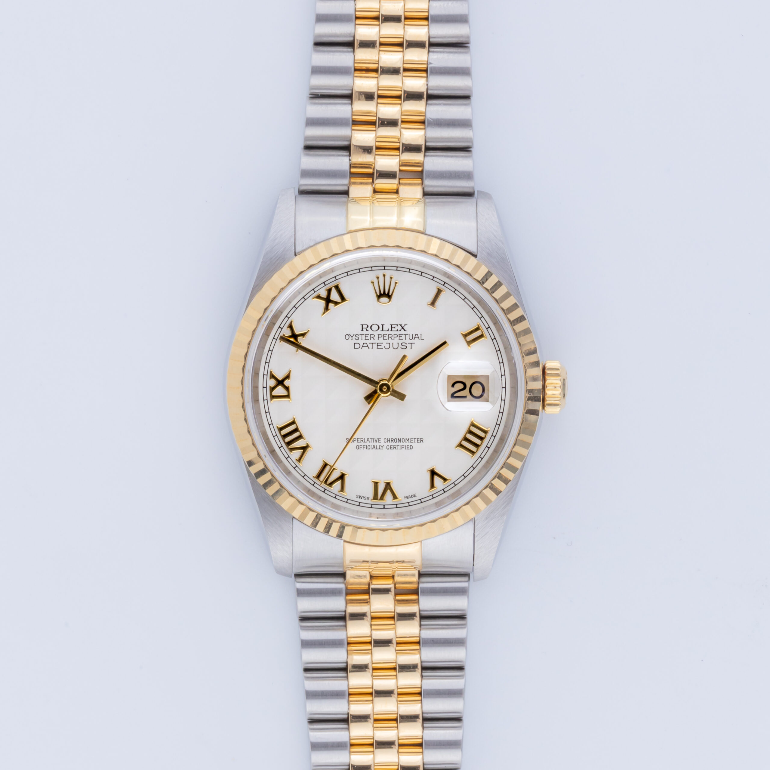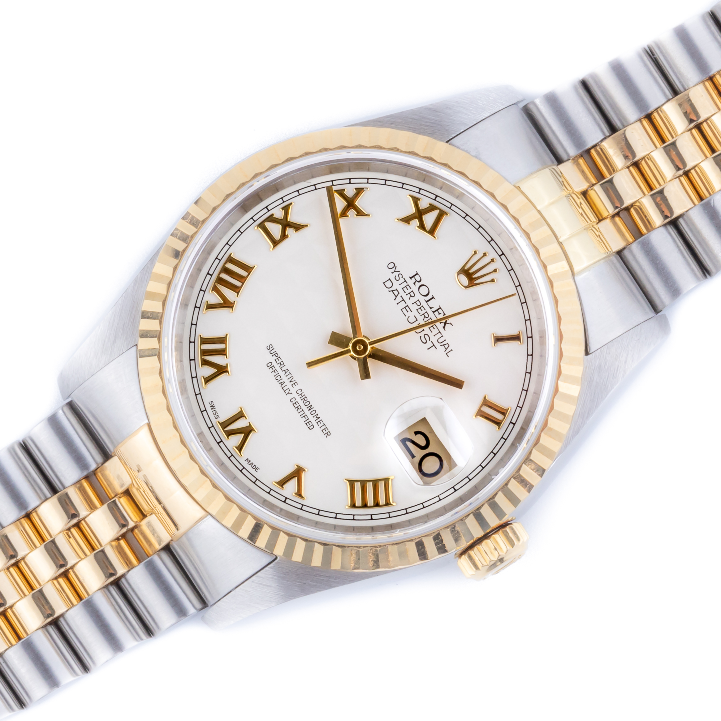 Rolex Oyster Perpetual Datejust Referenz 16233 aus dem Jahr 2002. Die Datejust 16233 misst ein 36-mm-Gehäuse aus Gold und Edelstahl, ein zweifarbiges Jubilee-Armband und eine kannelierte 18-karätige Goldlünette. Diese Datejust 16233 verfügt über ein automatisches Uhrwerk Kaliber 3135 mit Schnellverstellung des Datums, ein kratzfestes Saphirglas und ein weißes Pyramidenzifferblatt mit römischen Indexen.