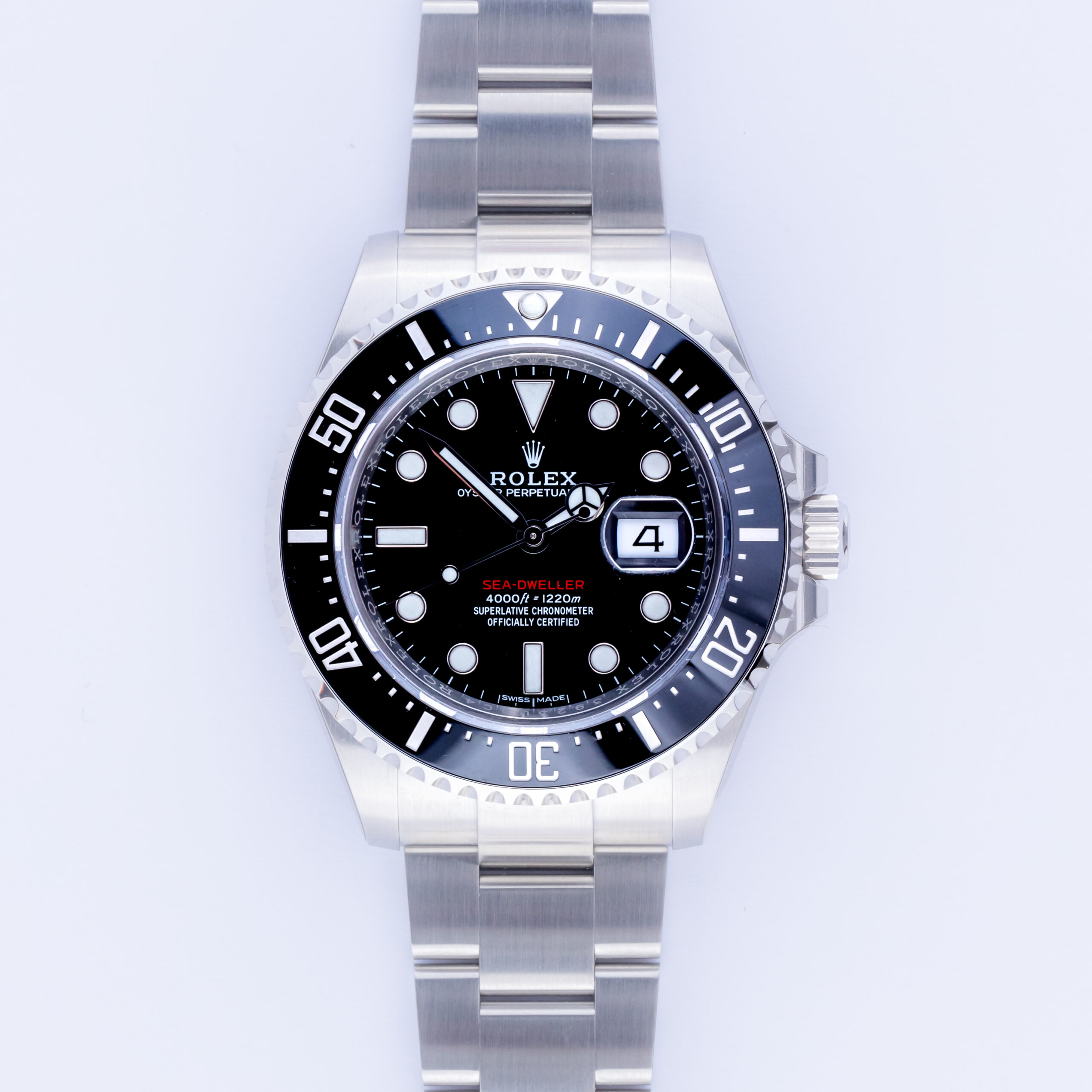 Rolex Sea-Dweller Reference 126600 aus dem Jahr 2018 inklusive Komplettset. Die Sea-Dweller Reference 126600 misst ein 43 mm großes Edelstahlgehäuse mit Heliumauslassventil, ein Edelstahl-Oysterbracelet mit Glidelock und schwarzer drehbarer Lünette. Die Sea-Dweller 126600 verfügt über ein Automatikwerk Kaliber 3235 mit Quickset-Datumsfunktion, ein kratzfestes Saphirglas und ein schwarzes Zifferblatt mit Chromalight-Anzeige.