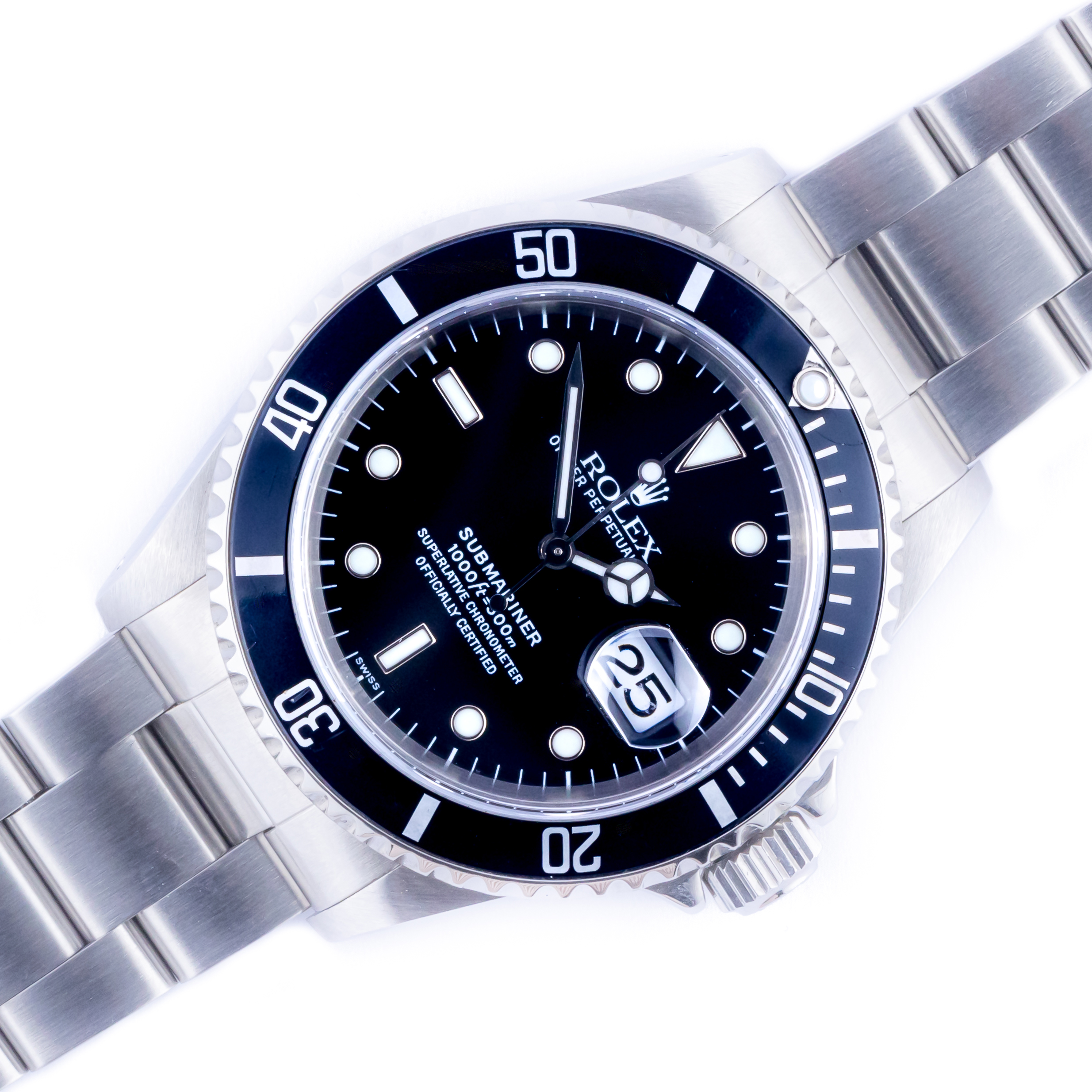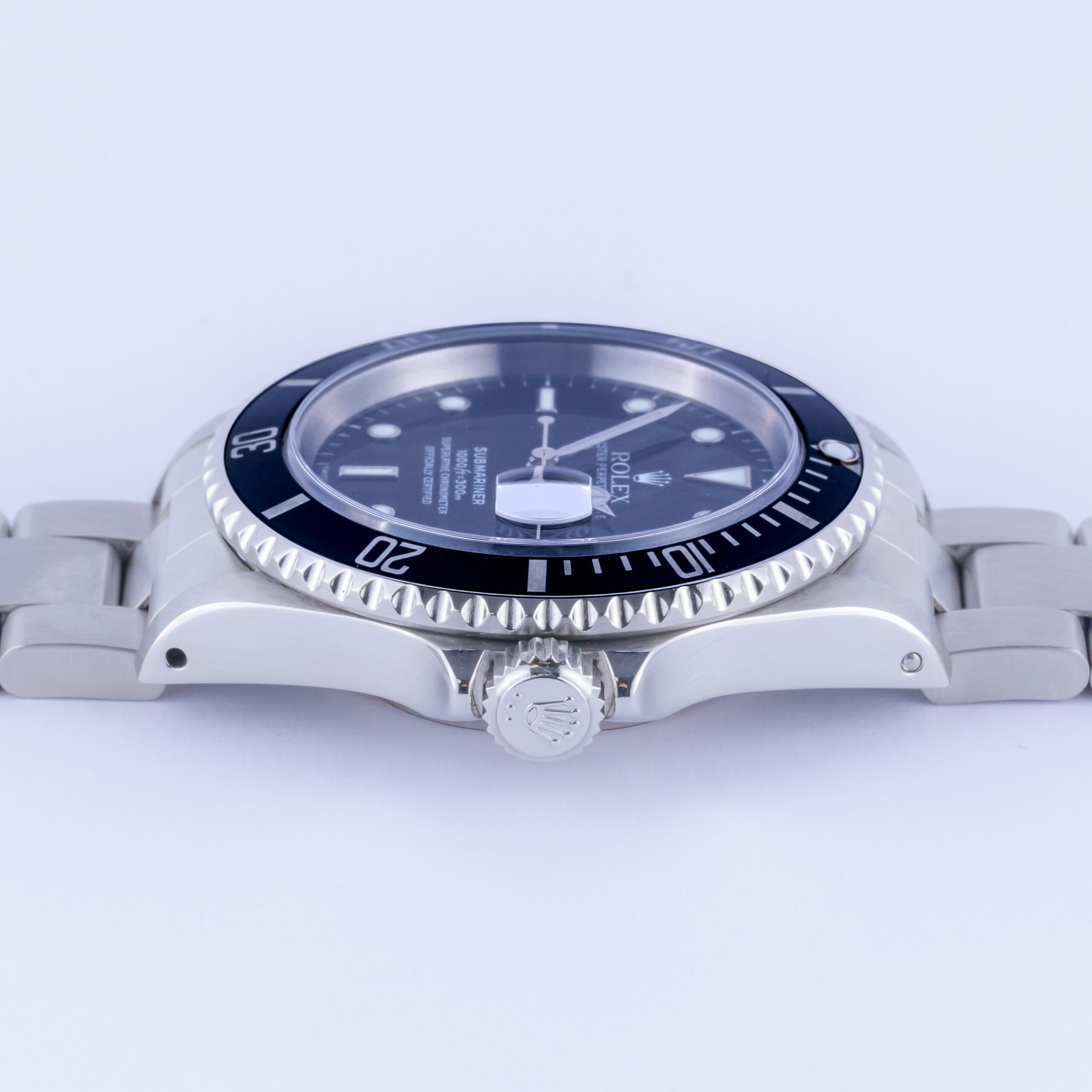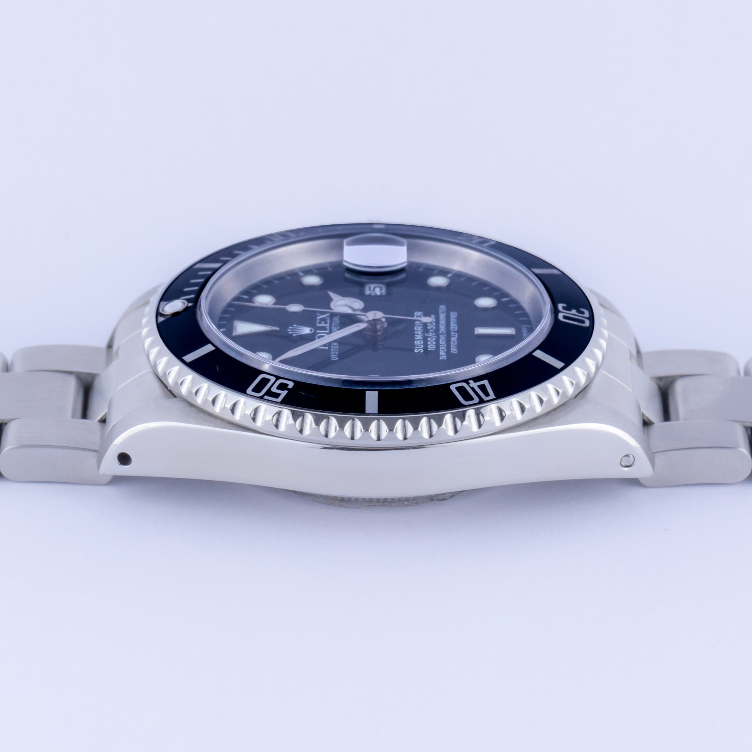 Rolex Oyster Perpetual Submariner Date Reference 16610 aus dem Jahr 1998 mit komplettem Set. Die Submariner 16610 misst ein 40mm Edelstahlgehäuse, ein Edelstahl-Oyster-Armband mit Fliplock-Schließe und schwarzer drehbarer Lünette. Die Submariner 16610 verfügt über ein Automatikkaliber 3135 mit Schnellverstellung des Datums, ein kratzfestes Saphirglas und ein schwarzes Zifferblatt mit tritium-Zeigern und -Indizes.