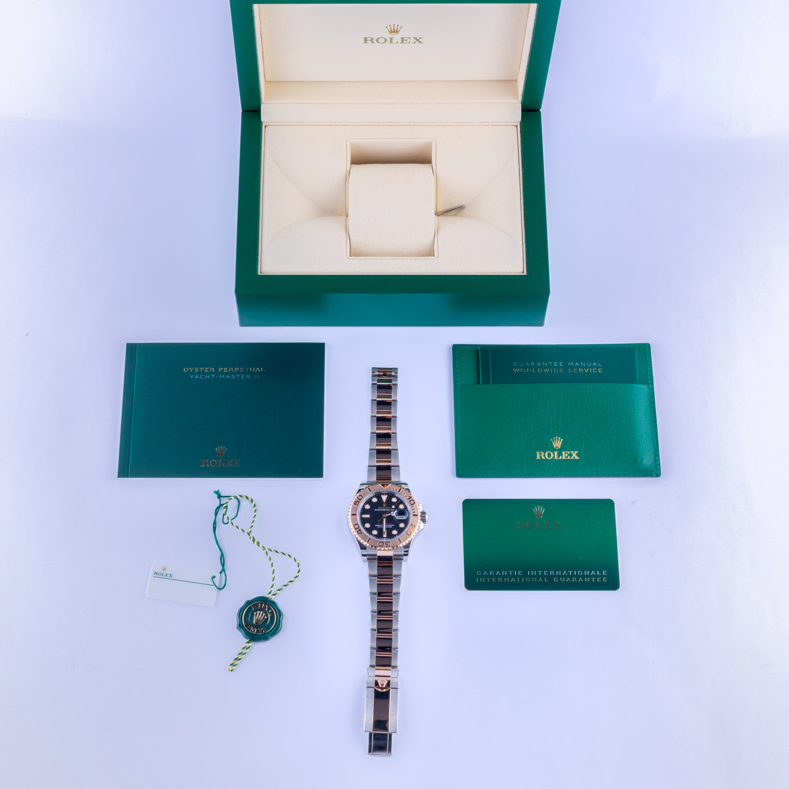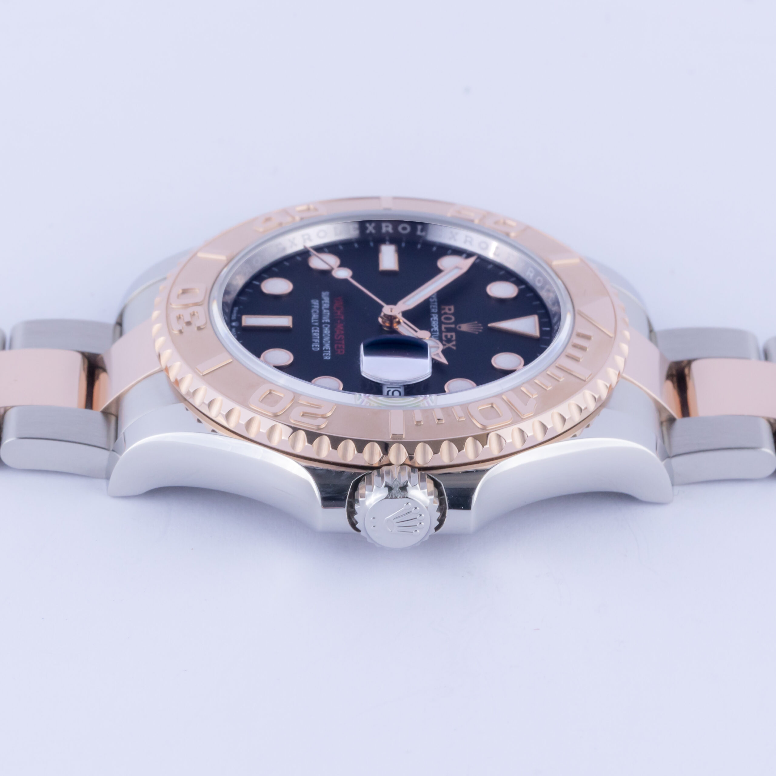 Rolex Oyster Perpetual Yacht-Master Referenz 126621 aus dem Jahr 2023 mit komplettem Set. Die Yacht-Master 126621 hat ein 40-mm-Gehäuse aus Gold/Edelstahl, ein Oyster-Armband aus Edelstahl/Rosegold mit Oysterlock-Schließe und eine bidirektionale Lünette aus Rosegold. Die Yacht-Master 126621 verfügt über ein Automatikwerk Kaliber 3235 mit Schnellverstellung des Datums, ein kratzfestes Saphirglas und ein schwarzes Zifferblatt mit Chromalight-Anzeige.