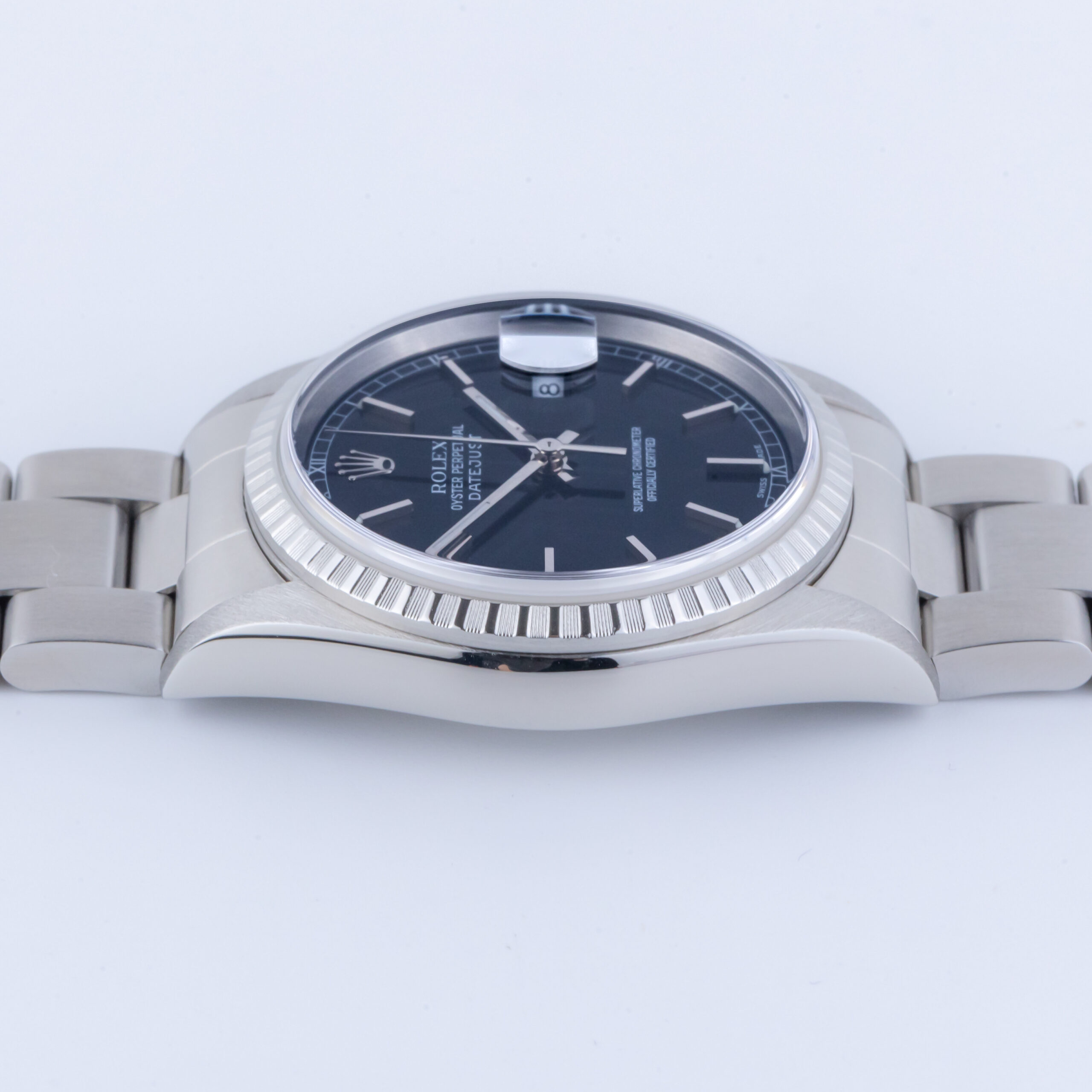 Die Rolex Datejust 16220 ist mit dem berühmten Automatikwerk Kaliber 3135 von Rolex ausgestattet und verfügt über die innovative und seiner Zeit vorausschauende Quickset-Funktion für den sofortigen Datumswechsel. Ändern Sie einfach das Datum, indem Sie die Krone herausziehen und eineinhalb Mal gegen den Uhrzeigersinn drehen, anstatt die Zeiger 24 Stunden lang aufzuziehen. Das Uhrwerk 3135 arbeitet mit 28.800 Halbschwingungen pro Stunde, was eine zuverlässige Gangreserve von 48 Stunden ermöglicht und dieses Modell zu einem Muss für jeden Rolex Fan und Sammler macht.