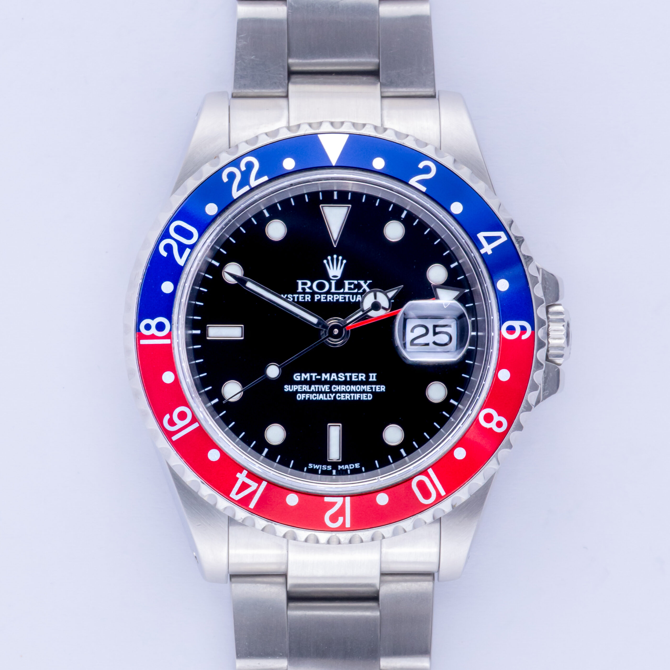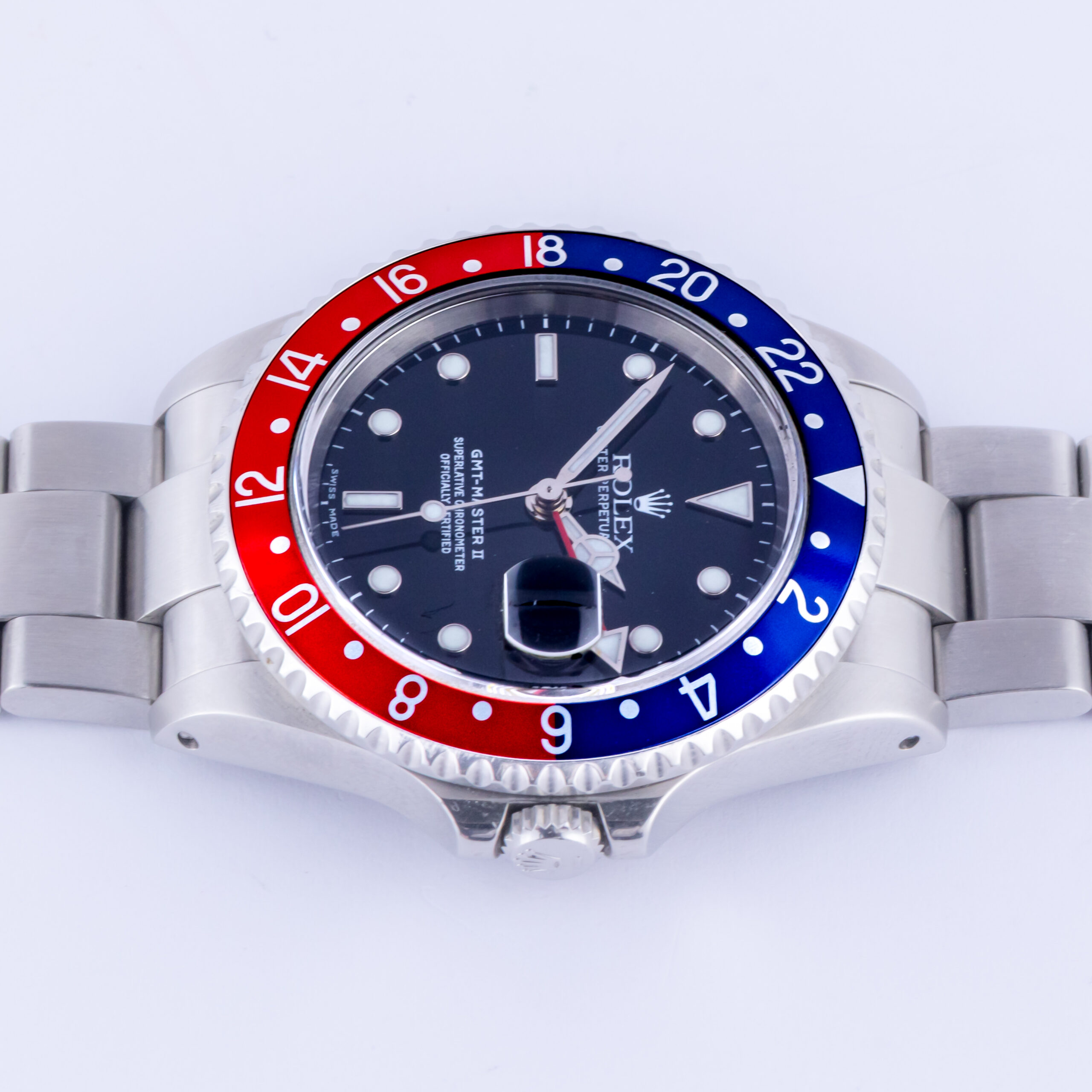 Rolex Oyster Perpetual GMT-Master II referentie 16710 uit 2000. De GMT-Master II 16710 bevat een 40mm stalen kast, een stalen Oyster band met fliplock sluiting en verdraaibare bezel met Pepsi insert. De GMT-Master II 16710 bevat een automatisch uurwerk kaliber 3185 met een quickset datumfunctie, een krasvrij saffierglas en zwarte wijzerplaat en tritium wijzers. Dit horloge wordt met de originele doos, papieren, handleiding boekjes geleverd.