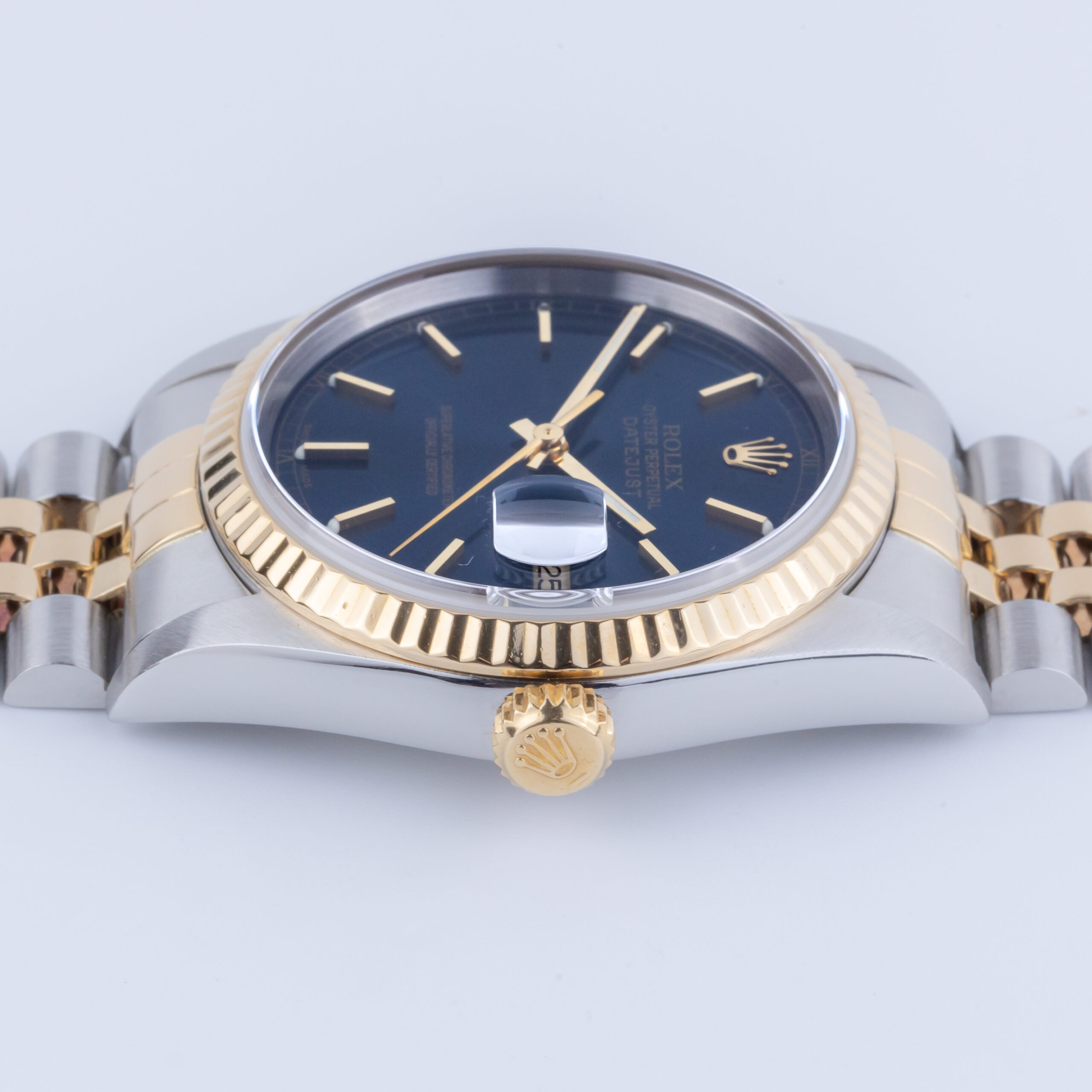 Lees meer...De Rolex Datejust 16233 die wij aanbieden komt uit 1999 en loopt op het automatische 3135 uurwerk van Rolex. Dit zeer betrouwbare uurwerk zit in een robuuste 36mm oystercase met de kenmerkende 18kt geelgouden fluted bezel. Daarnaast heeft dit horloge een prachtige blauwe wijzerplaat met eenvoudige minute track. De geweldige afwerking van de wijzerplaat is iets waar de Datejust bekend om staat. De two-tone jubilee band is voorzien van de sterke vouwsluiting met kenmerkende Rolex kroon.