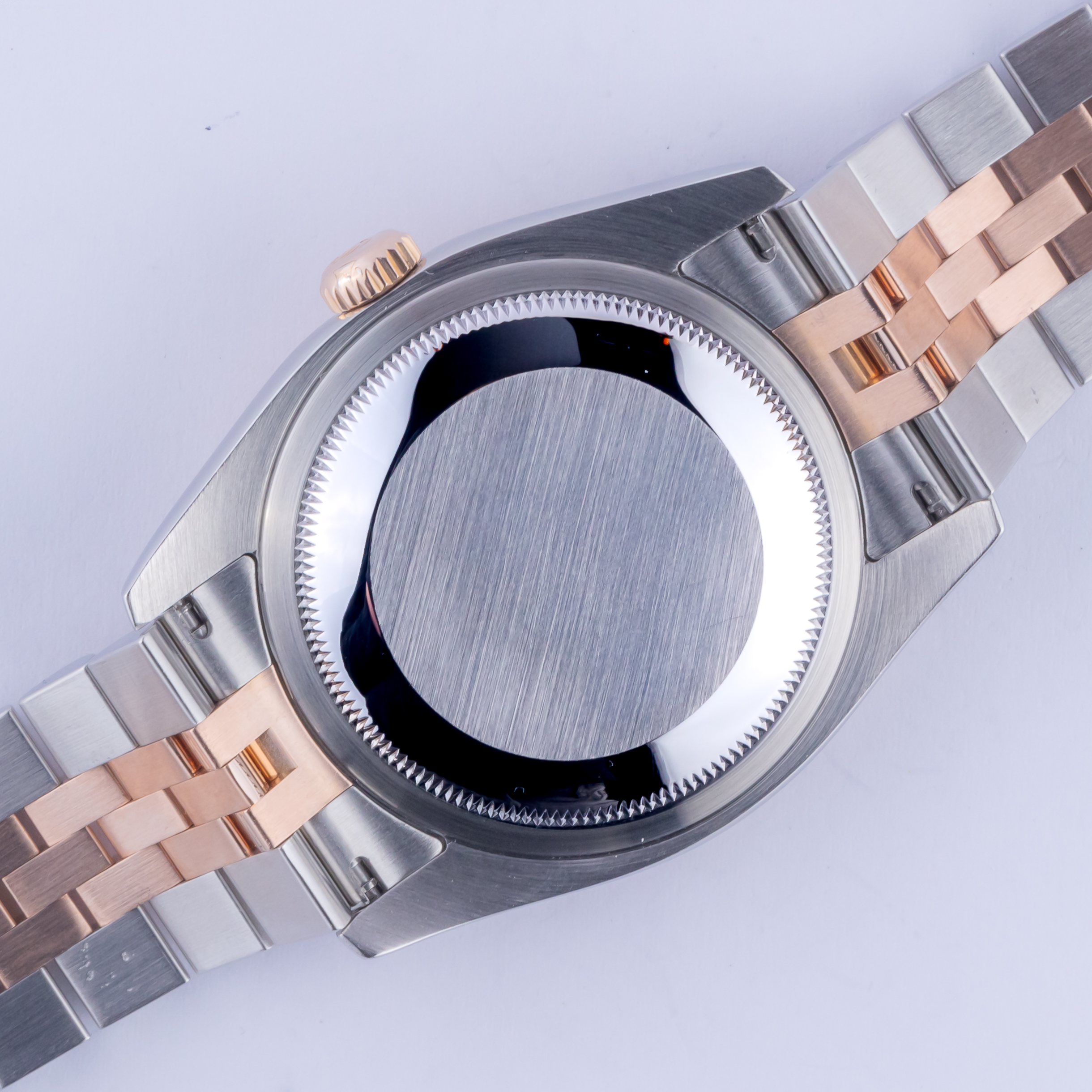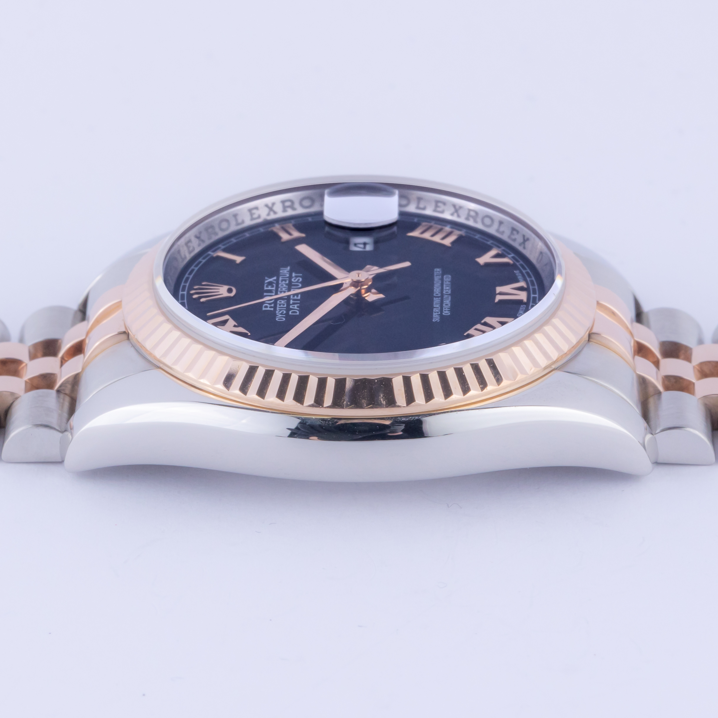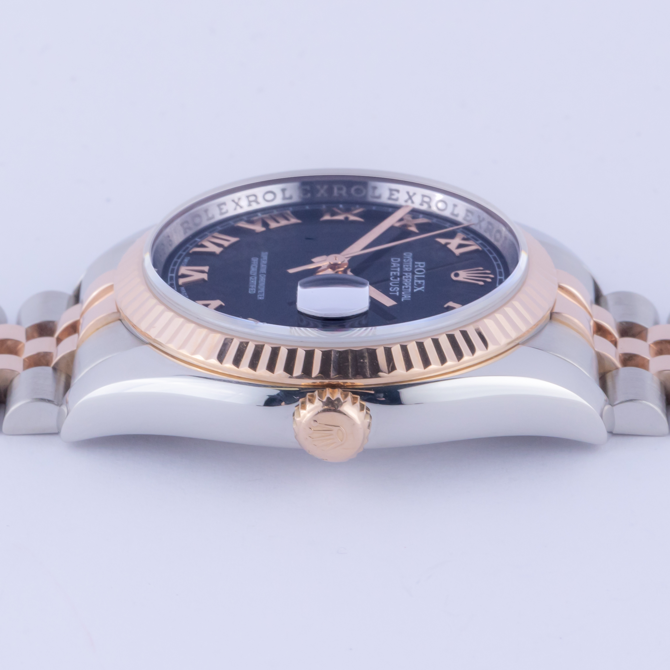 Rolex Oyster Perpetual Datejust reference 116231 from 2005 including full set. The Datejust 116233 measures a 36mm rose gold and stainless steel case, a two-tone Jubilee bracelet with crownclasp and fluted 18k rose gold bezel. This Datejust 116231 features an automatic movement caliber 3135 with quickset date function, a scratch resistance sapphire crystal and a black colored dial with Roman markers.