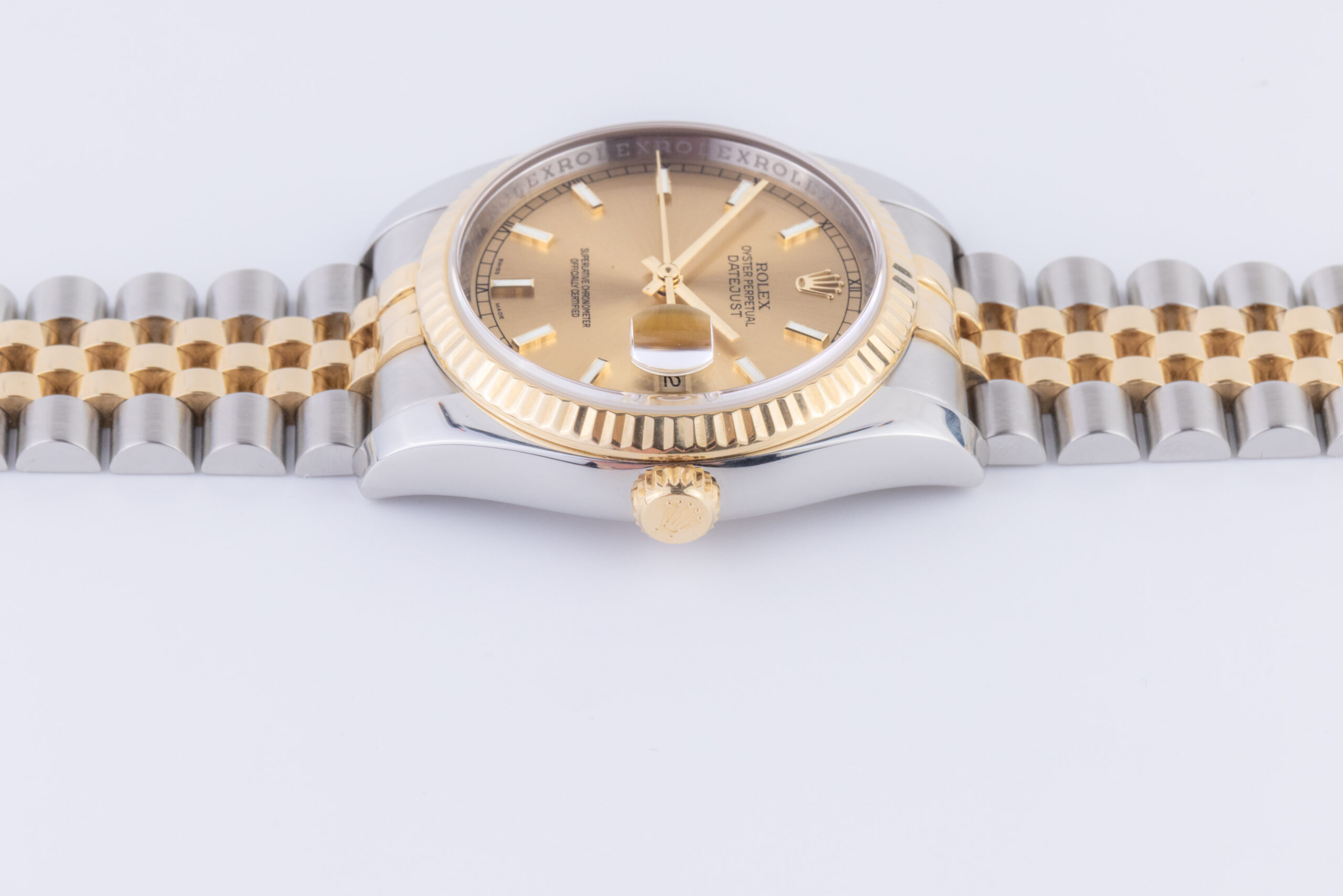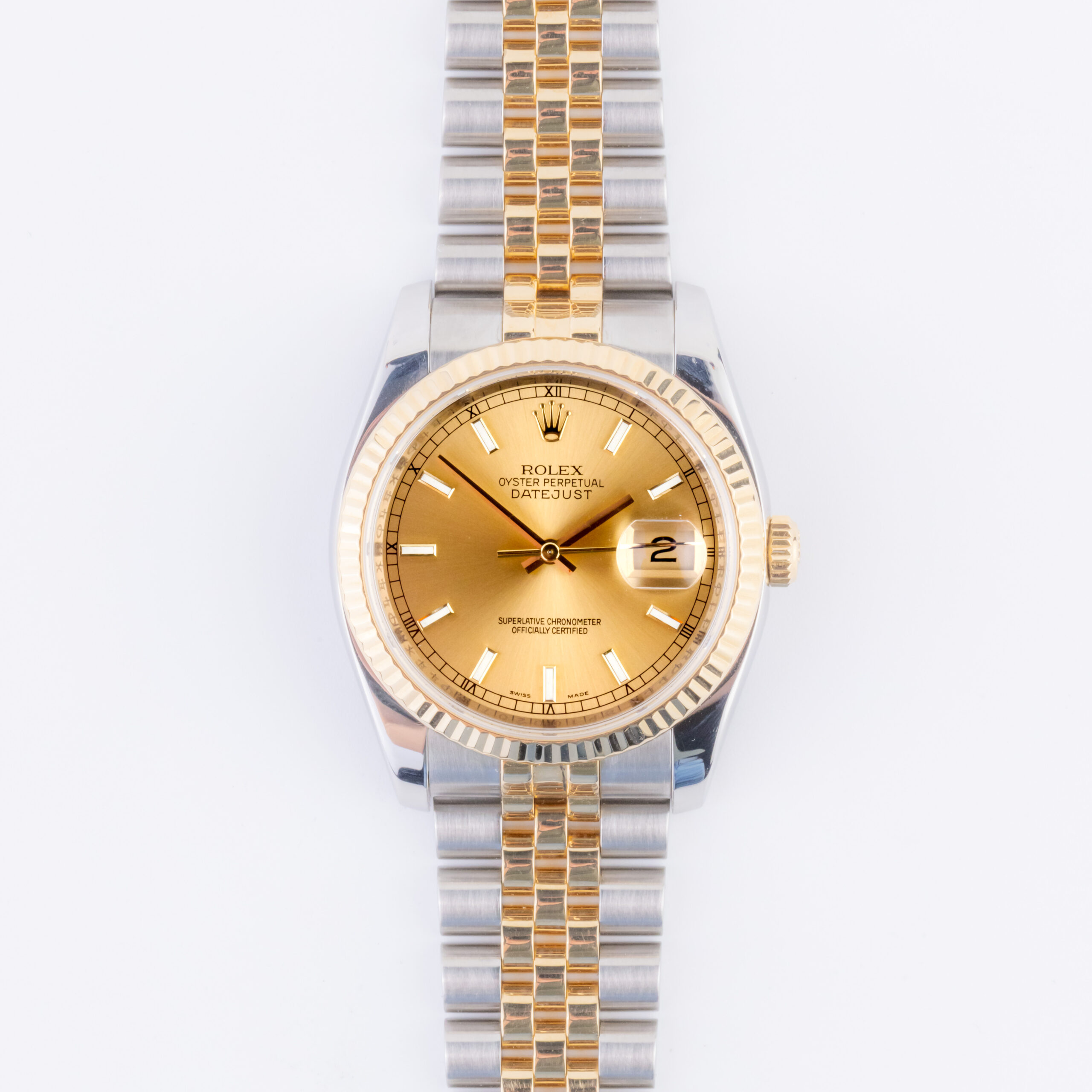 Rolex Oyster Perpetual Datejust reference 116233 from 2013 including full set. The Datejust 116233 measures a 36mm gold and stainless steel case, a two-tone Jubilee bracelet with crownclasp and fluted 18k gold bezel. This Datejust 116233 features an automatic movement caliber 3135 with quickset date function, a scratch resistance sapphire crystal and a champagne dial.