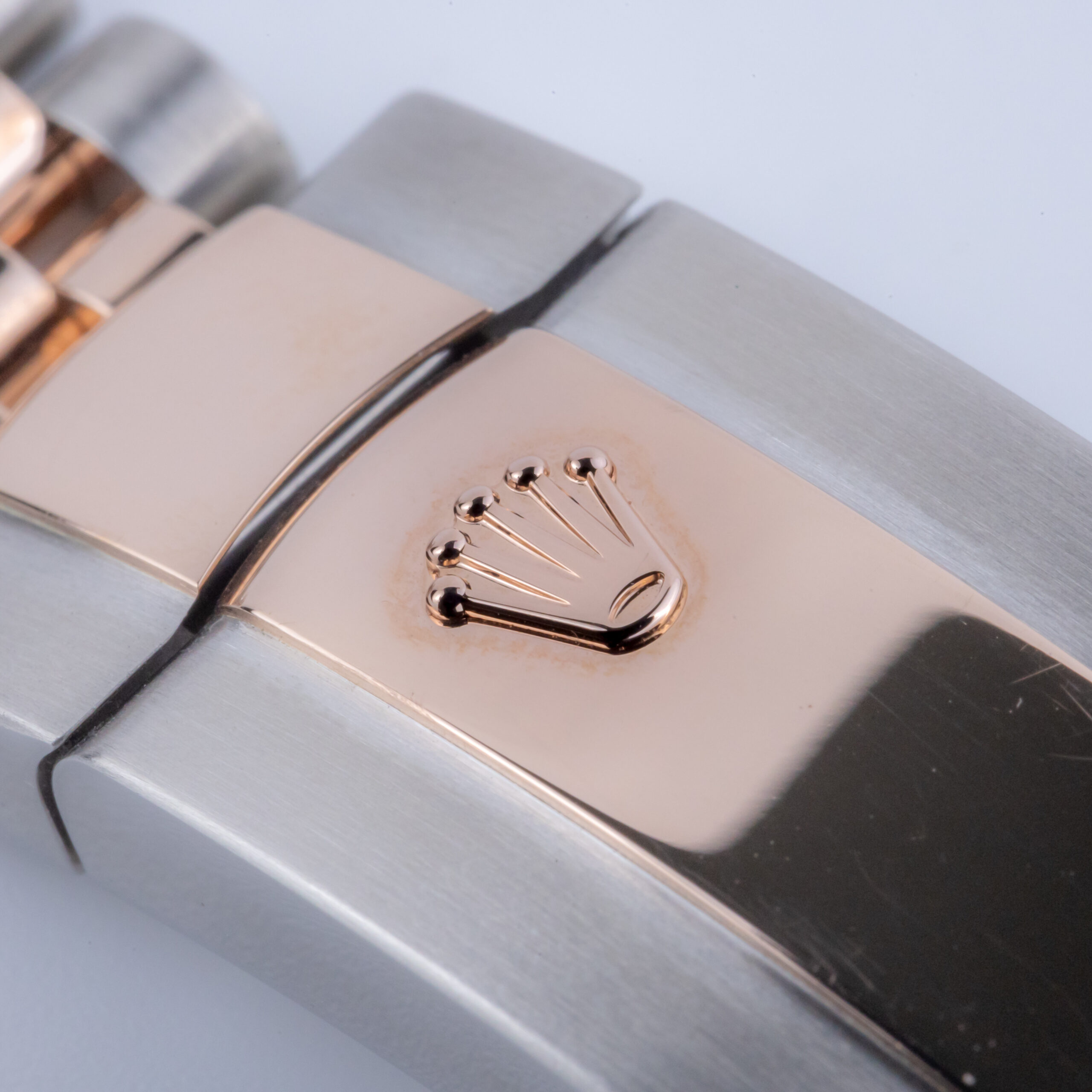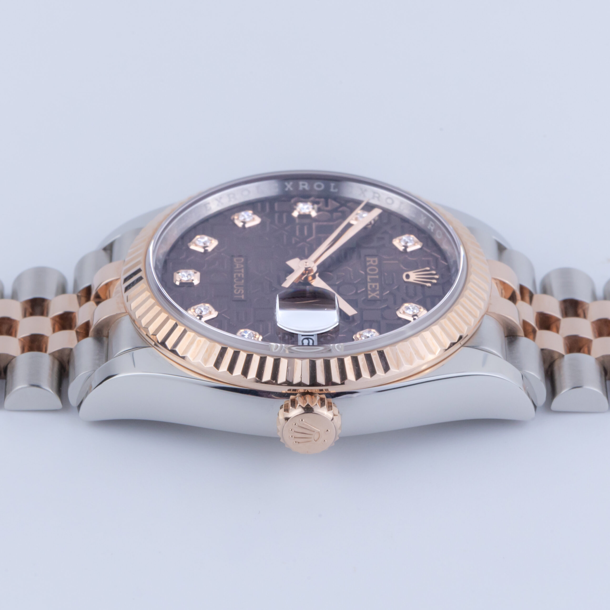 Rolex Oyster Perpetual Datejust reference 126231 from 2021 including full set. The Datejust 126231 measures a 36mm stainless steel case, a rosegold/stainless steel Jubilee bracelet with Oysterclasp and a rosegold fluted bezel. This Datejust 126231 features an automatic movement caliber 3235 with quickset date function, scratch resistance sapphire crystal and a chocolate logo dial with diamond markers.